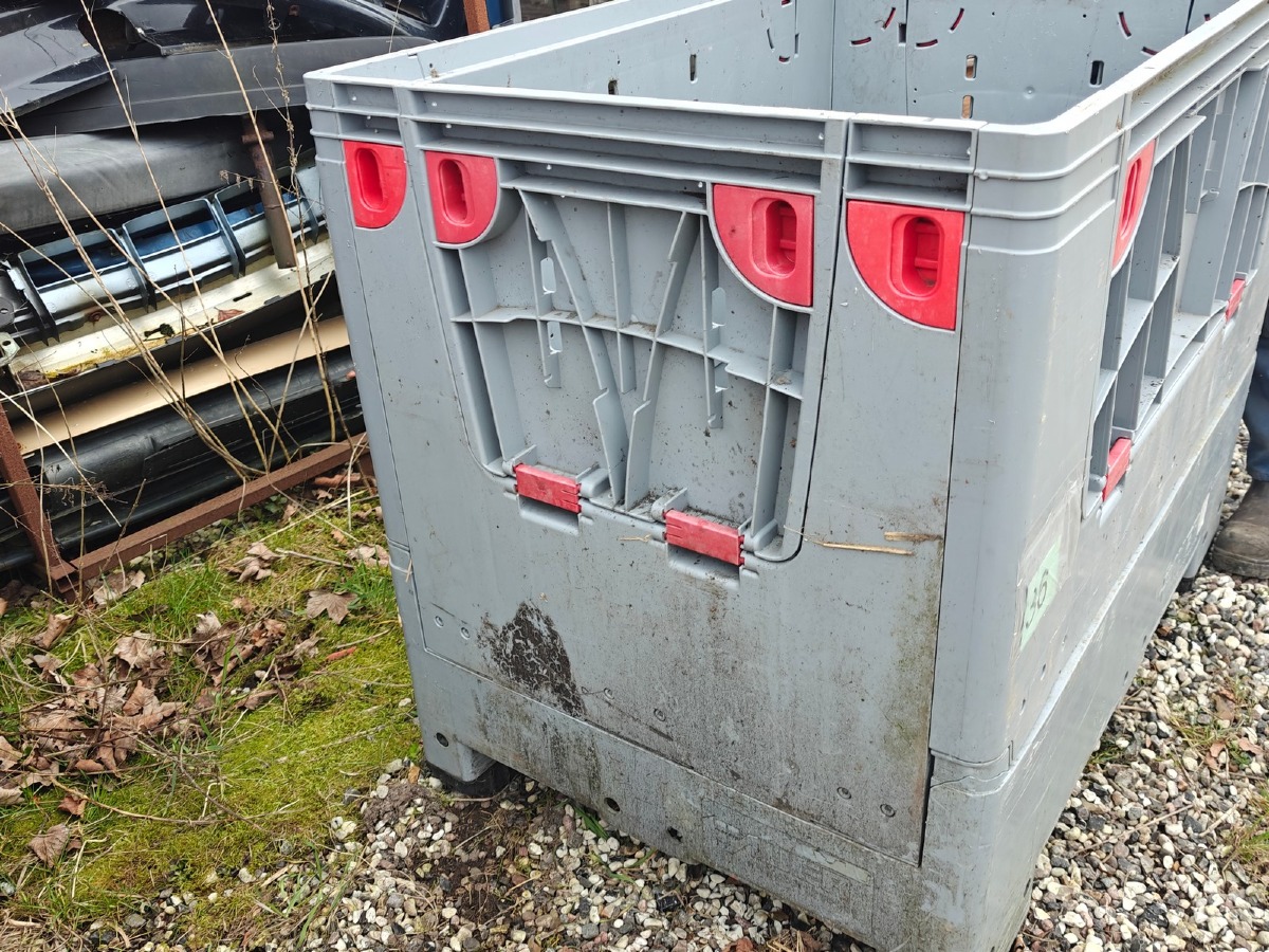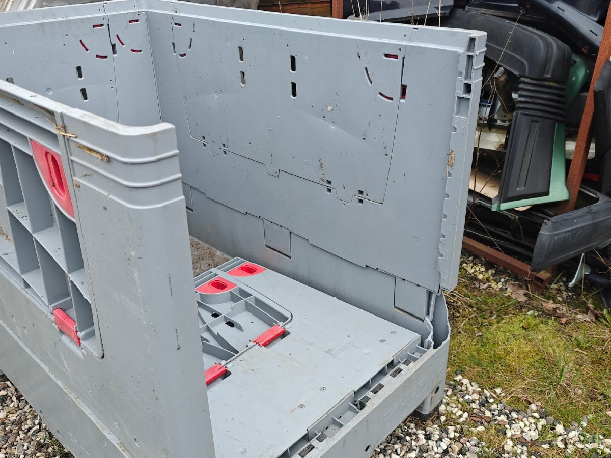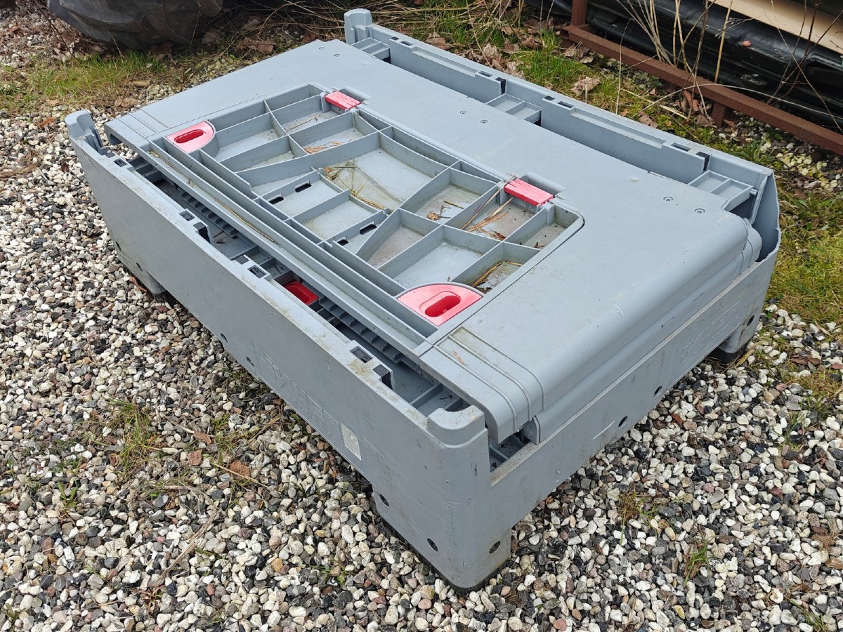 Plastkasse på 'palle-fødder'. Sammenklappelig. Brugt.