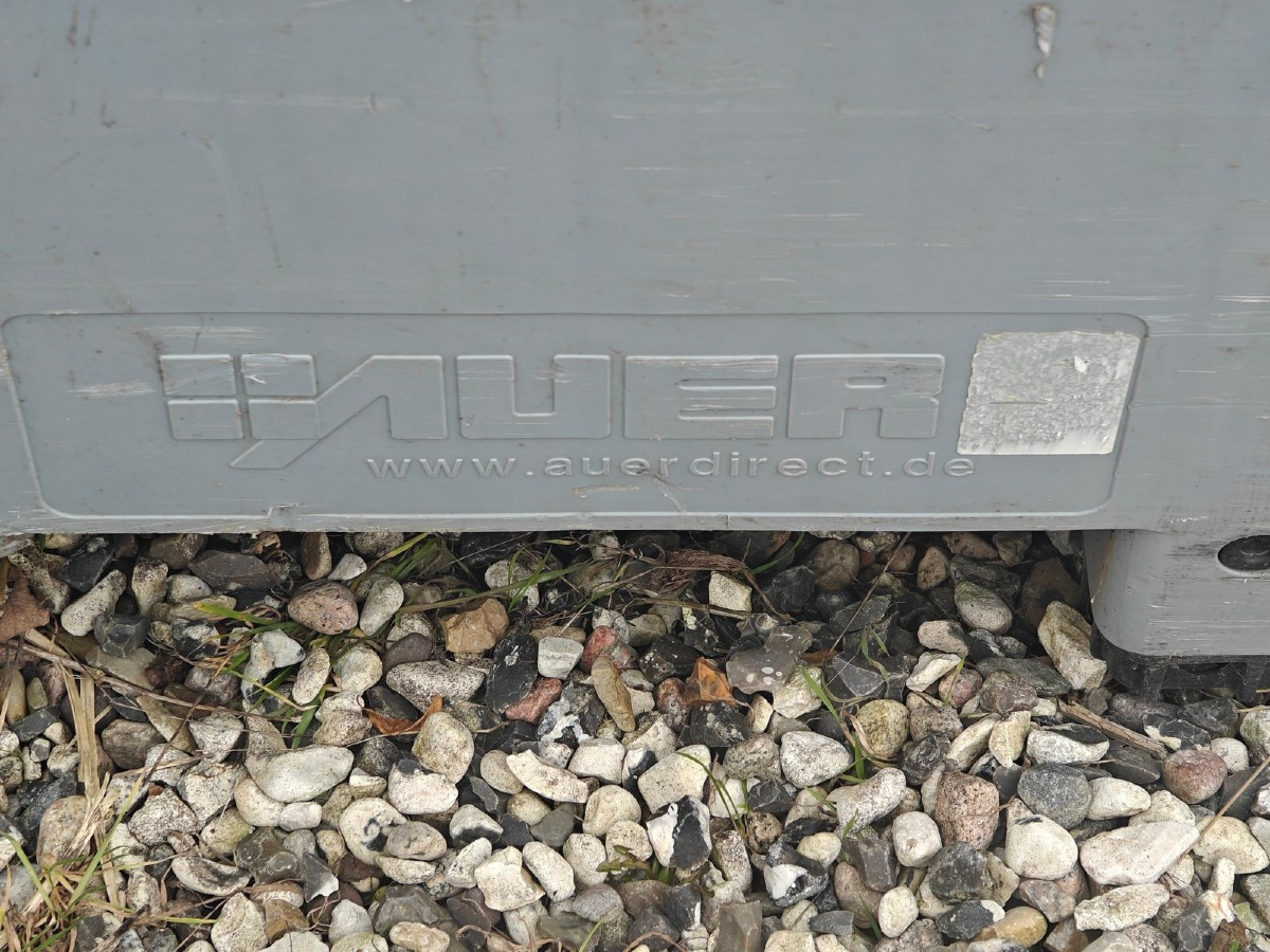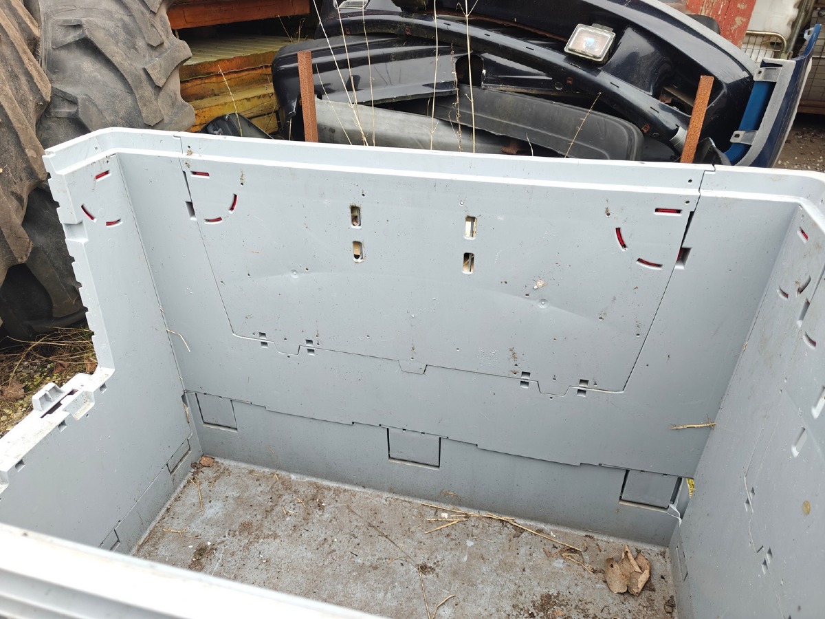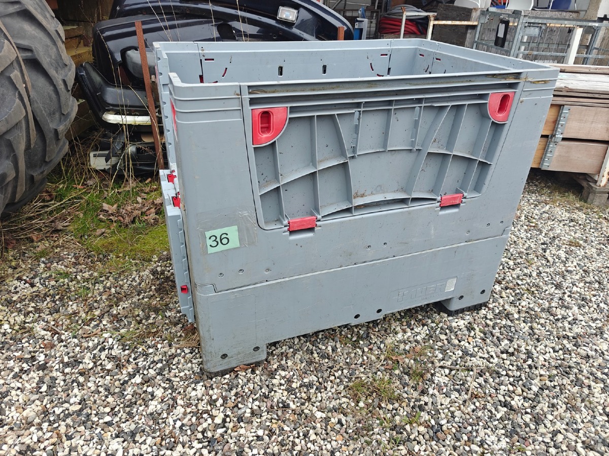Plastkasse på 'palle-fødder'. Sammenklappelig. Brugt.