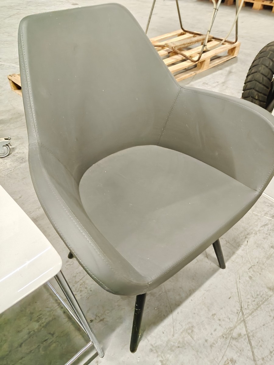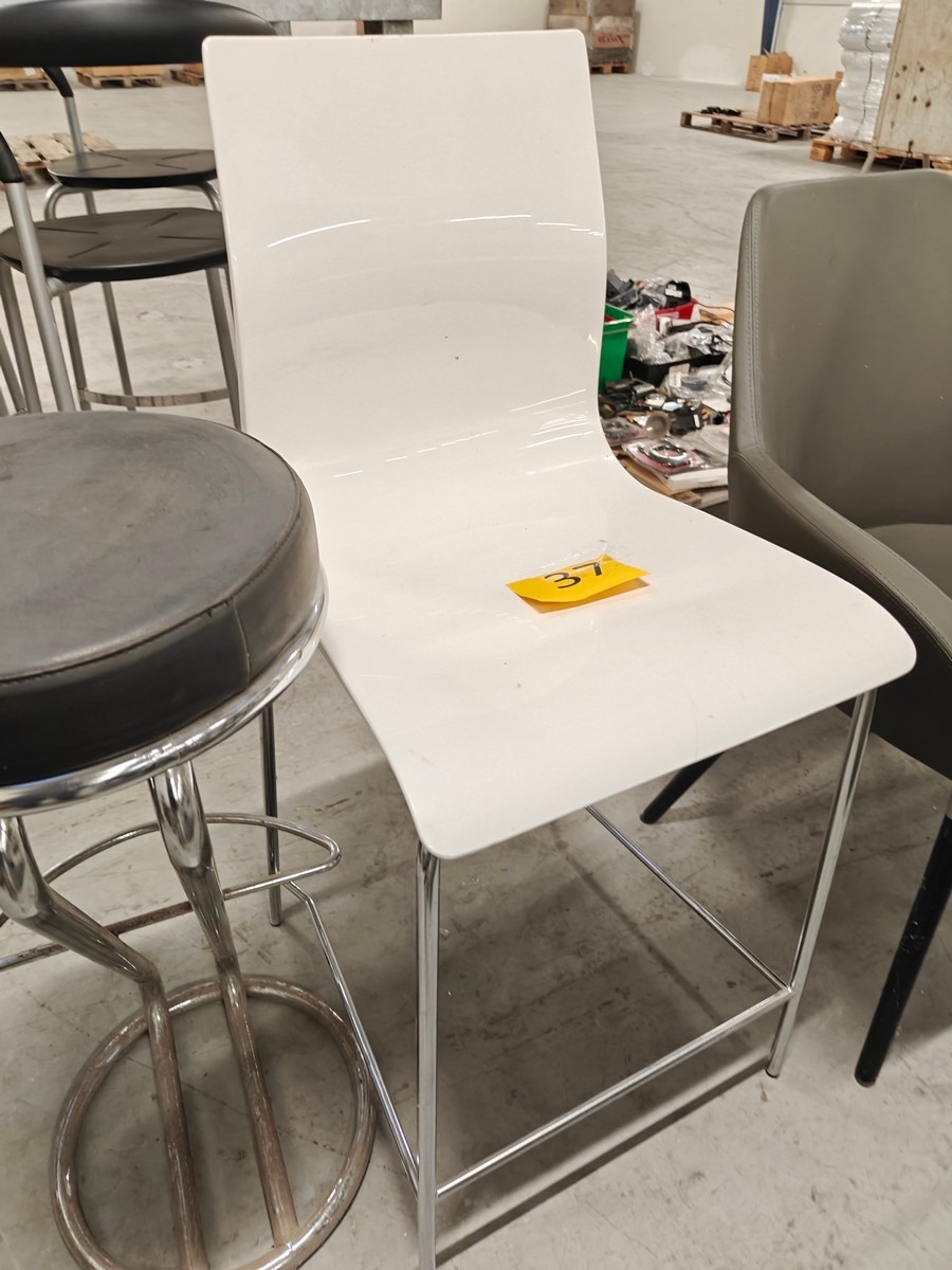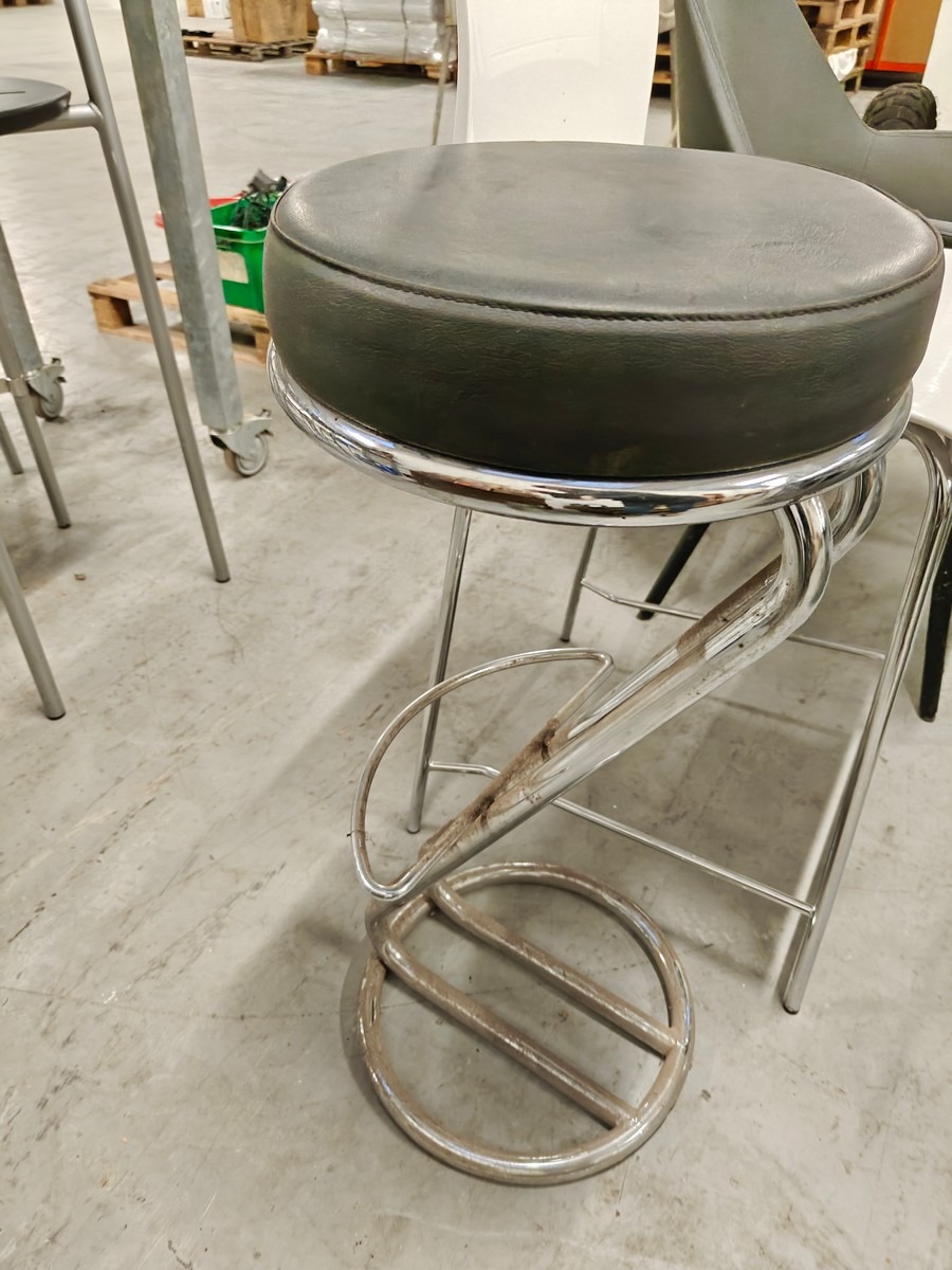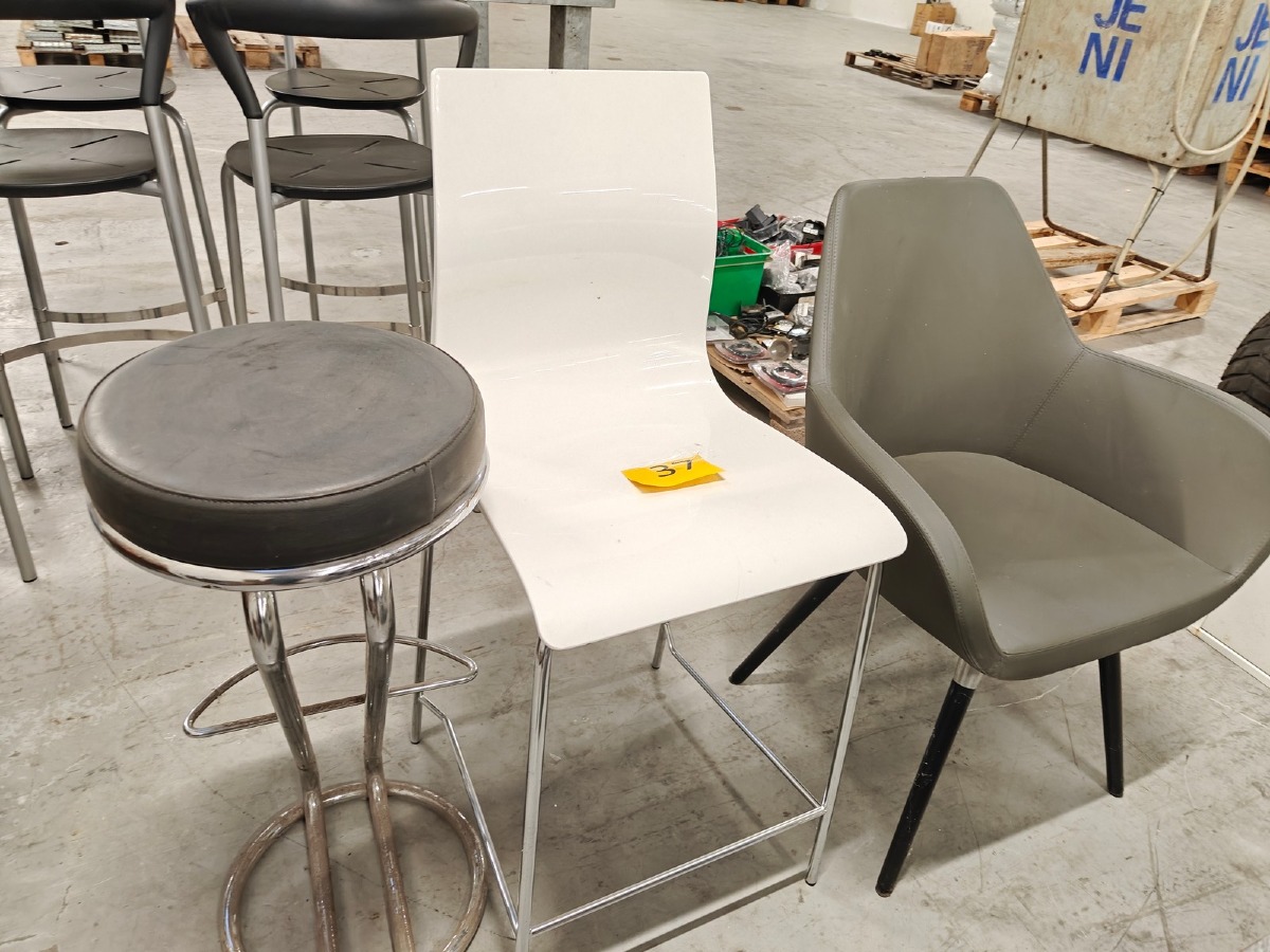 3 stole. Barstol på kromstel med overfladisk rust. Anden højstol med skalsæde. Hvilestol  med grå kunstlæder.