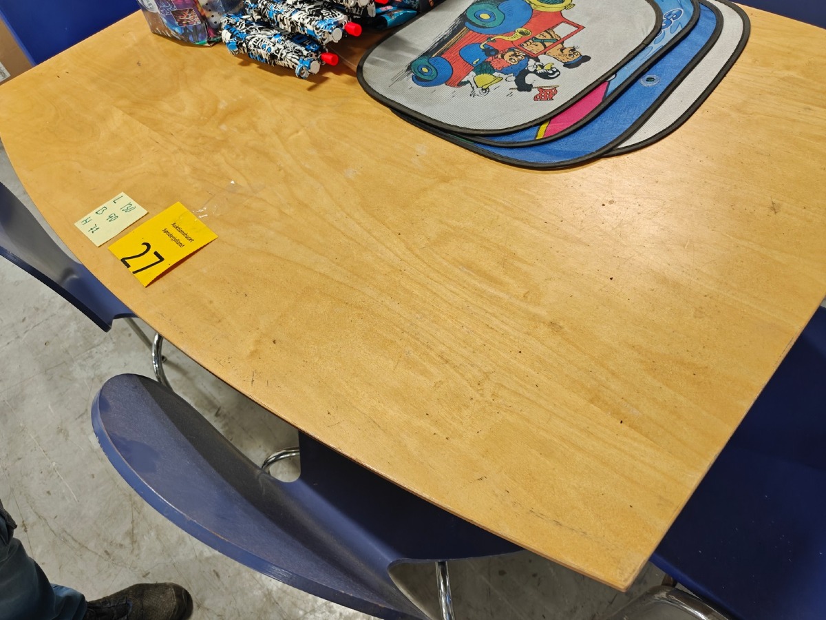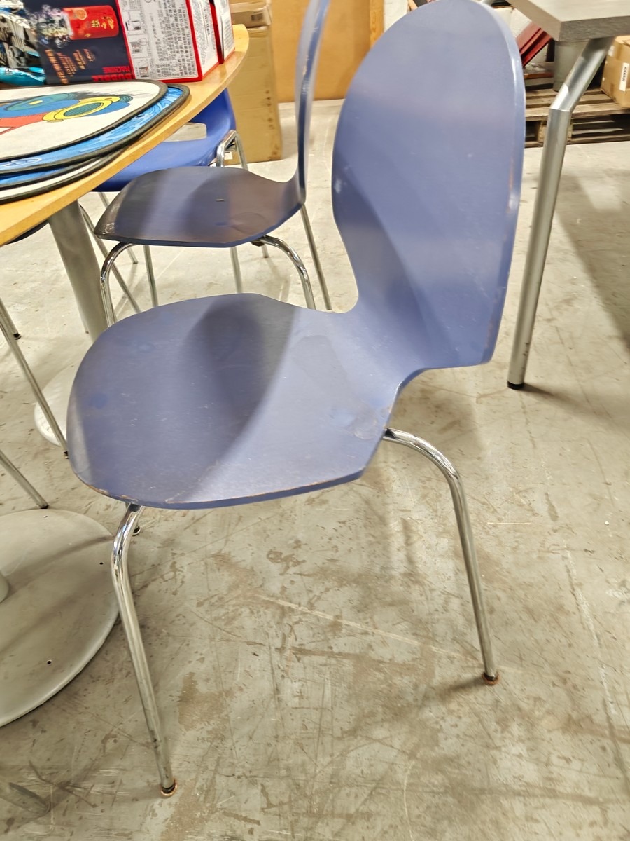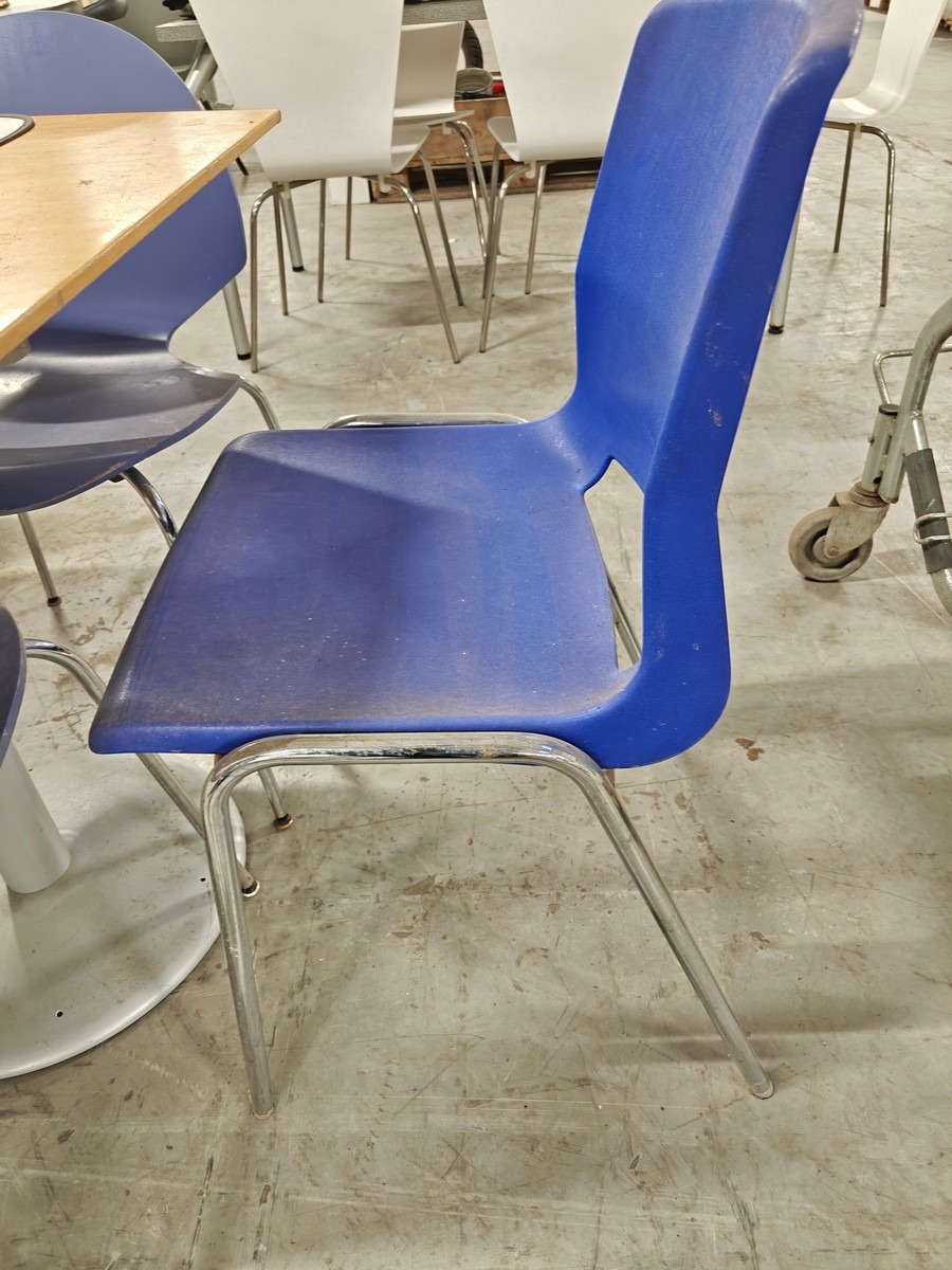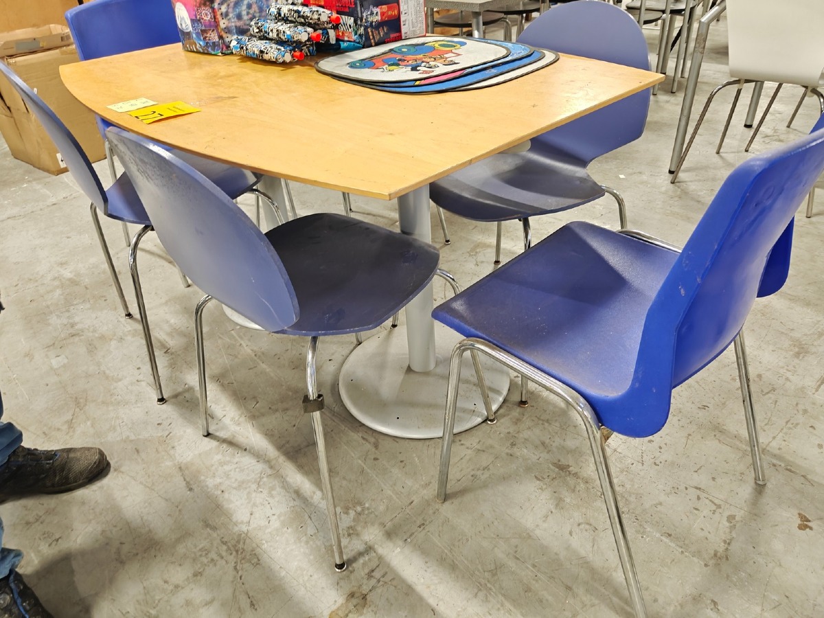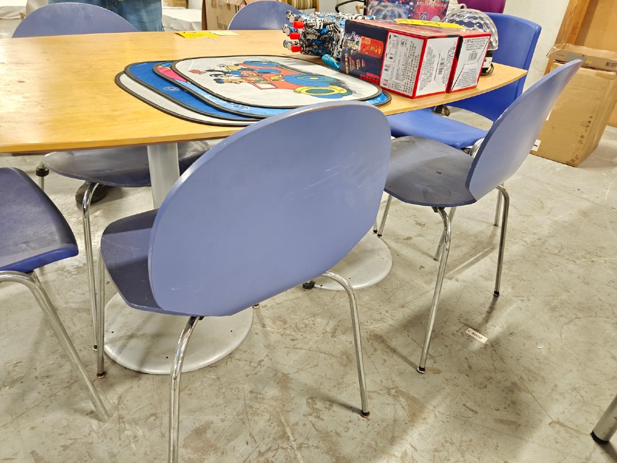 Spisebord og 6 stole. Bord på 2 centrerede ben, plade med bøgelaminat. 4 skalstole af finer og 2 skalstole af plast. Alle dele med slid og brugsspor.