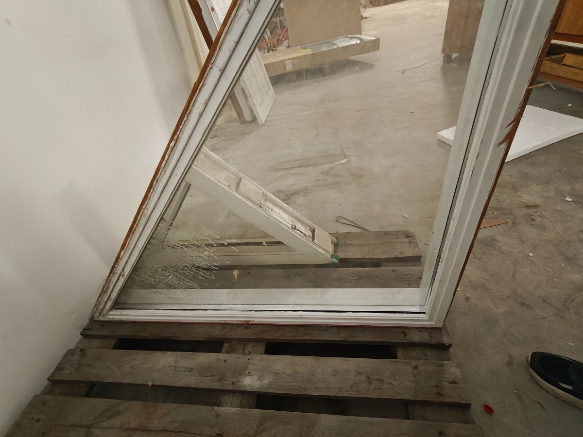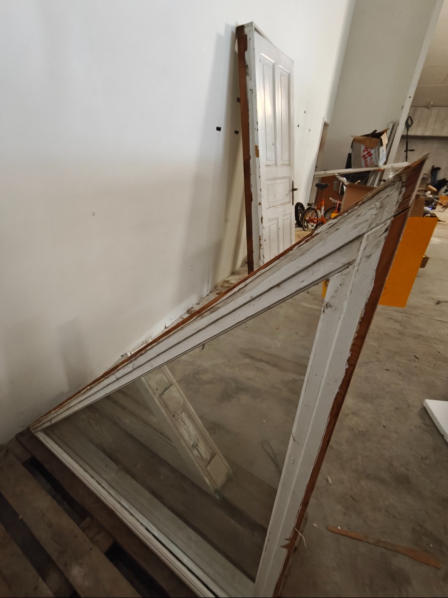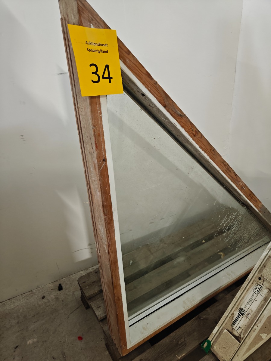 2 skrå vinduer  1 i træ der måler 119*119*11,5 cm 2 lag glas. 1 Rationel plast vindue der måler 66*66*12 cm ok stand