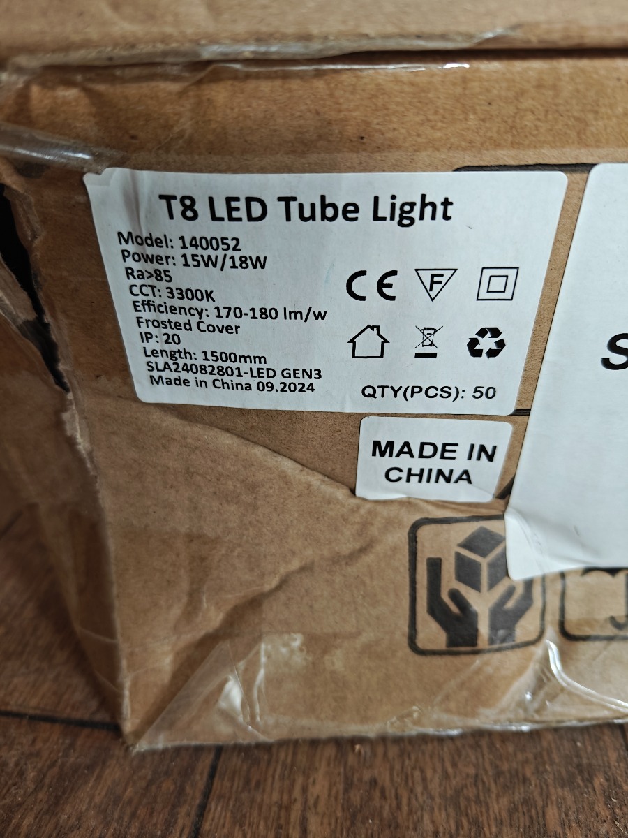 1 ks. a´50 stk, LED lysstofrør T8 LED TUBE LIGHT model 140052, 13w/15w cct: 3300 L 1200mm, ubrugte, indpakningen er fugtskadet.