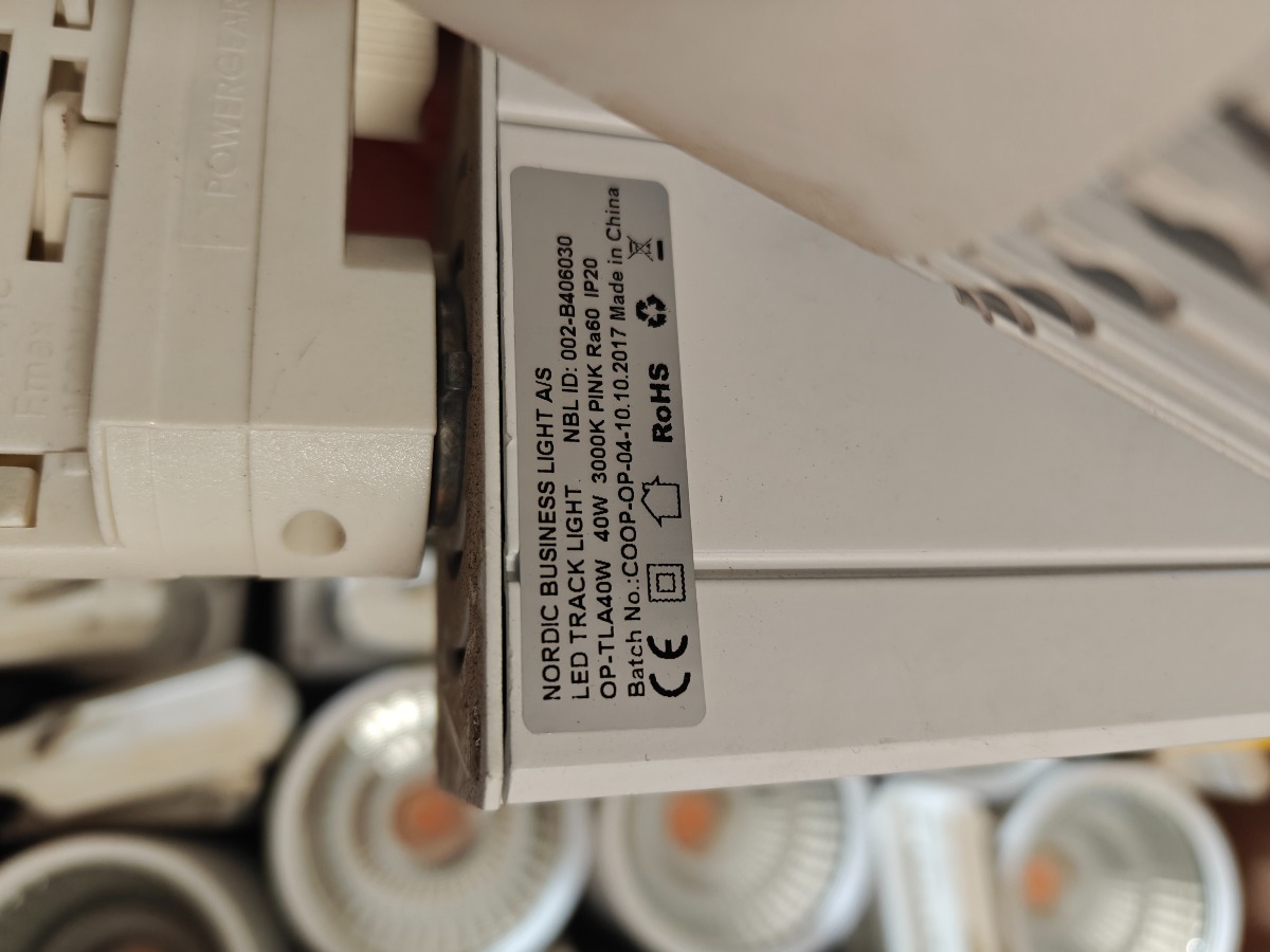 Spot LED TRACK LIGHT 40w 35 stk, lys farve ukendt pink / hvid, ubrugte misharvnig og overfladerust kan forekomme på enkelte af dem