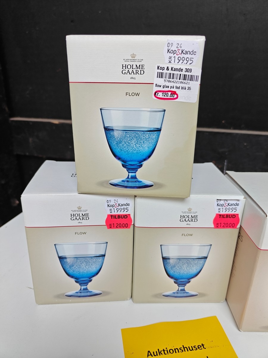Holmegaard Flow glas. 3 blå og 2 klare. Varen er er ny og ubrugt og fra en isenkrambutik