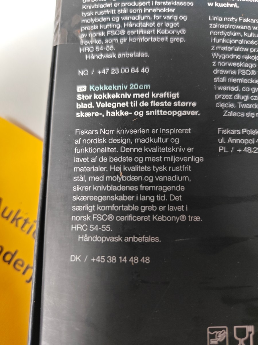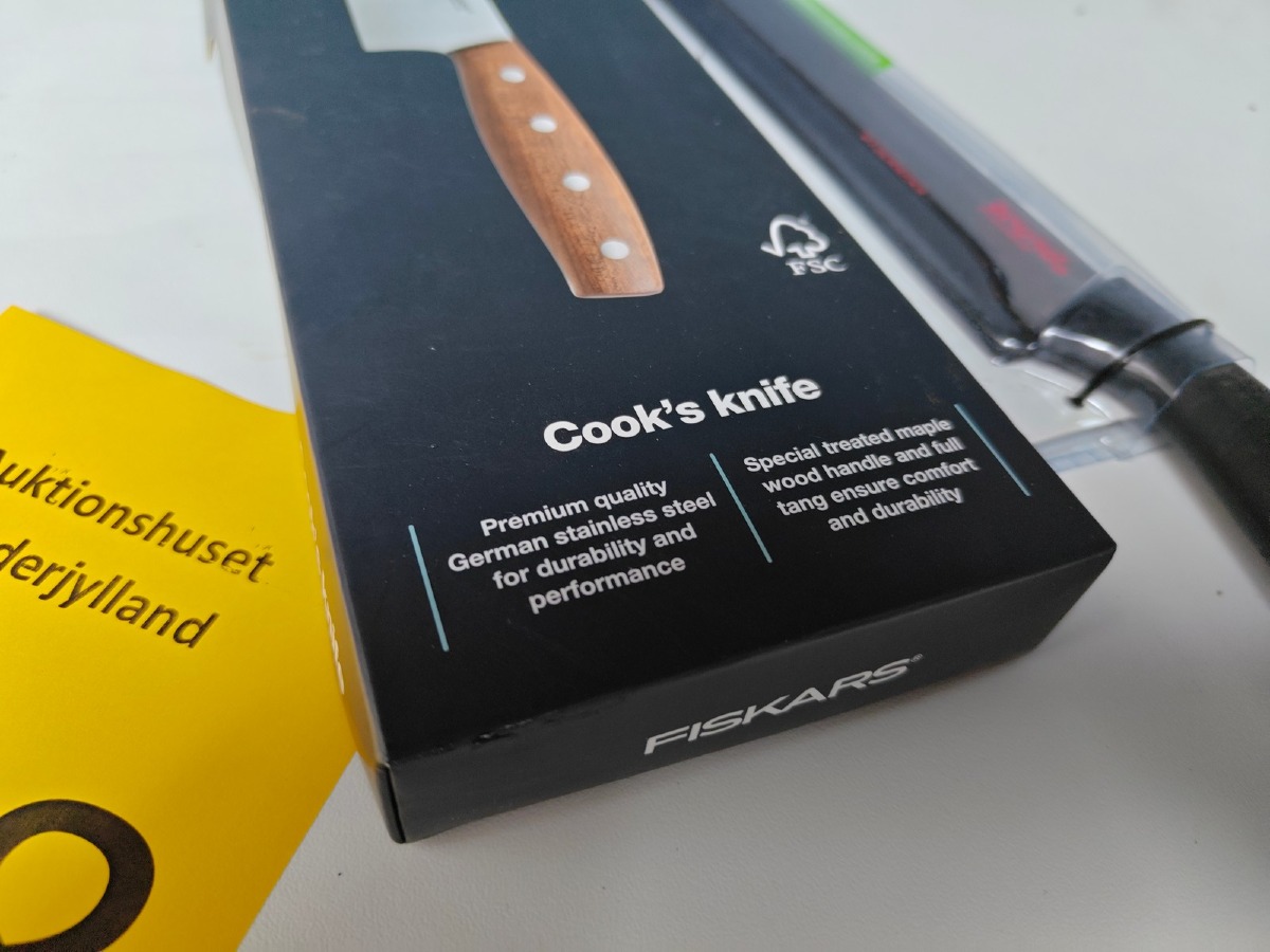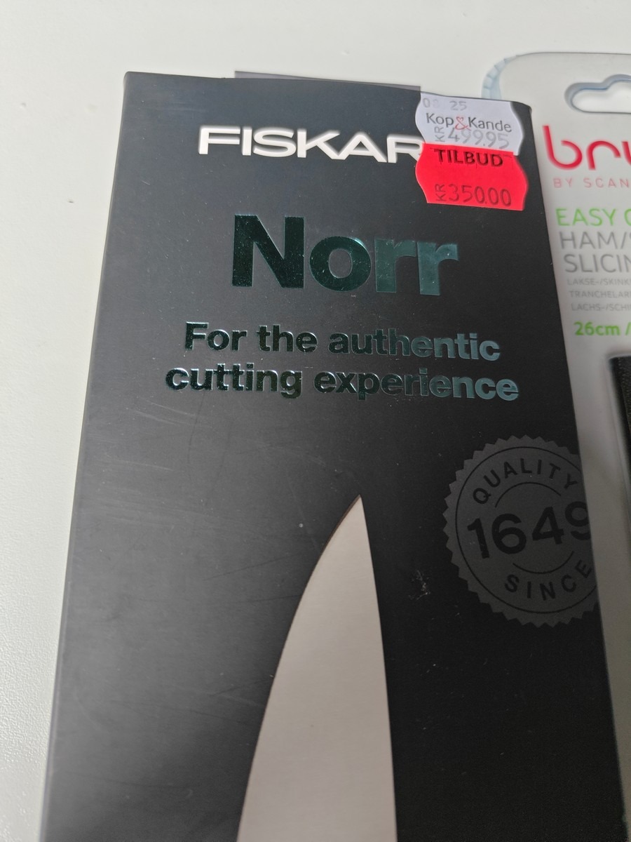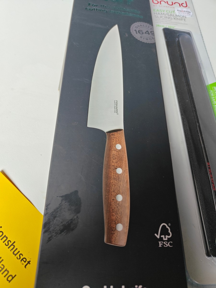 2 køkkenknive. Fiskars Norr kokkekniv og Brund laksekniv. Varen er er ny og ubrugt og fra en isenkrambutik