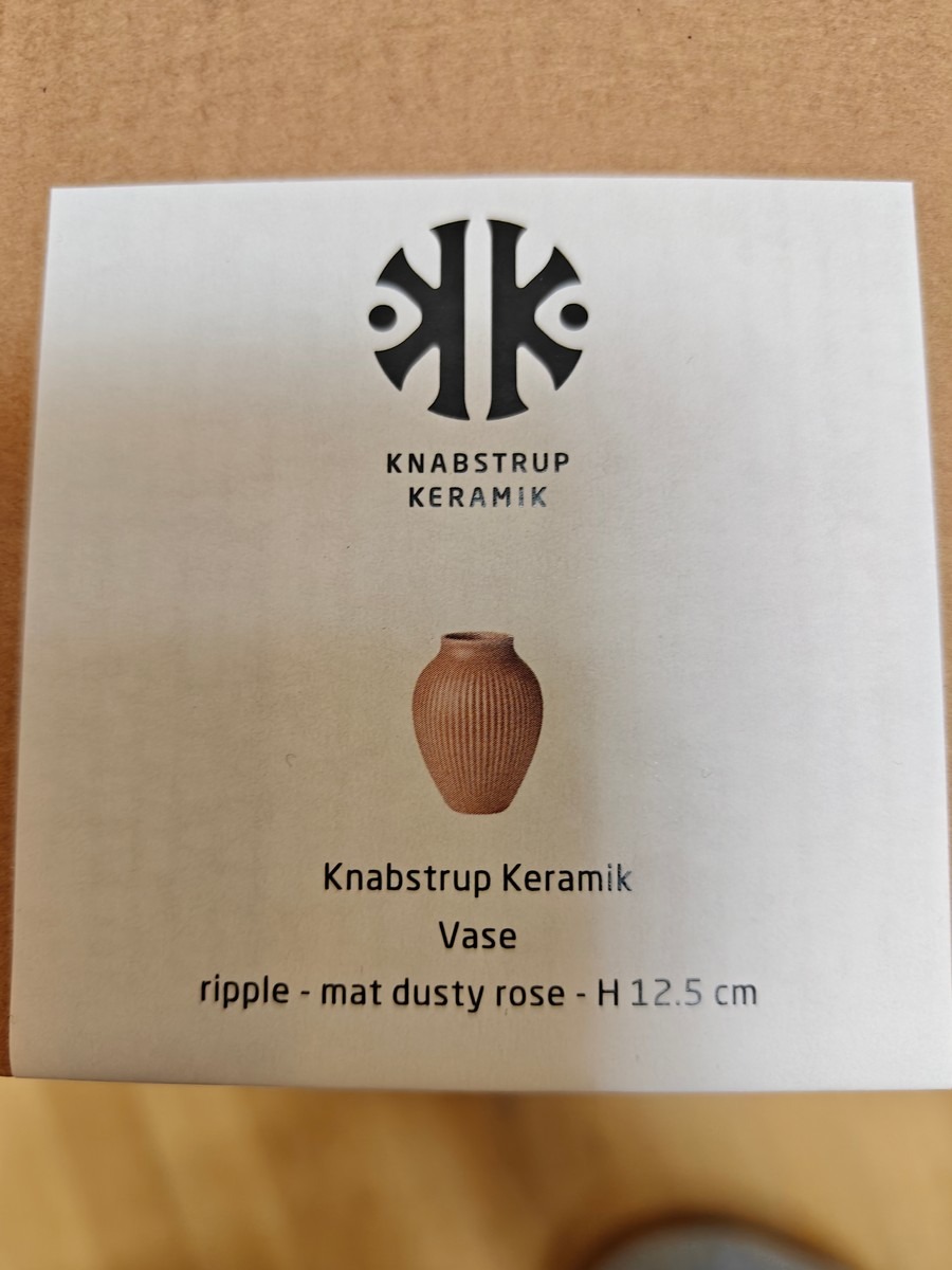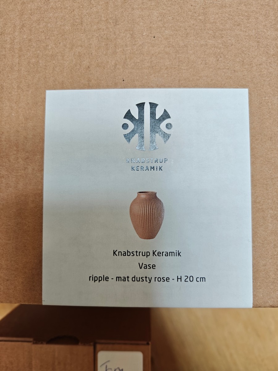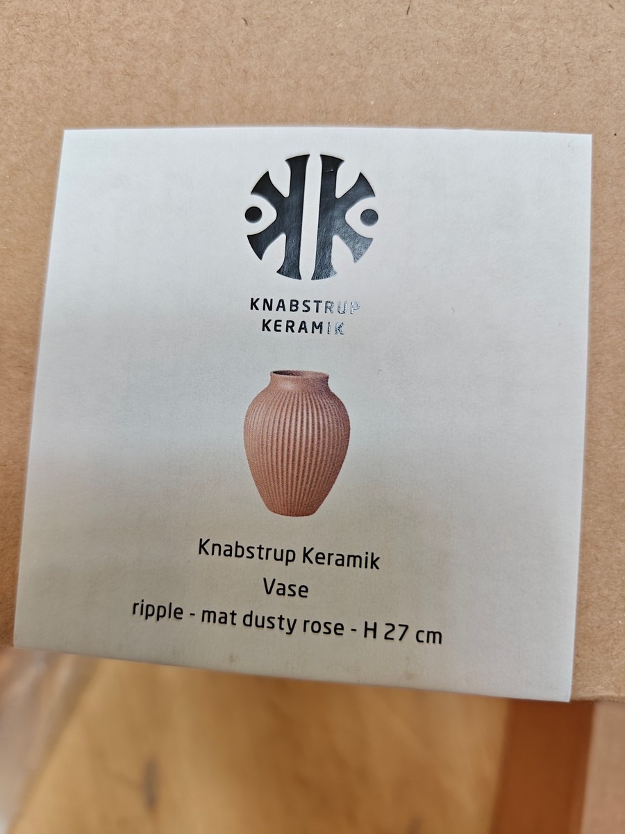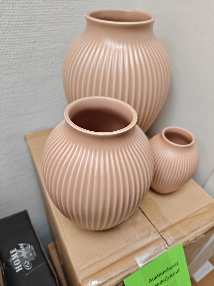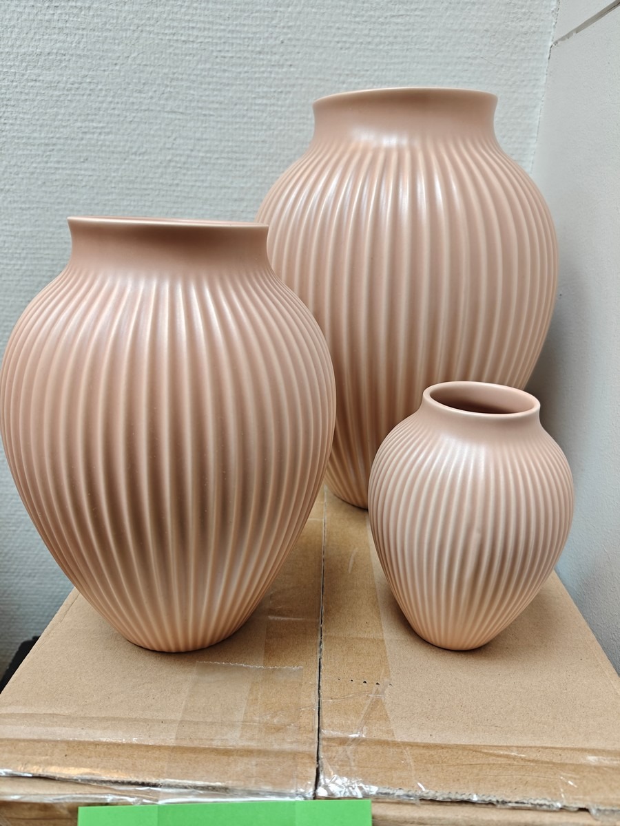 Knabstrup Keramik. 3 vaser i riflet form i 3 størrelser. støvet rosa. Varen er er ny og ubrugt og fra en isenkrambutik