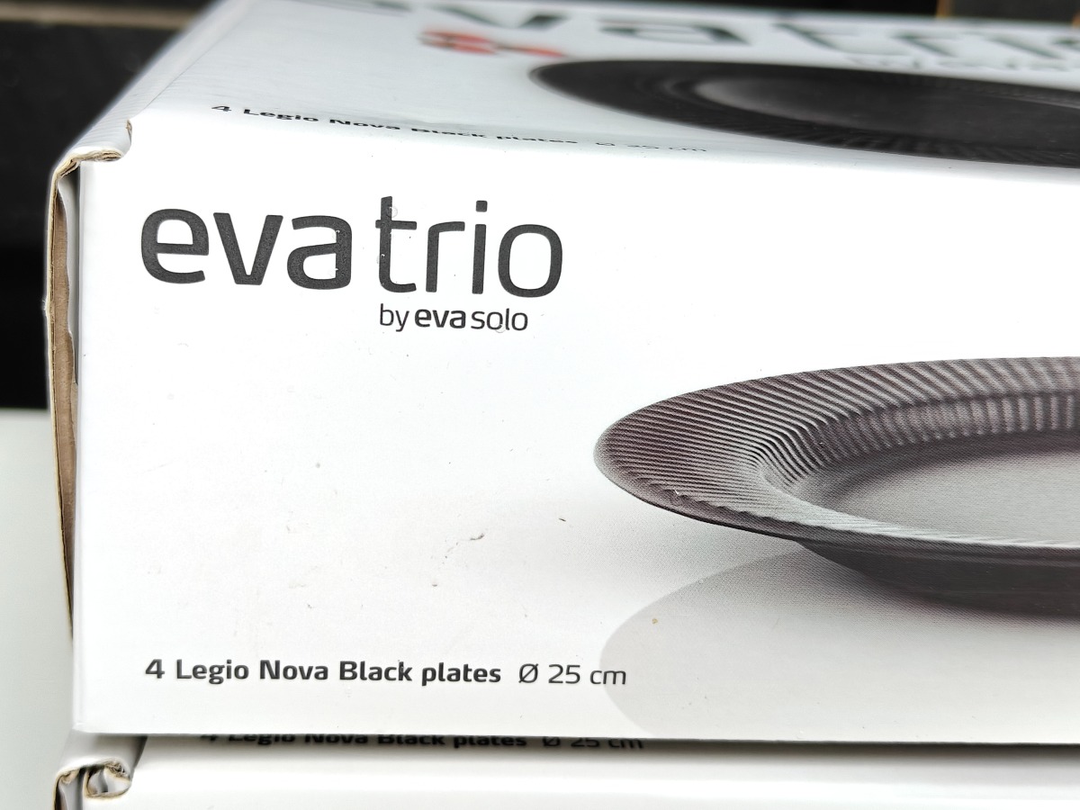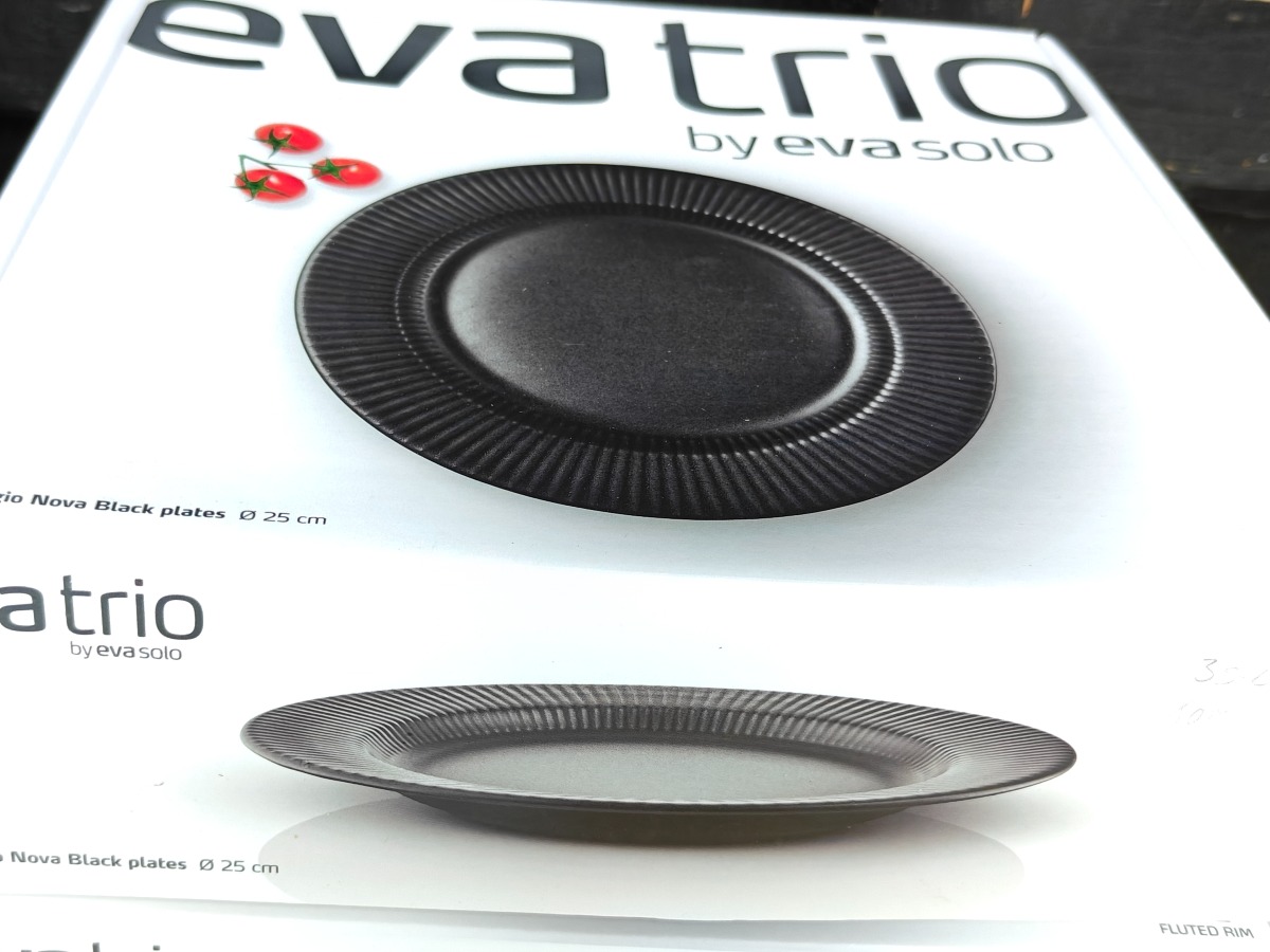 Eva Trio Legio Black. 2 pk. med hver 4 tallerkner i Ø. 25 cm. Varen er er ny og ubrugt og fra en isenkrambutik.