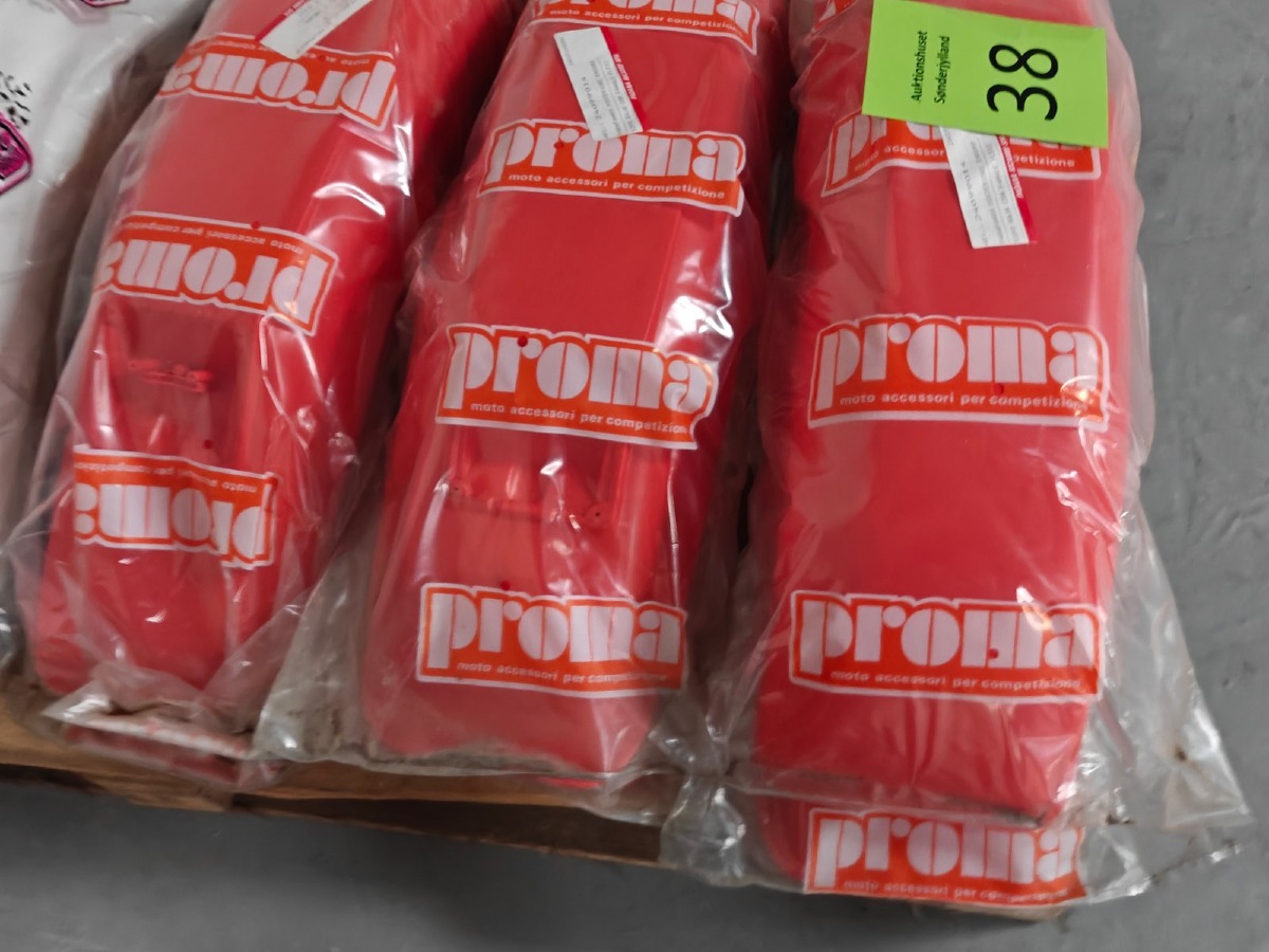 10 Skærme t/motorcrossere. Mrk: Proma Racing Parts. 6 Røde og 4 hvide. Ubrugte, Palle medfølger ikke.