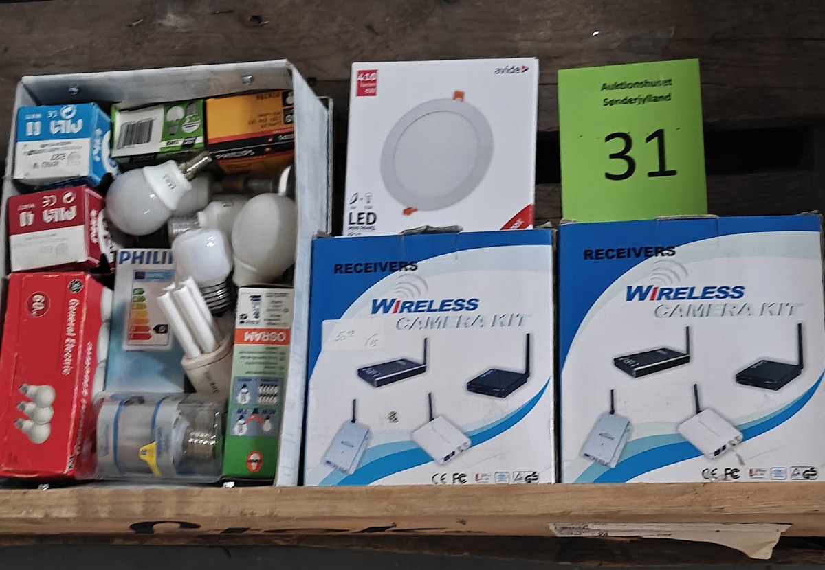 2 Trådløse overvågningskamera kits, 2 vinduesalarmer, 1 LED mini panel & 1 ks lyskilder/pærer
