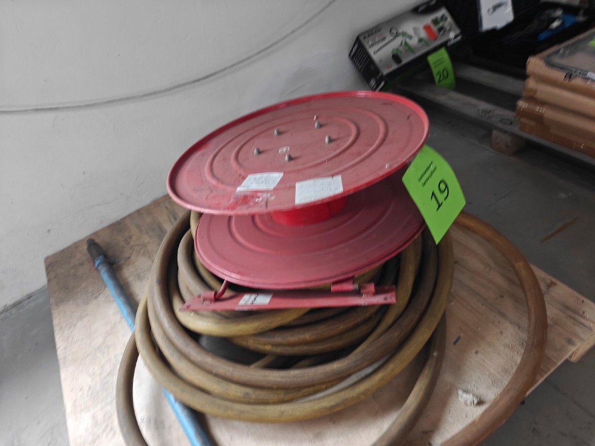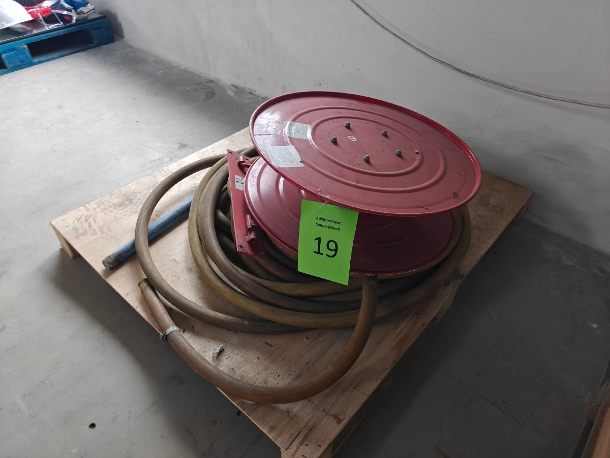 Brandslange m/vægholder. Bemærk: Ikke overholdt på serviceeftersyn. Brugt. Palle medfølger ikke.