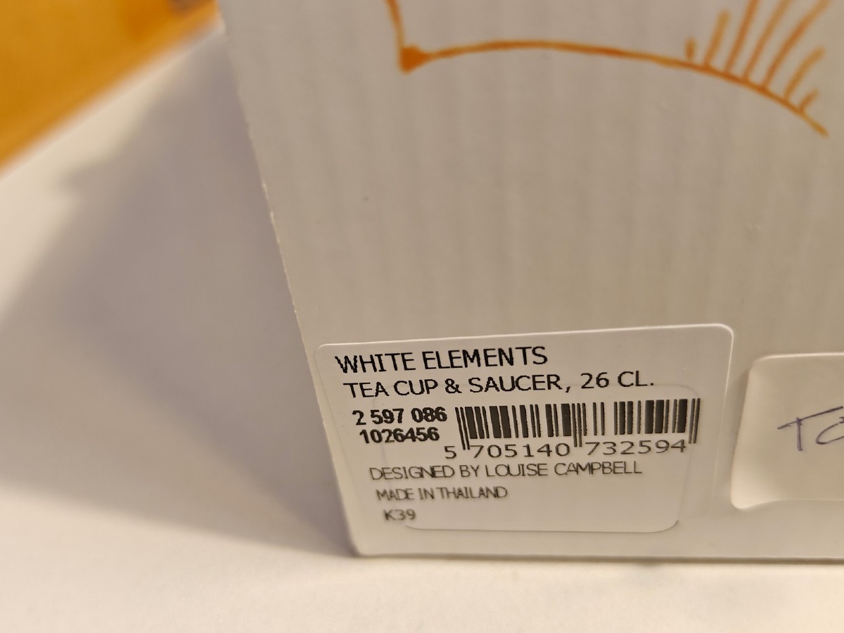 Royal Copenhagen, hvid Elements kop med underkop, 26 cl. Vejledende udsalgspris 479,95 - Ny, i original emballage og ubrugt. Oprydning fra isenkram butik.