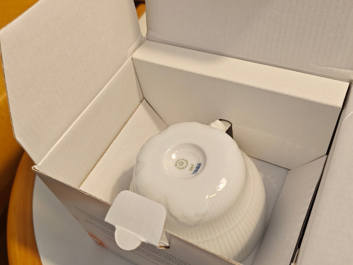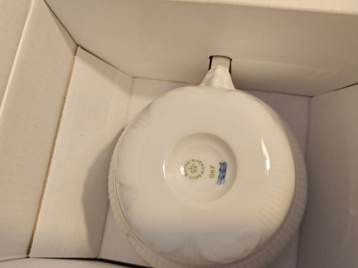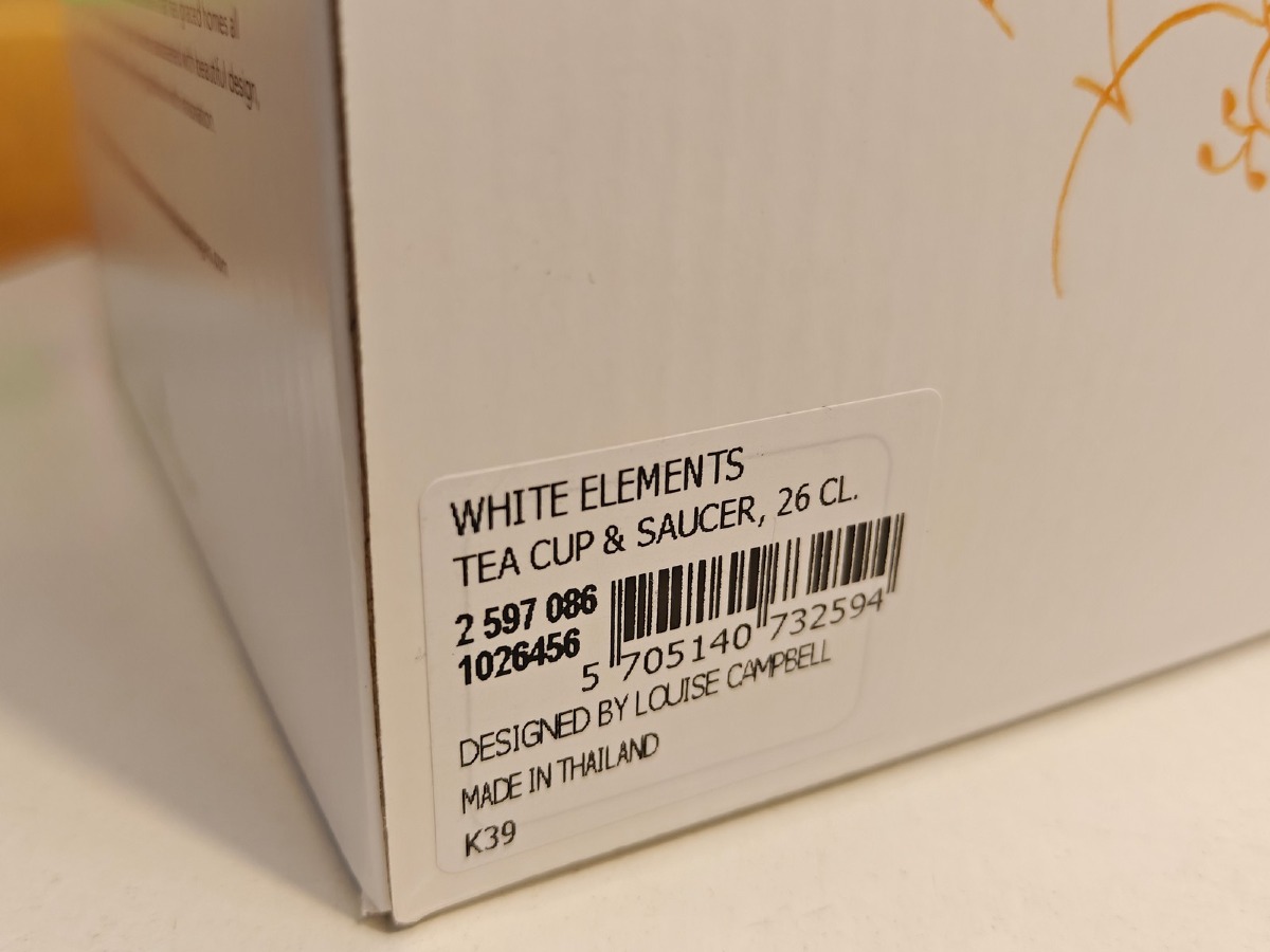 Royal Copenhagen, hvid Elements kop med underkop, 26 cl. Vejledende udsalgspris 479,95 - Ny, i original emballage og ubrugt. Oprydning fra isenkram butik.