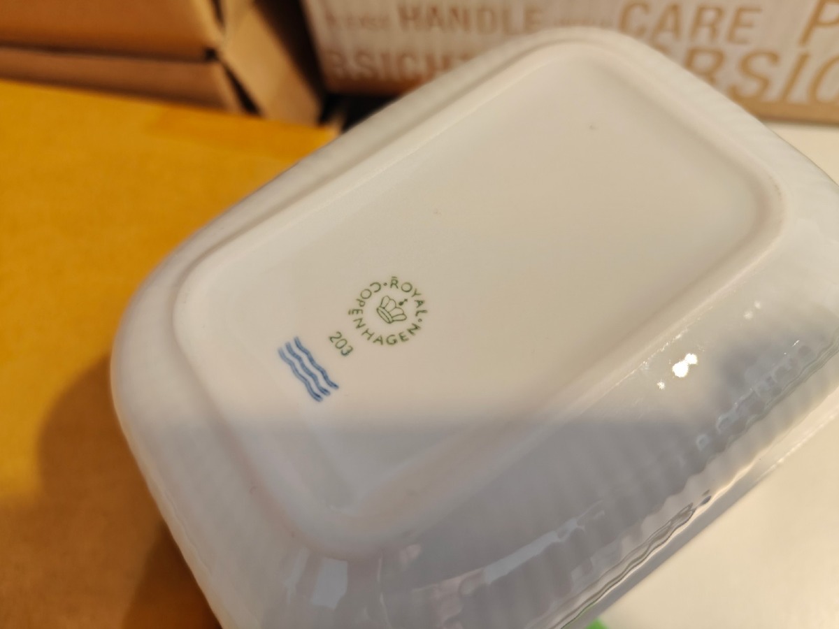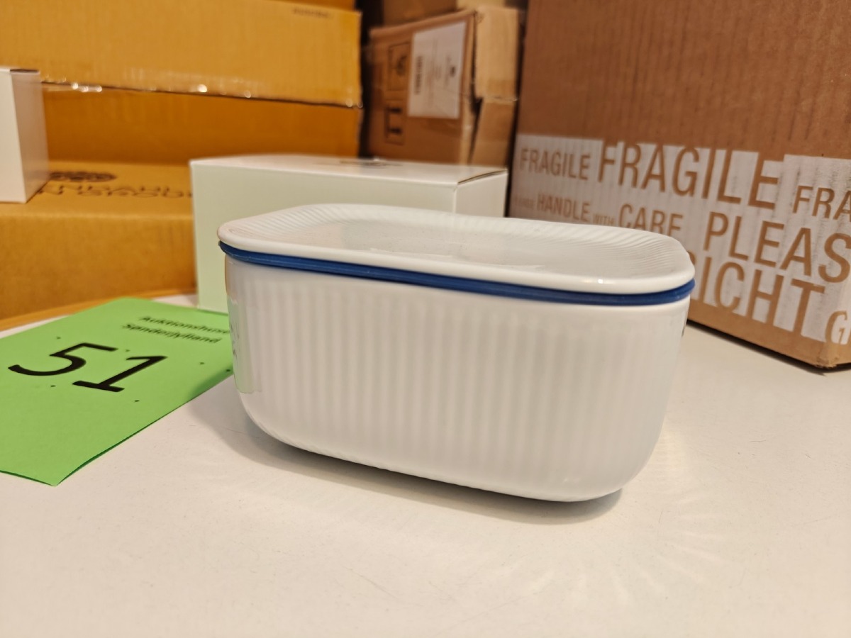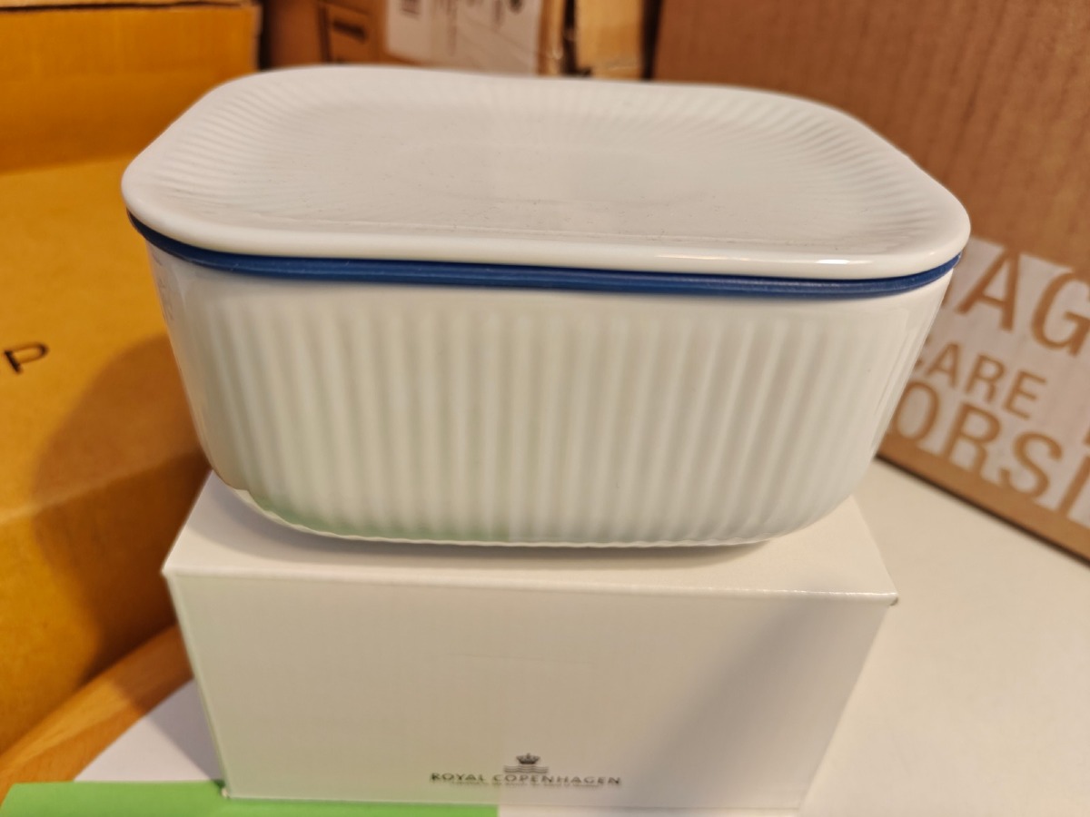 Royal Copenhagen, hvidt riflet smørskål, med blåt eller sort kant. Vejledende udsalgspris 519,95 - Ny, i original emballage og ubrugt. Oprydning fra isenkram butik.