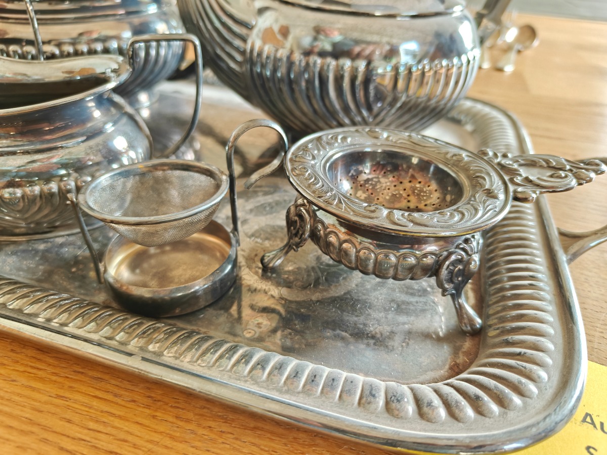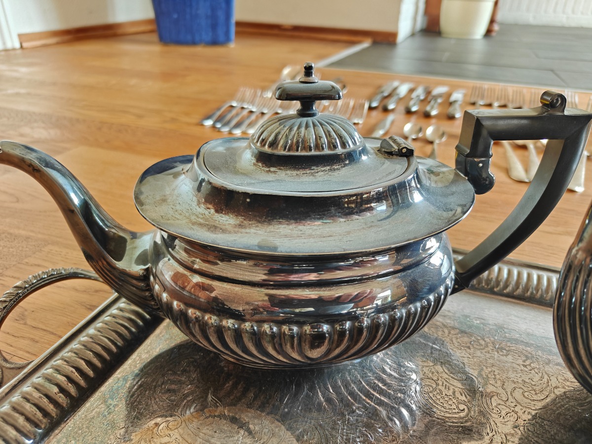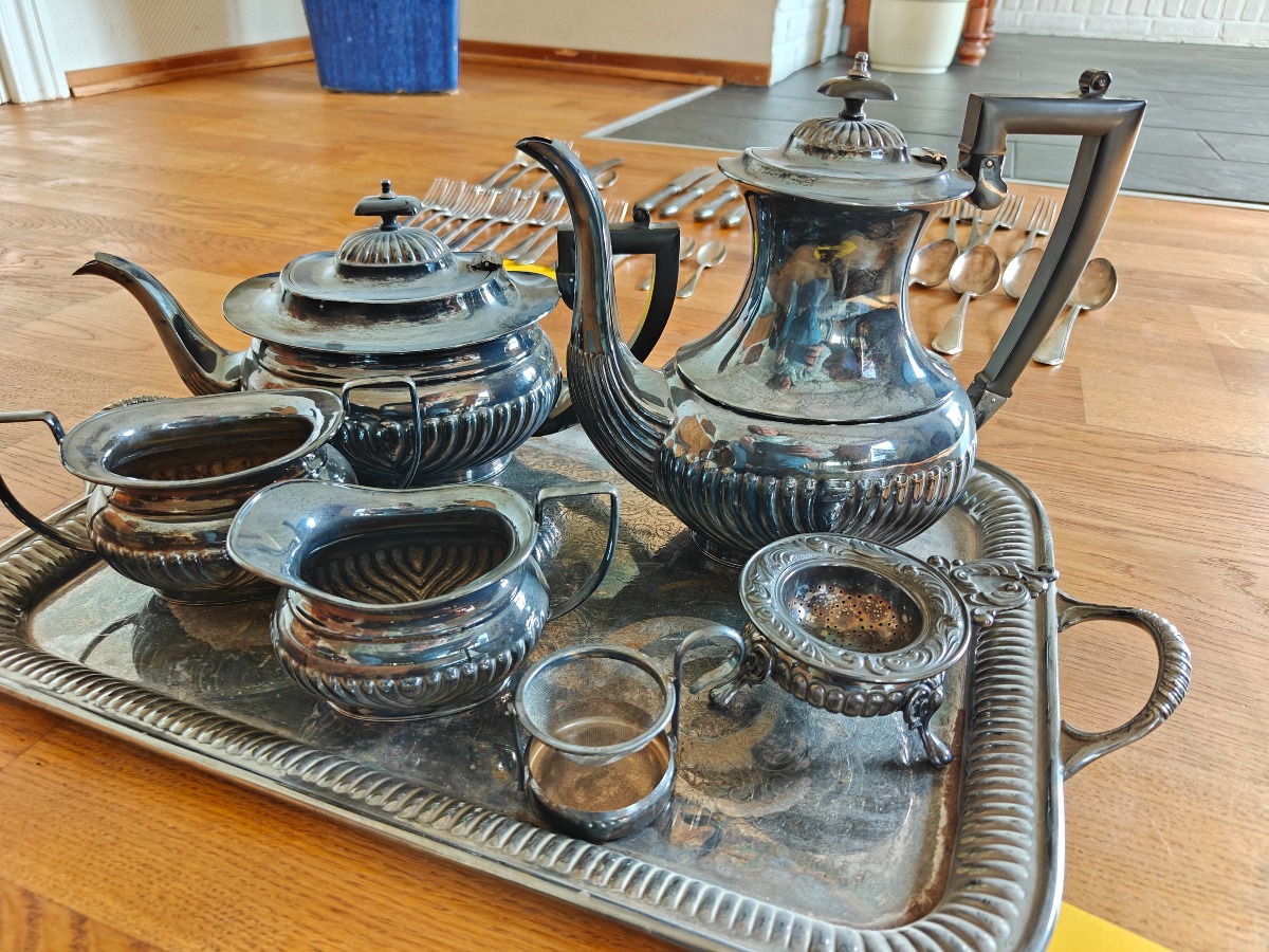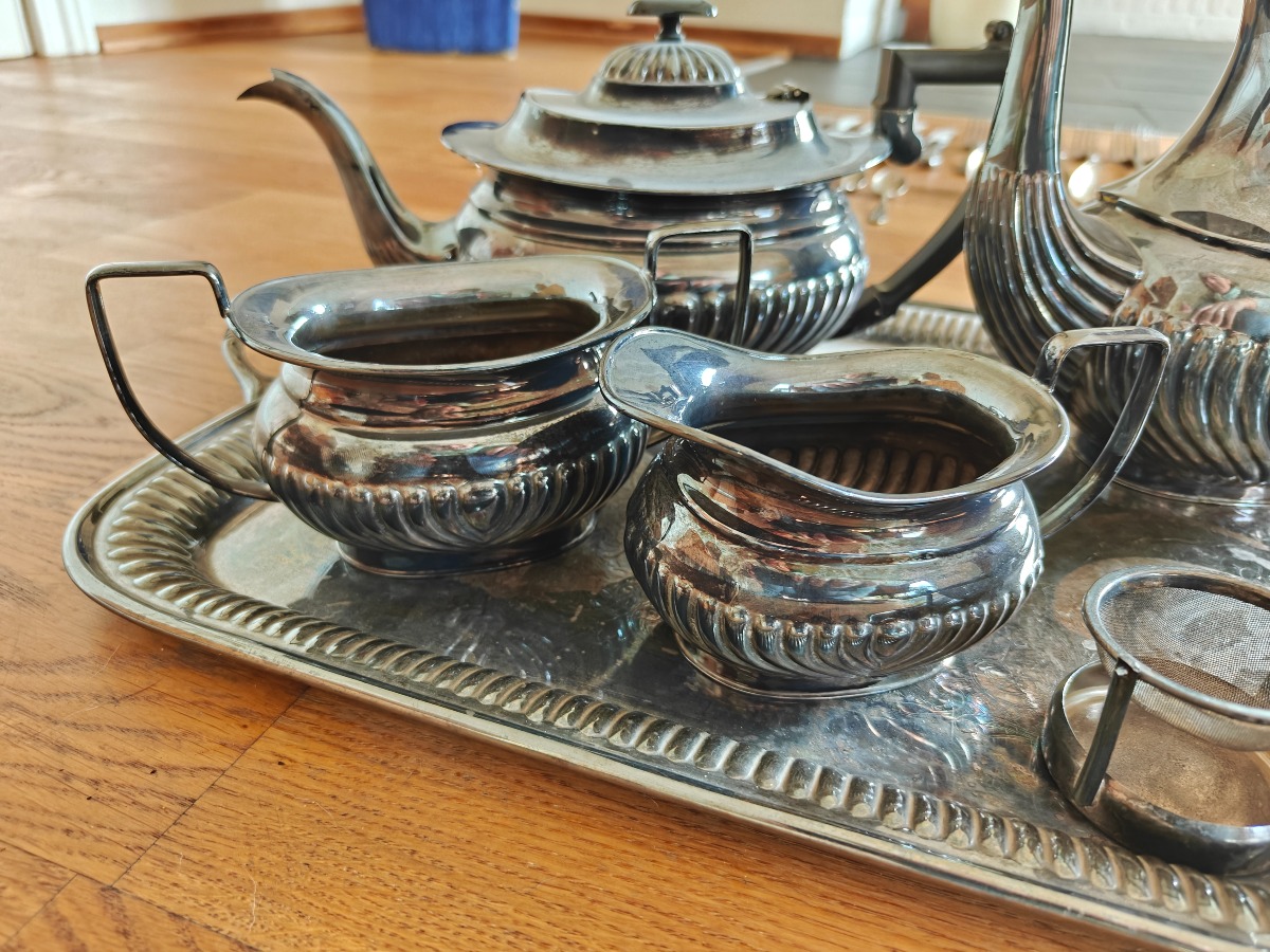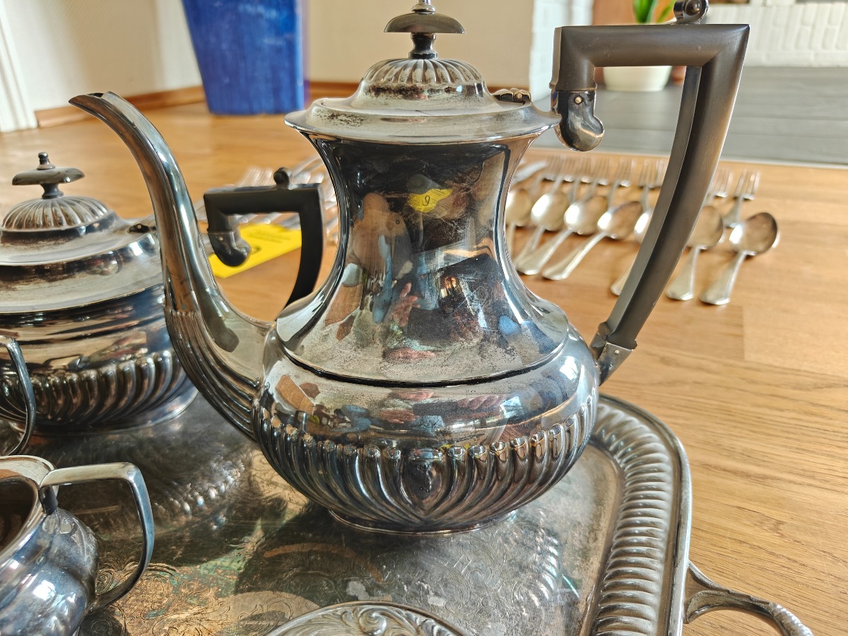 Kaffe og The sæt, i sterling sølv. Fra Barker Brothers LtD Birmingham fra ca 1930érne. Det vejer ca 2,5-3 kg. I pæn stand og med brugsspor. Brugt