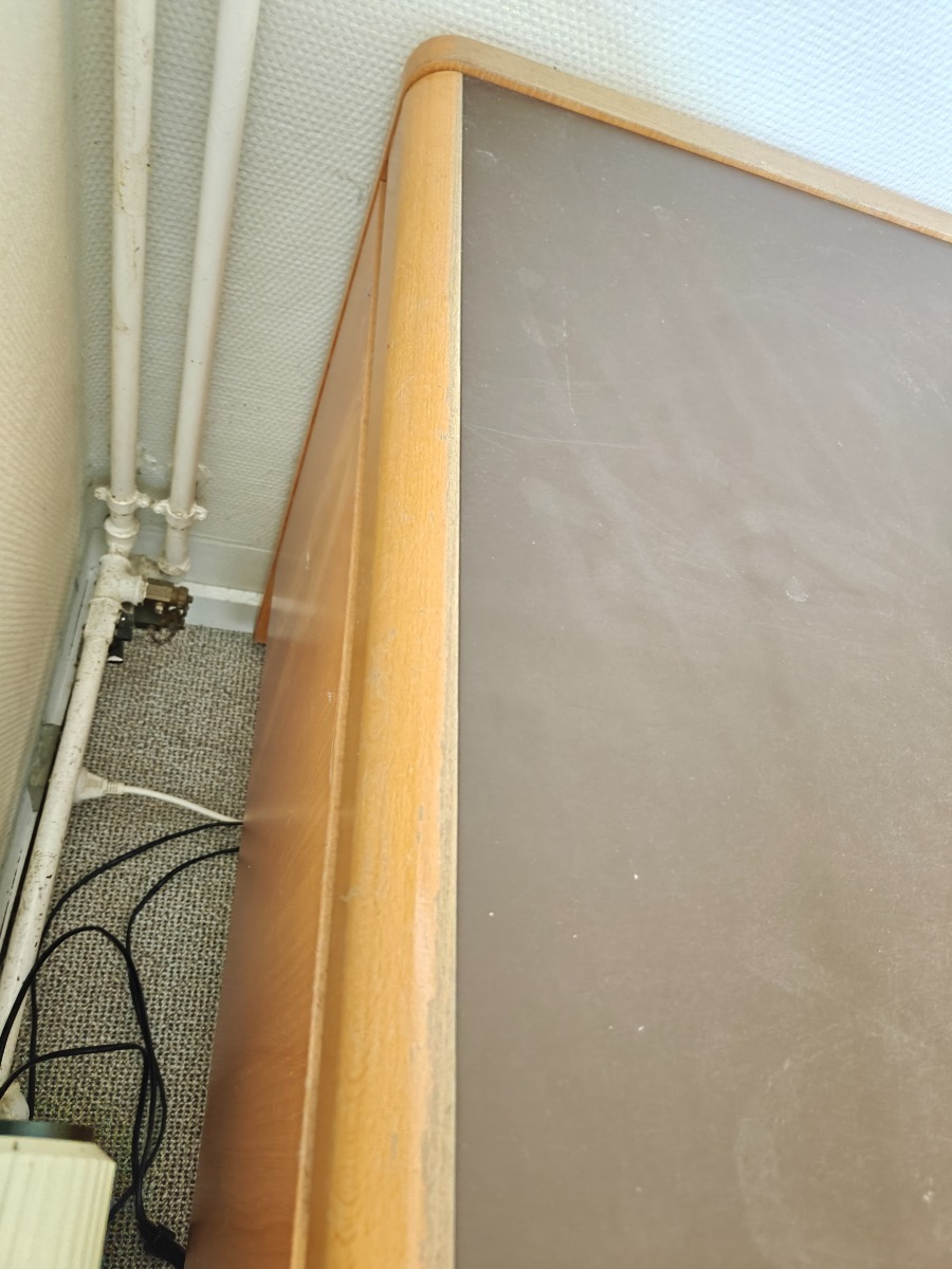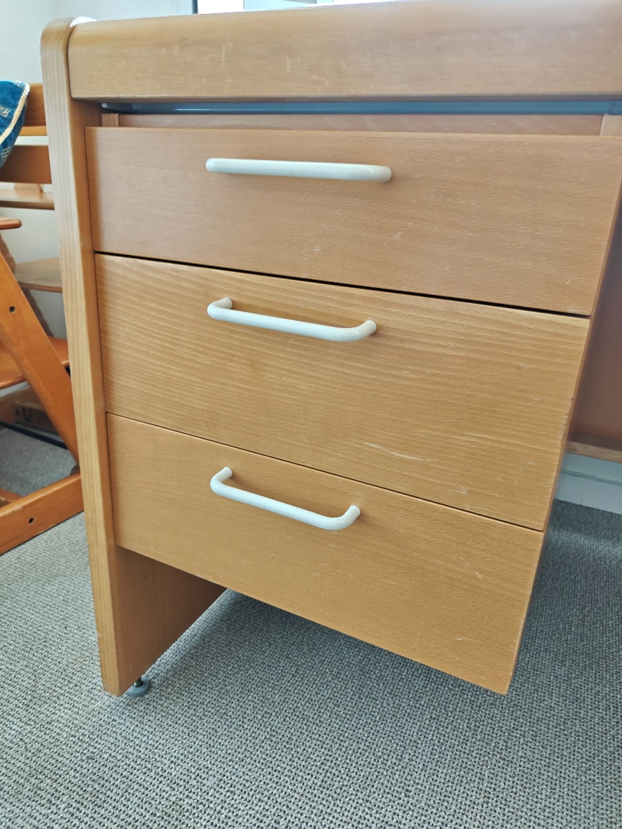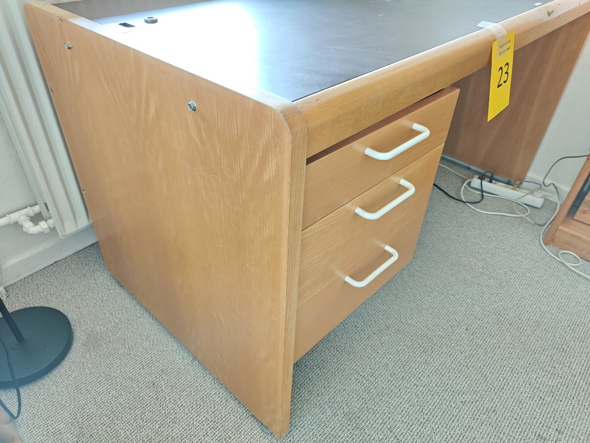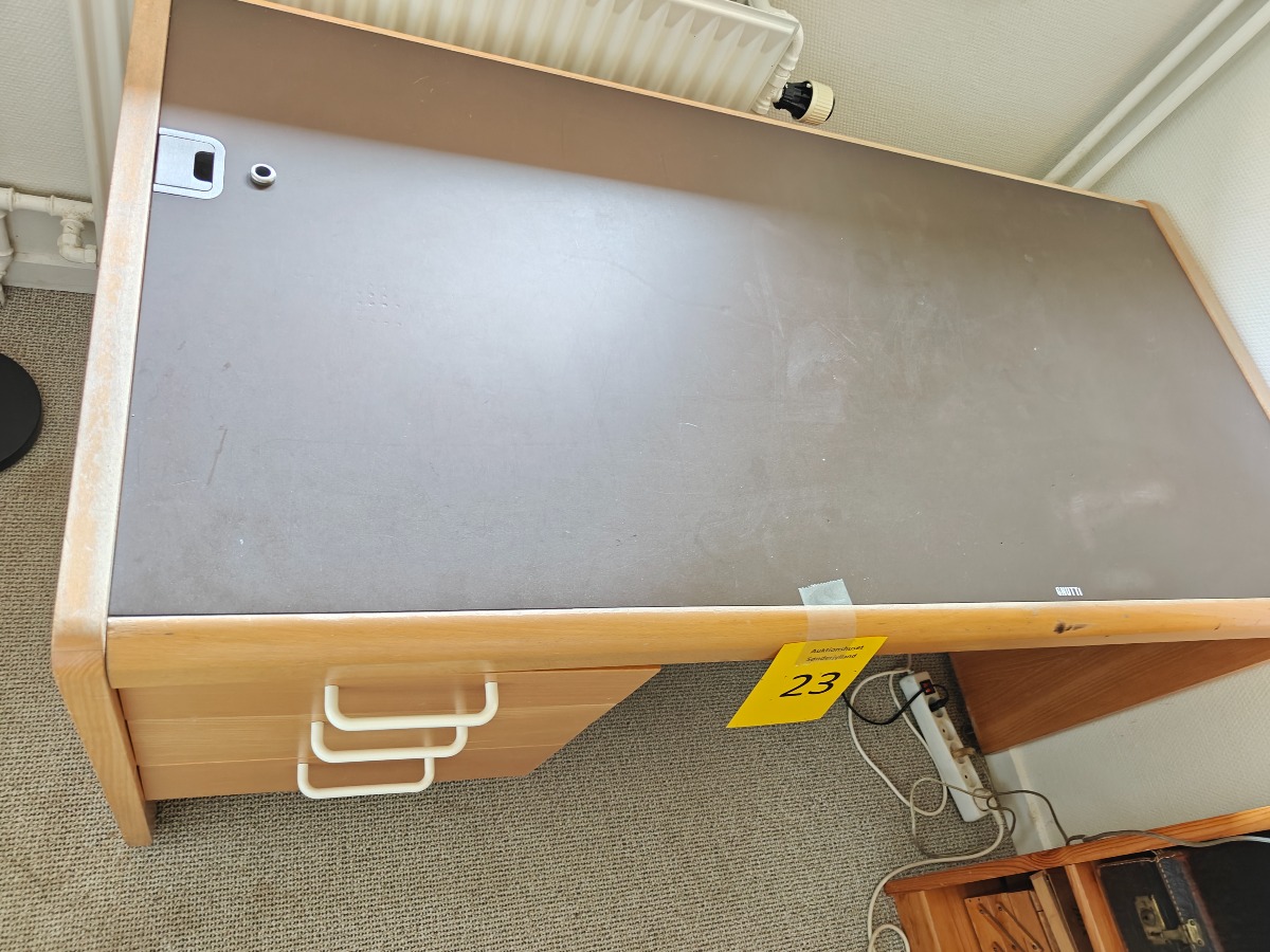 Skrivebord med laminat bordplade. Måler 14 x 70 x 74 høj. Med 3 skuffer og vejer meget. I ok stand. Brugt