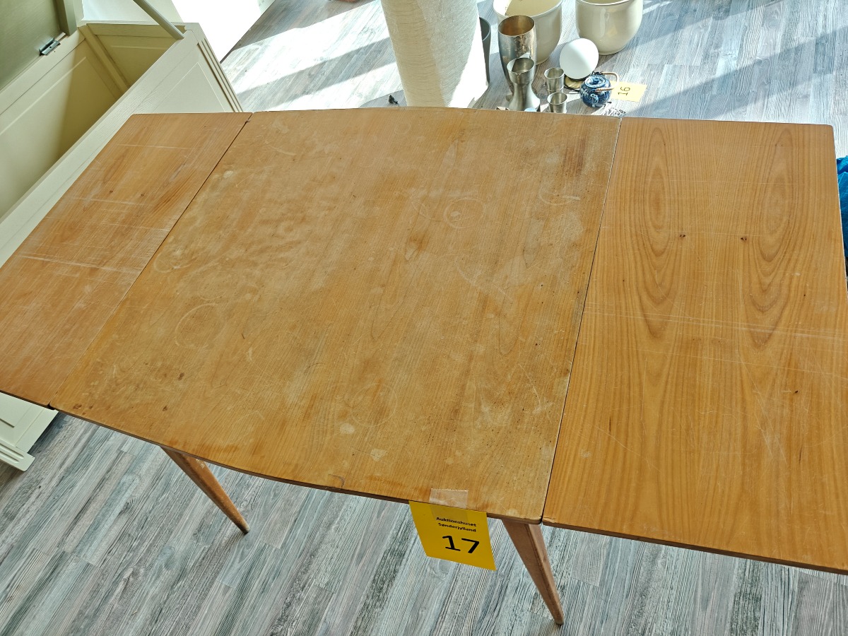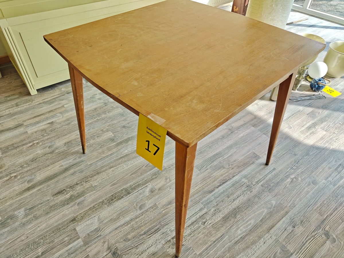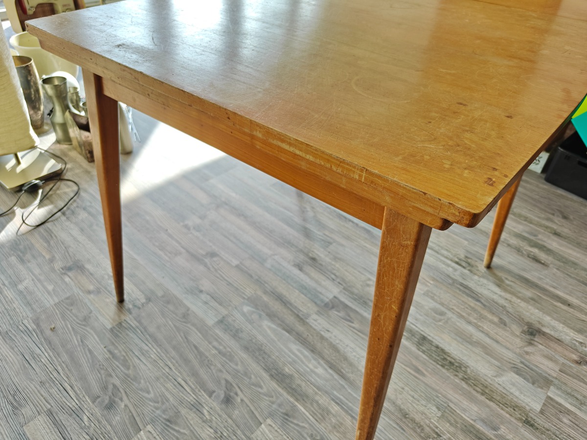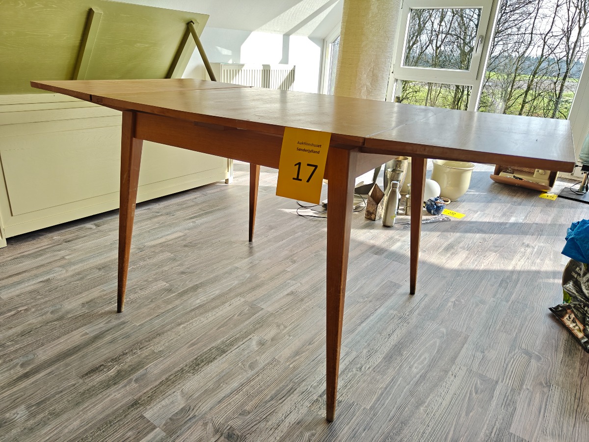 Spisebord i bøg med udtræksplader i hver ende. Måler 86 x 83 x 75 høj. Udtrukket 153 lang. Slidt på pladerne og med brugsspor. Brugt