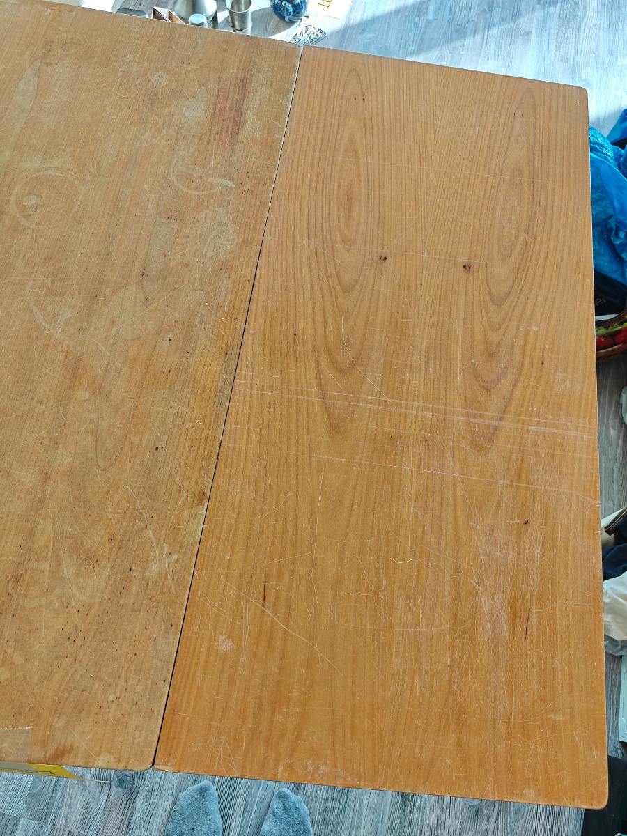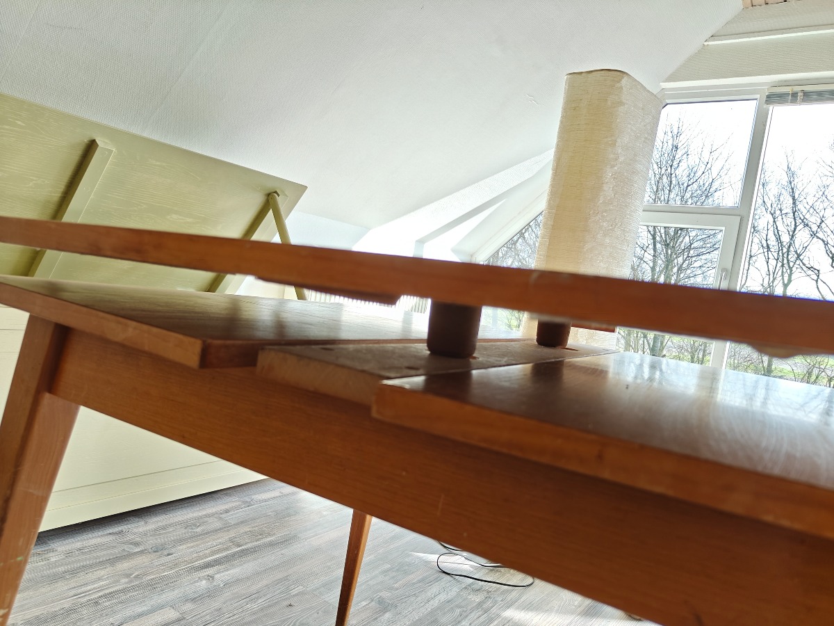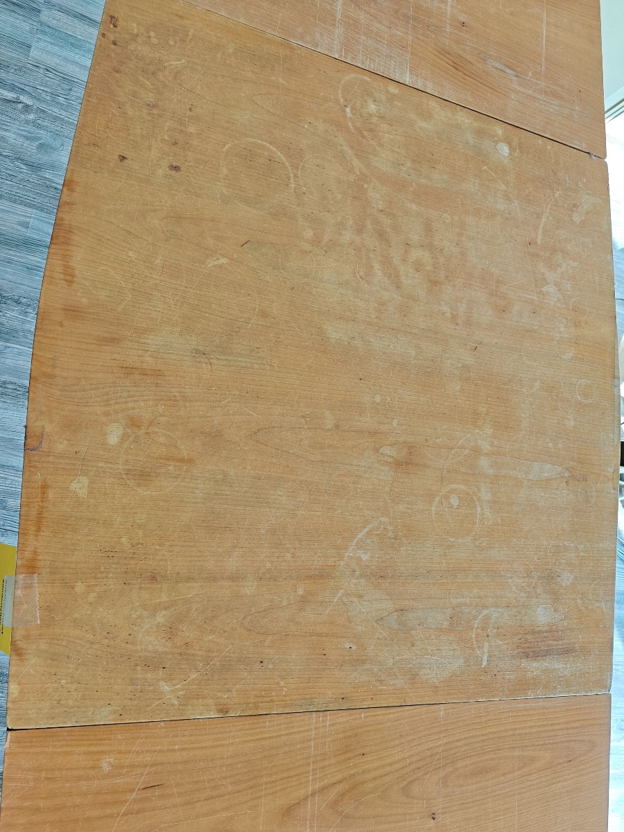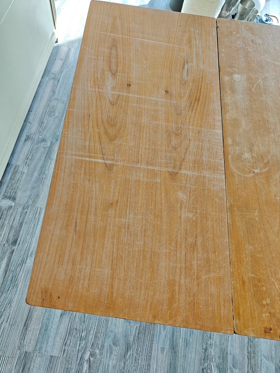 Spisebord i bøg med udtræksplader i hver ende. Måler 86 x 83 x 75 høj. Udtrukket 153 lang. Slidt på pladerne og med brugsspor. Brugt