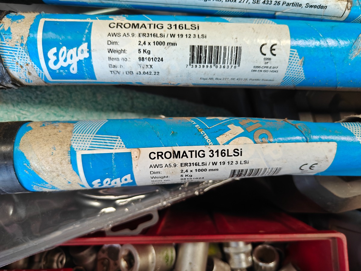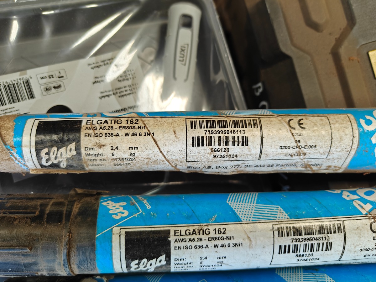 TIG svejsetråd 2 pk til rustfri CROMATIG 316LSI uåbnet  2 pk. ELGATIG 162 denene pakke er åbnet,  Kasse med toppe til topnøgle og hydraulik koblinger. Sælges for virksomhed.