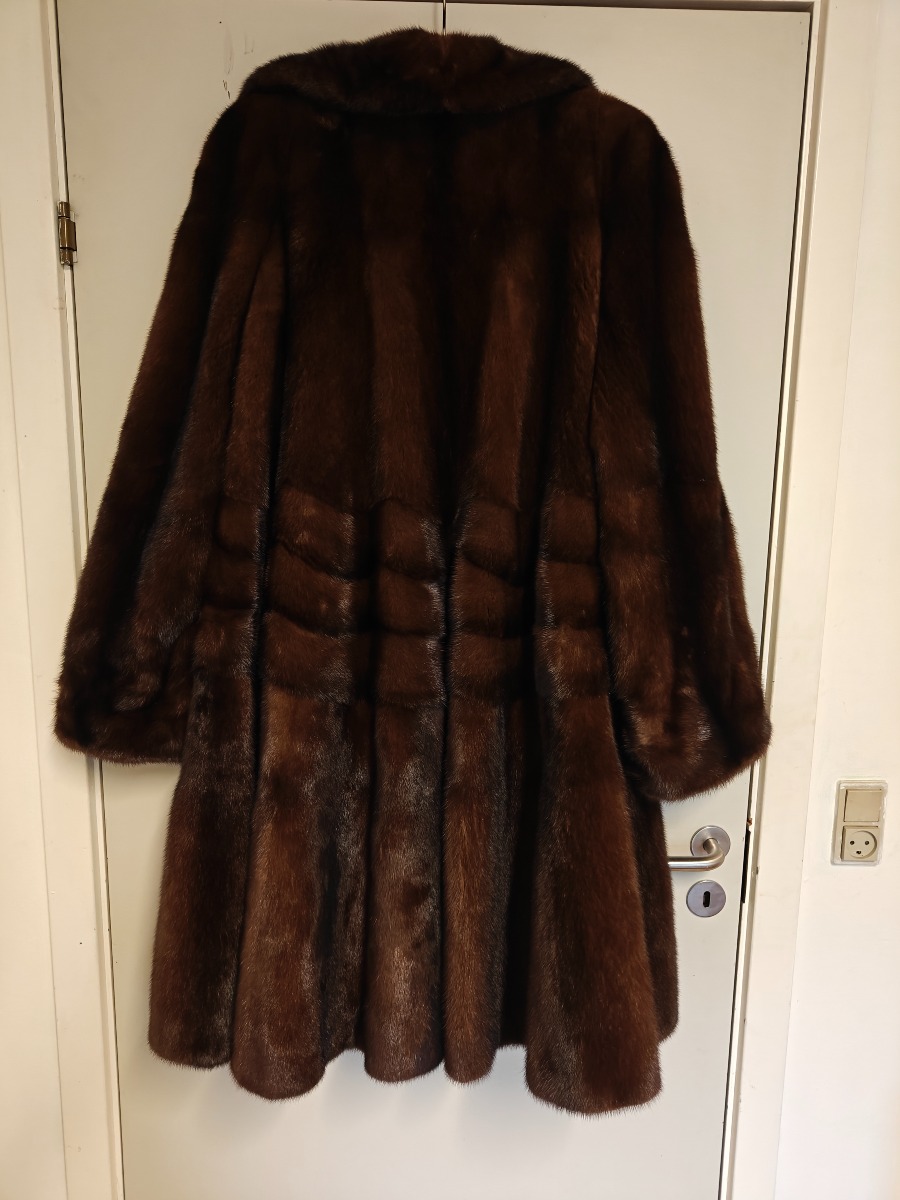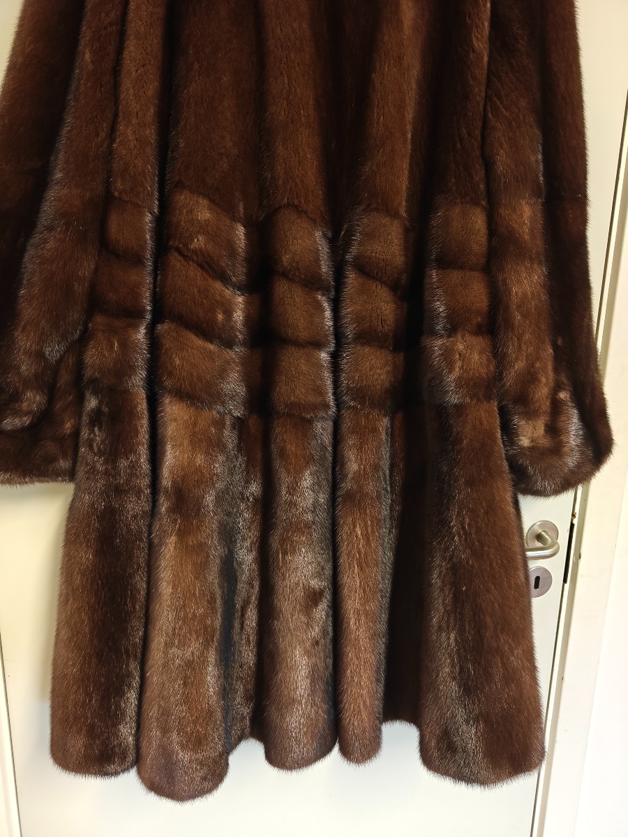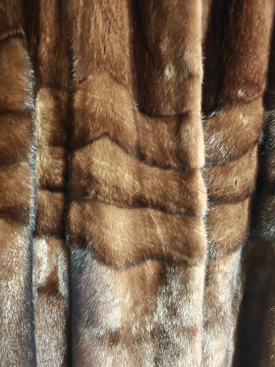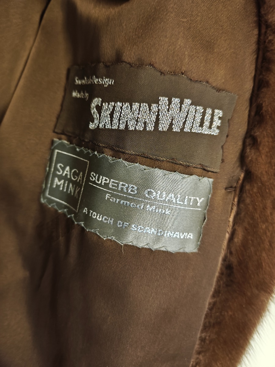Skinnwille pelsfrakke af Sagamink. Font med hægtelukning og indstikslommer. Fra privat eje. Minimalt slid.