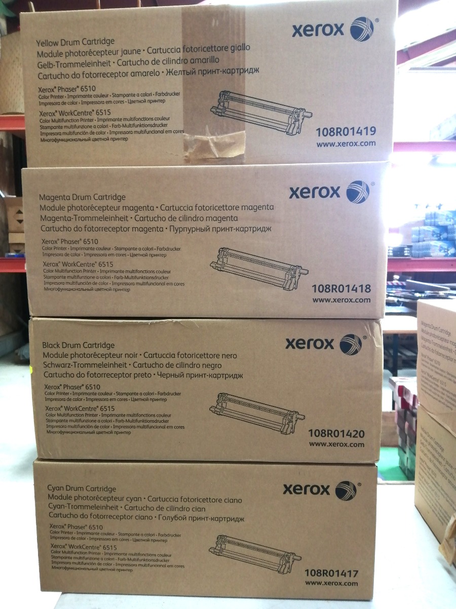 Sæt af Xerox Phaser 6510 printer tromler - Yellow (108R01419 - CT351097), Magenta (108R01418 - CT351096), Black (108R01420 - CT351094) og Cyan (108R01417 - CT351095). Patronerne har en kapacitet helt op til 48.000 sider og er kompatibel med Xeros Workcenter 6515 og Xerox Phaser 6510. Nypris 3.241 kr. Ubrugte.