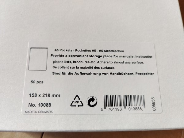 2 kasser med 10 pakker á 50 stk. A5 plastlommer med lim/klister på bagside. Lige til at trække af og sætte på pakke. Plastlommerne måler 158 x 218 mm. Vejl. udsalgspris 135,- kr/pakke. Samlet ny pris 2700,- kr. Produceret i DK. Ubrugte, +MOMS