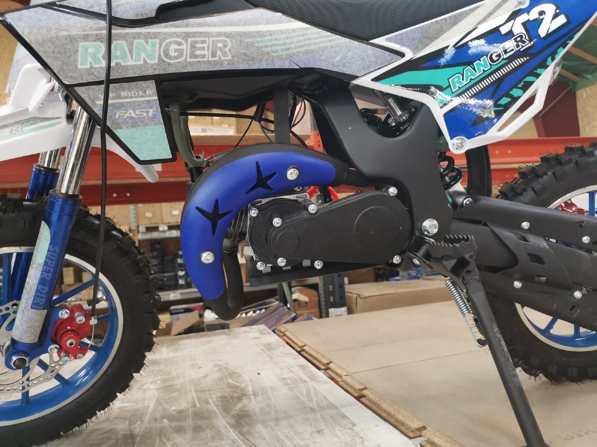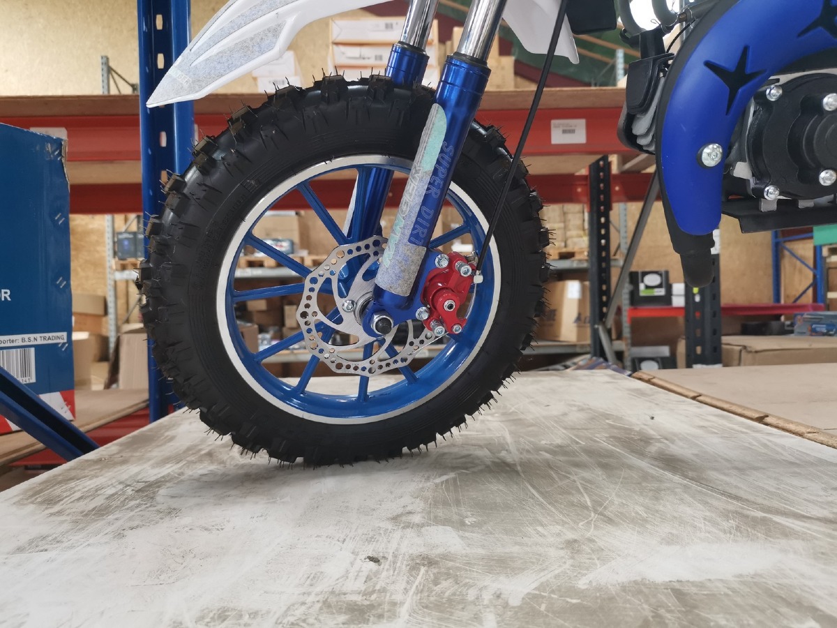 Blå crosser / dirtbike - 49cc og 10 tommer. Automatisk gearskifte. Med afbryderarmbånd, som stopper motorcyklen i tilfælde af fald. Motor: 1 cylinder / 2 takt. Køling: luft. Hastighed: 45 km/t. Mål: H: ca. 60 cm til sæde & ca. 130 cm i længde. Usamlet, ubrugt.