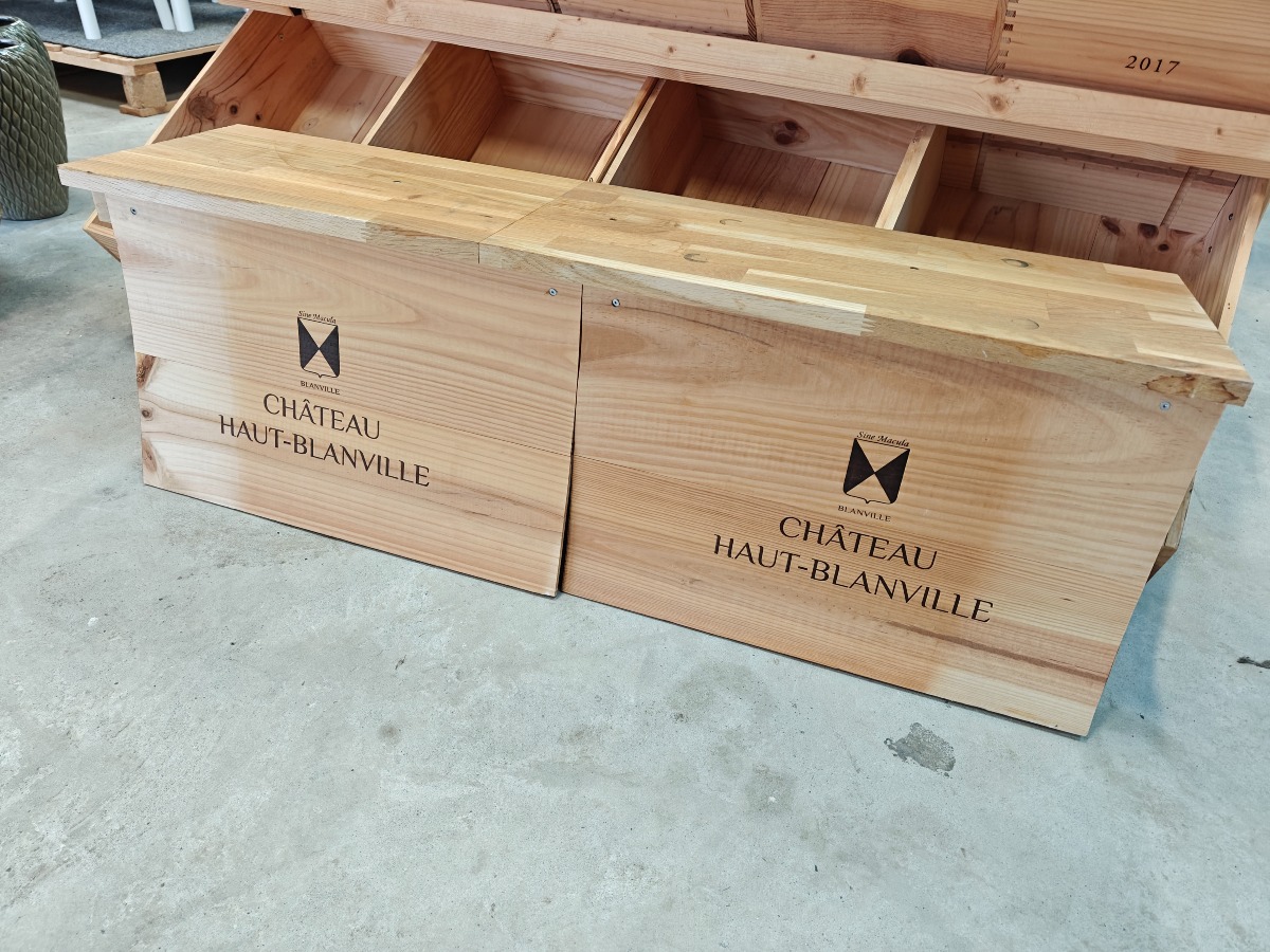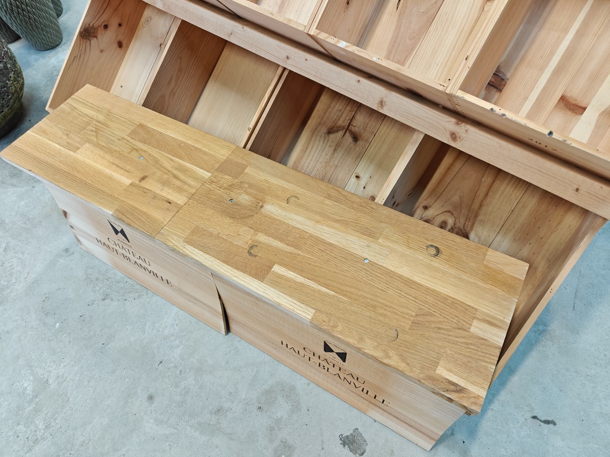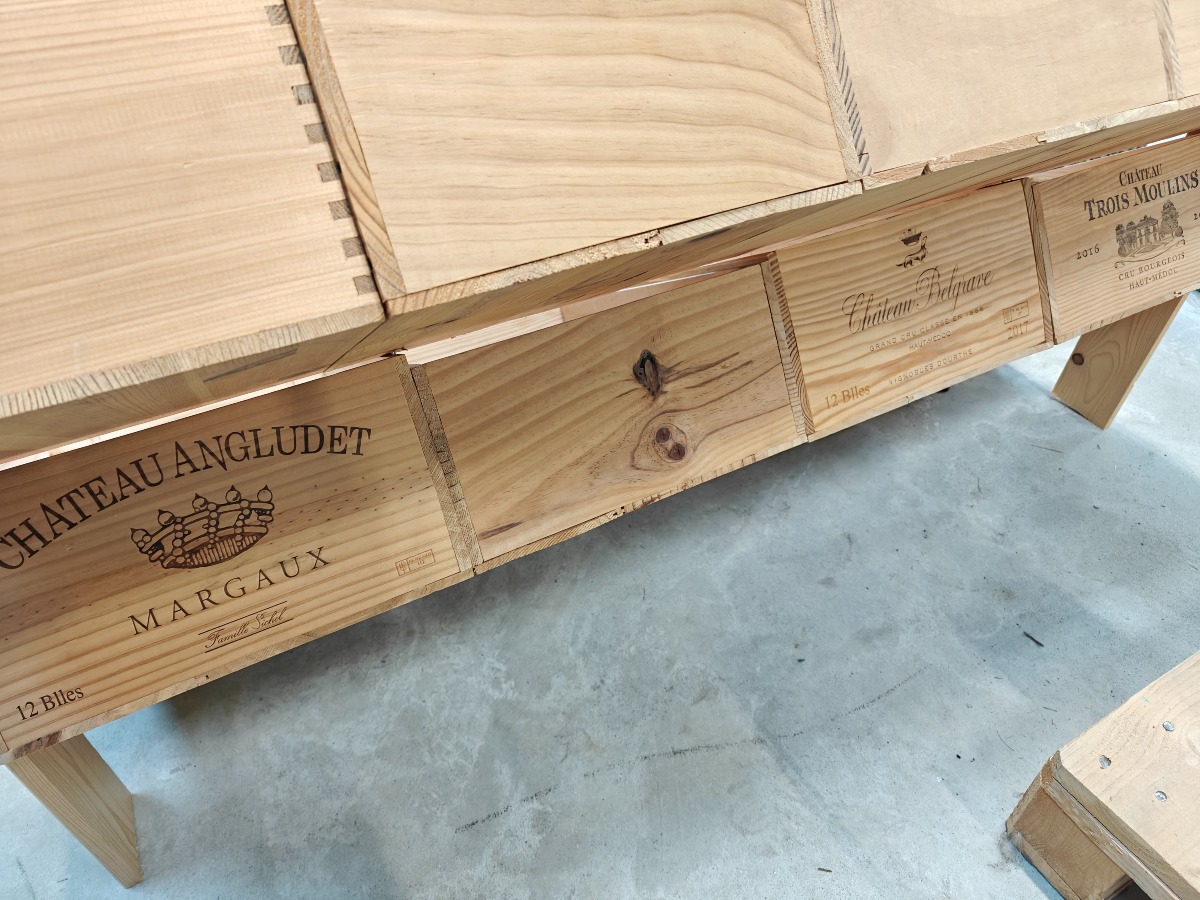 Reol og hylde lavet af vinkasser. Enkelte kasser med tryk. Mål for reol: H. 75, B. 135, D. 70 cm.