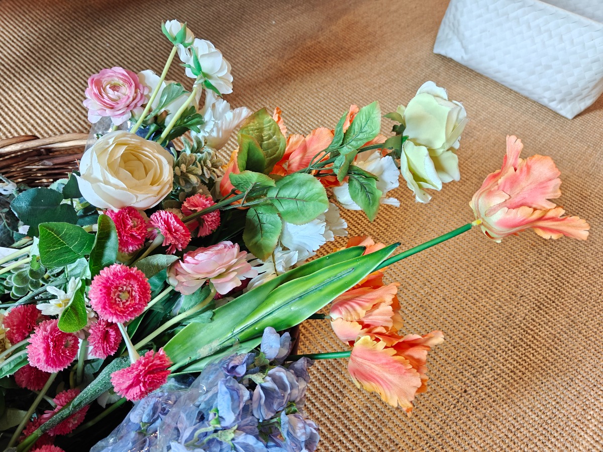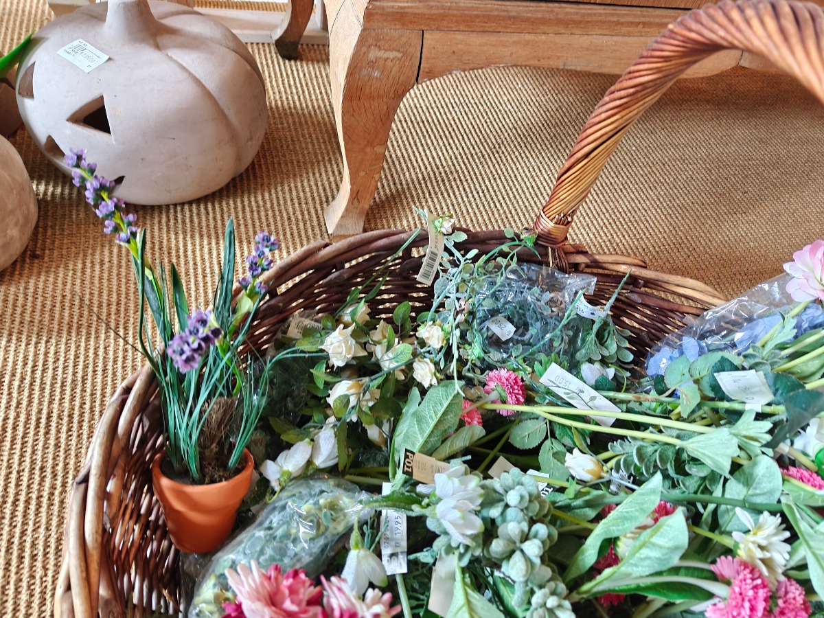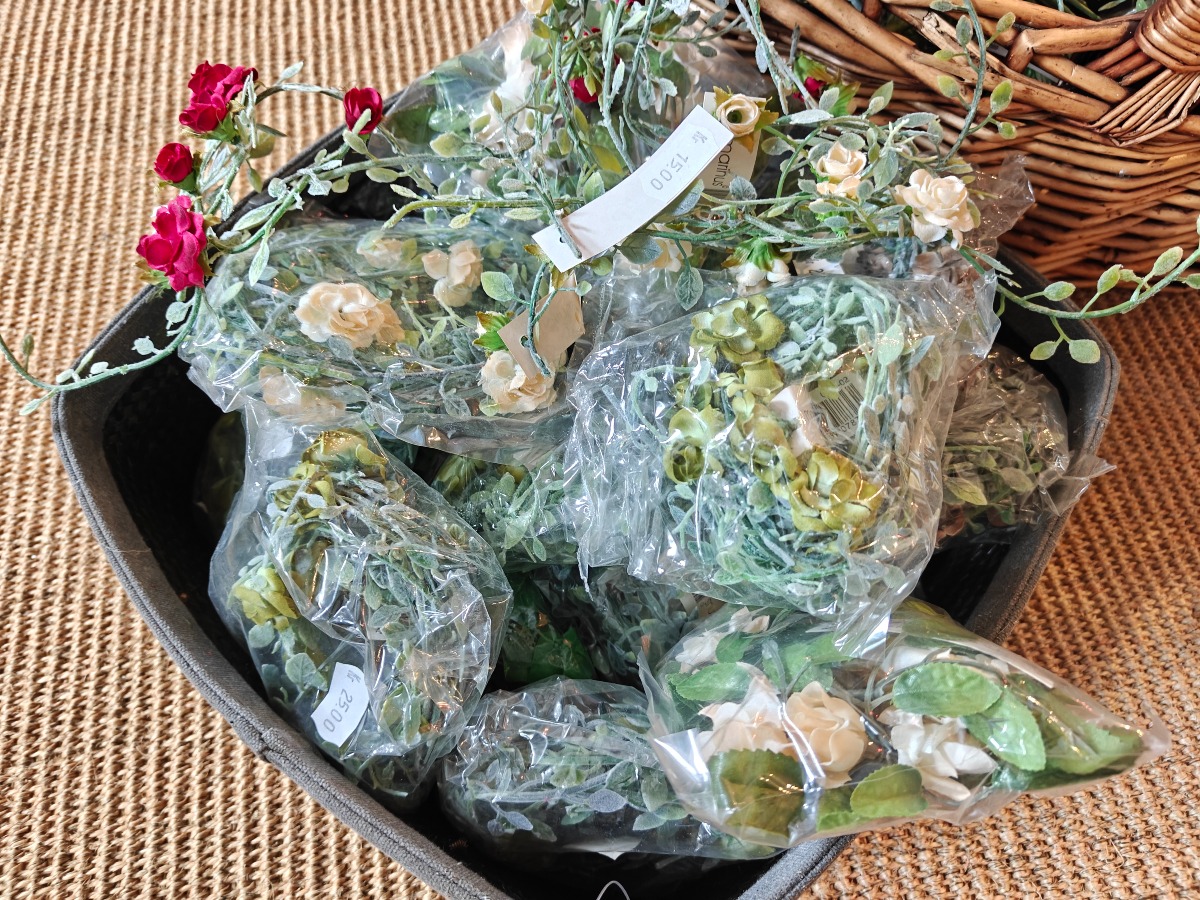 Kunstige blomster. Enkelte, ranker m.m. Varen stammer fra en nedlagt brugskunst-butik. Eventuelle brugsspor kan forekomme.