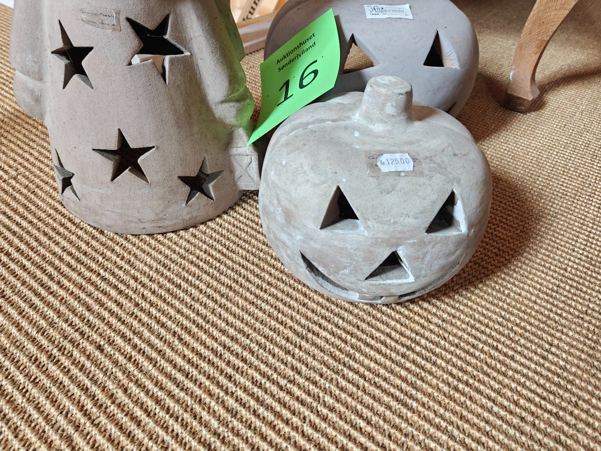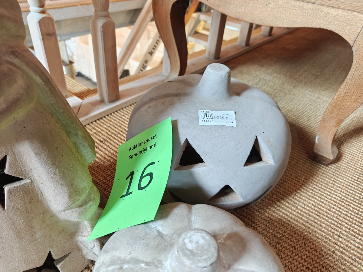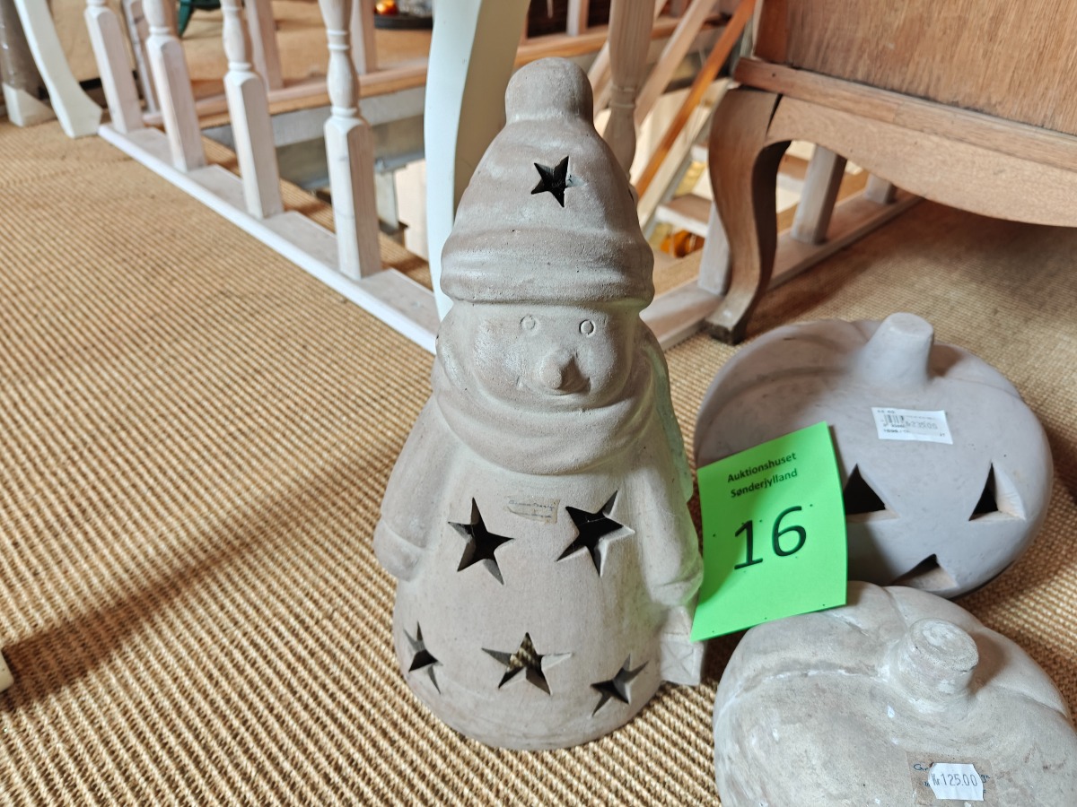 Udendørslygter i støbt materiale. Snemand og 2 græskarhover. H. for største 40 cm. Varen stammer fra en nedlagt brugskunst-butik. Eventuelle brugsspor kan forekomme.