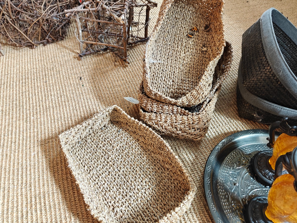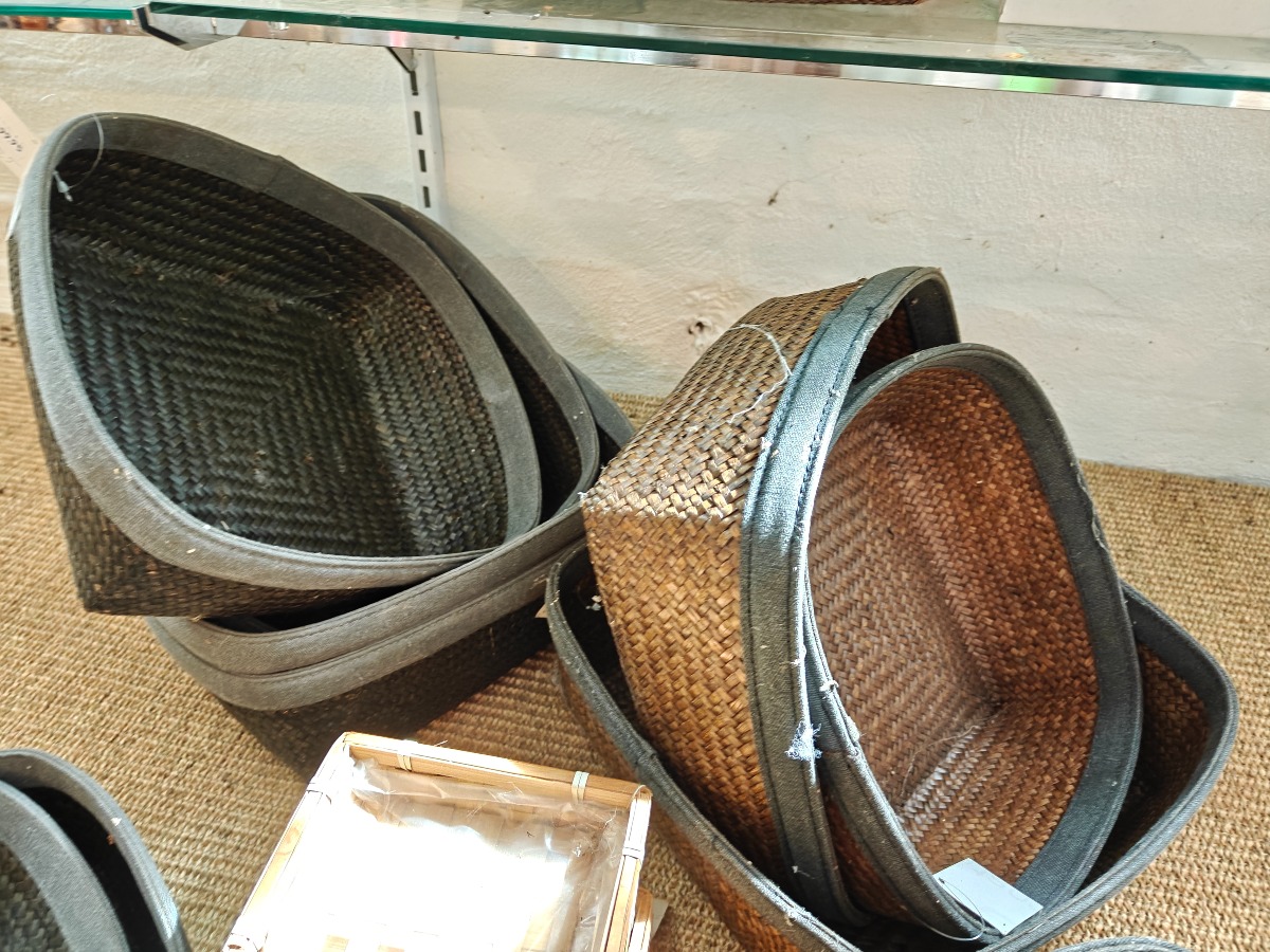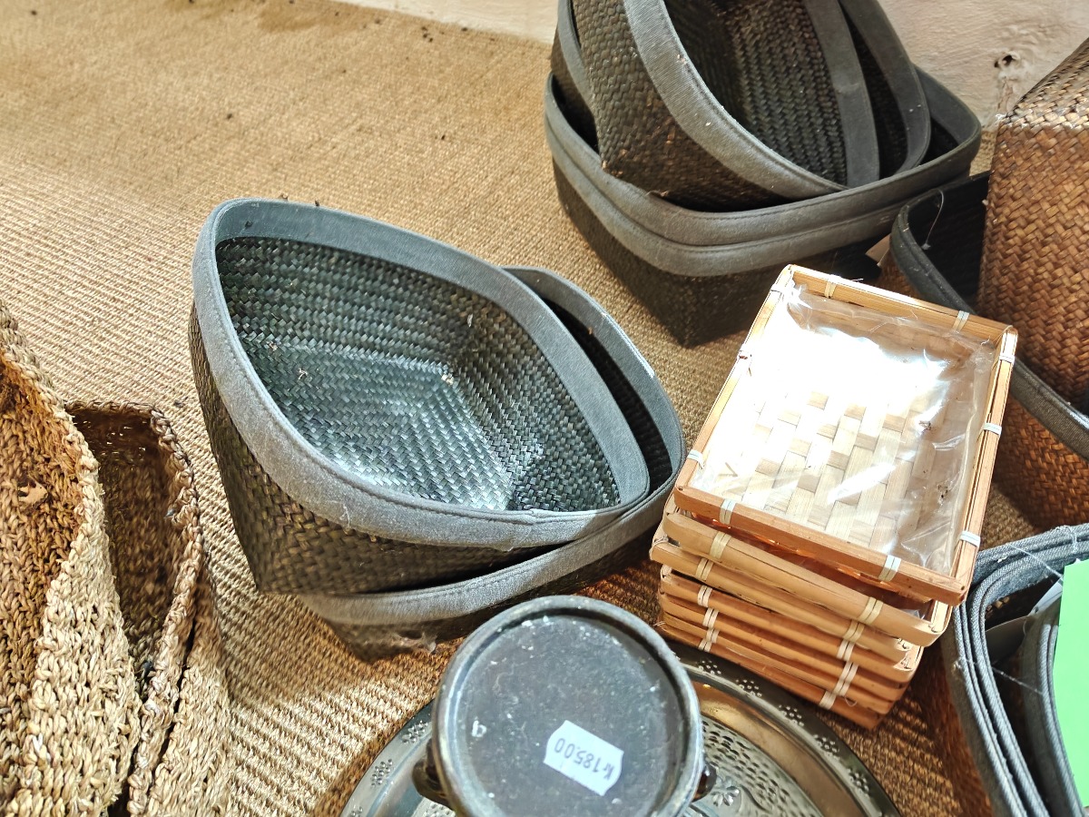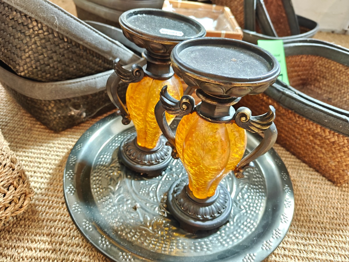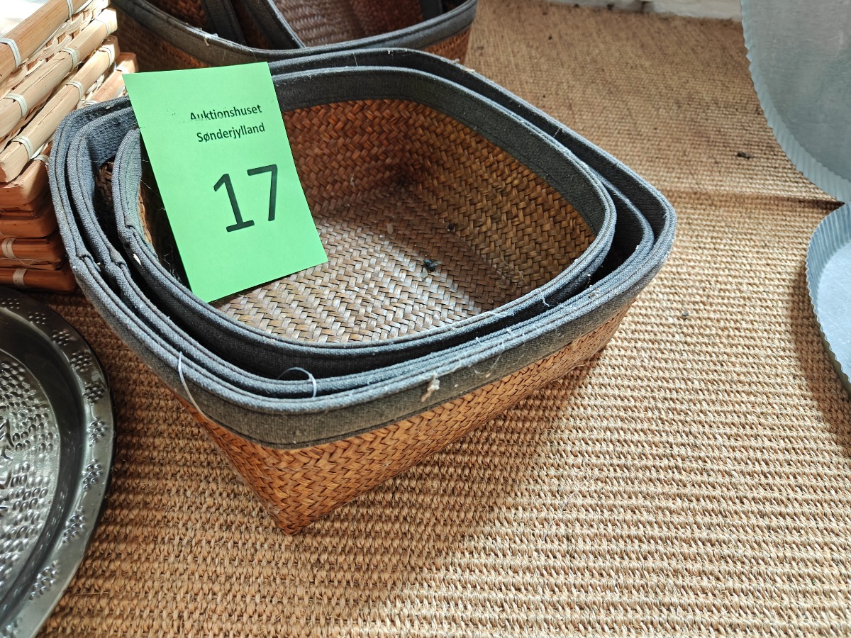 Samling af forskellige kurve. Rund metalbakke og 2 stager. Varen stammer fra en nedlagt brugskunst-butik. Eventuelle brugsspor kan forekomme.