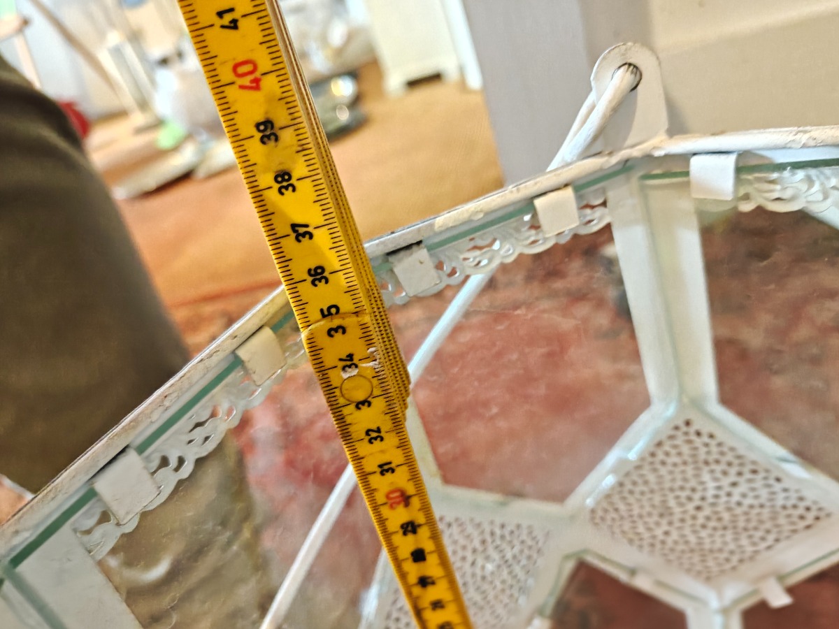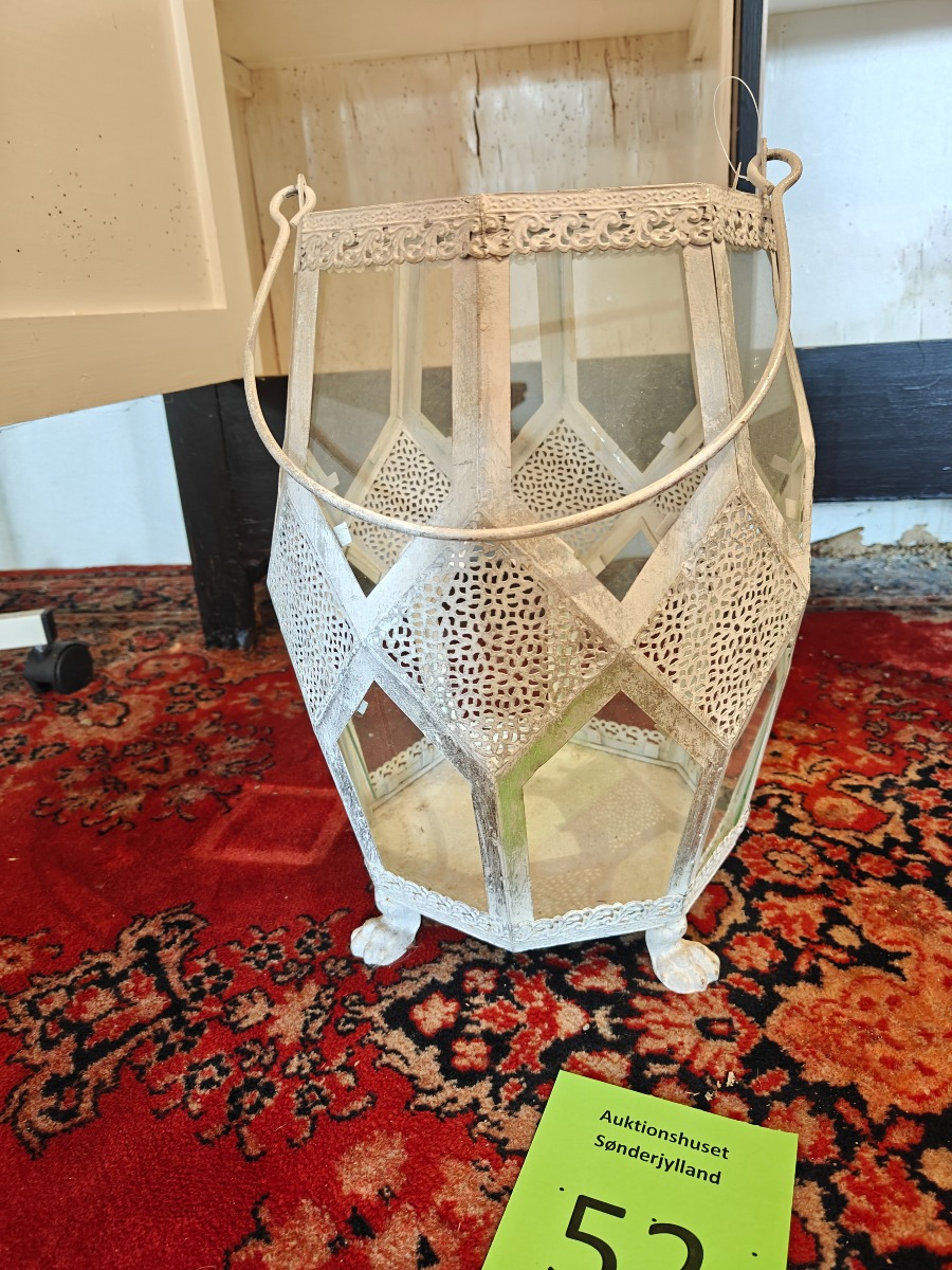 Lanterne af hvidlakeret metal. H. ca. 36 cm. Varen stammer fra en nedlagt brugskunst-butik. Eventuelle brugsspor kan forekomme.