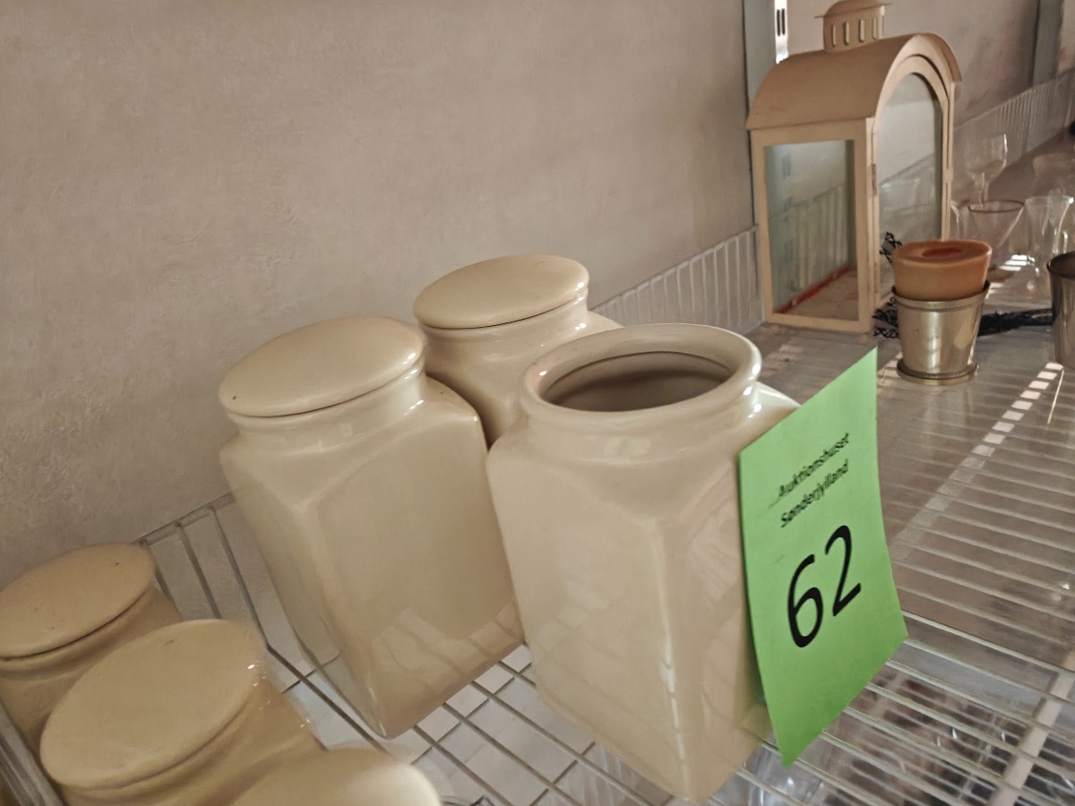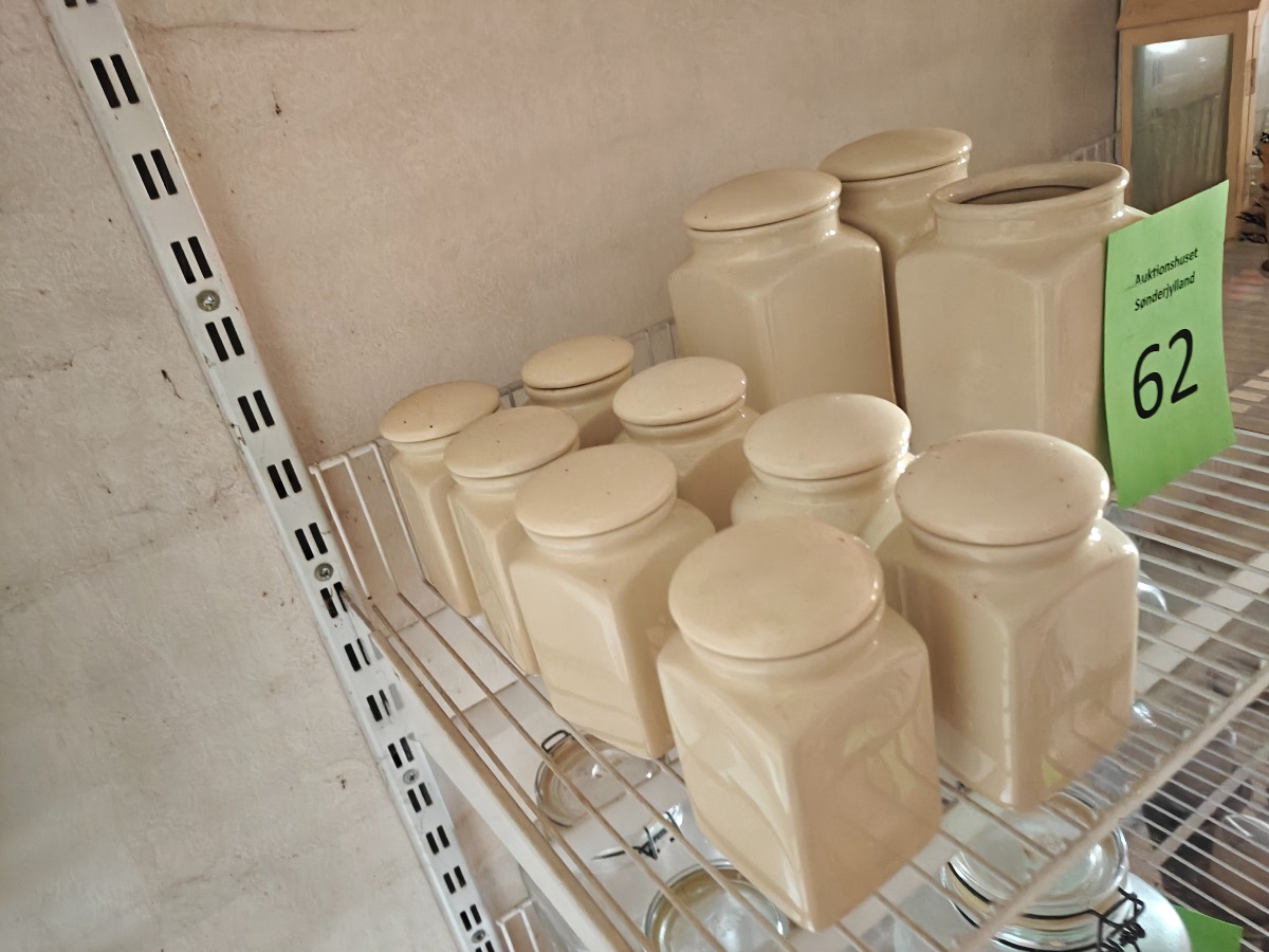 Forrådskrukker af cremefarvet fajance. Ene af de store mangler et låg. Varen stammer fra en nedlagt brugskunst-butik. Eventuelle brugsspor kan forekomme.