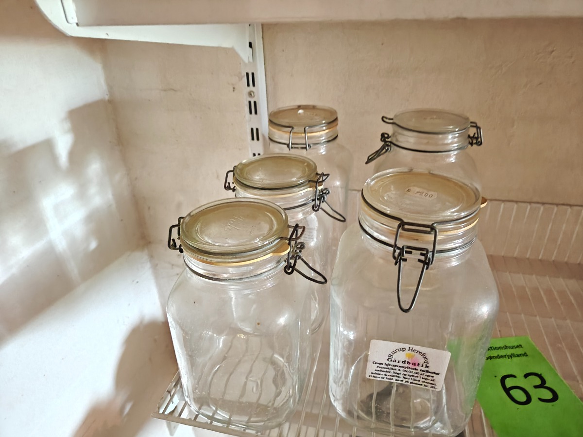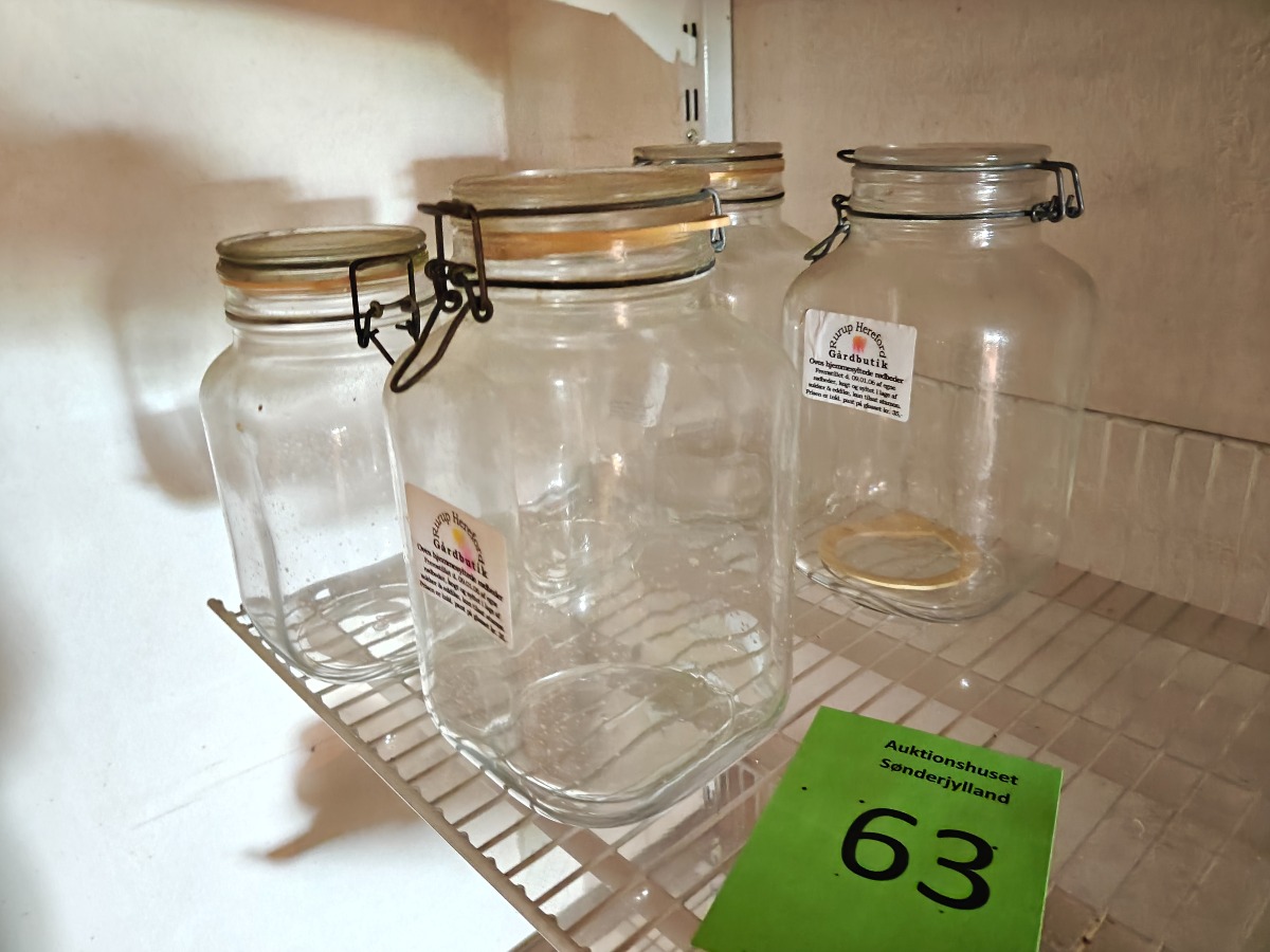 5 store sylteglas. H: 25 cm. Varen stammer fra en nedlagt brugskunst-butik. Eventuelle brugsspor kan forekomme.