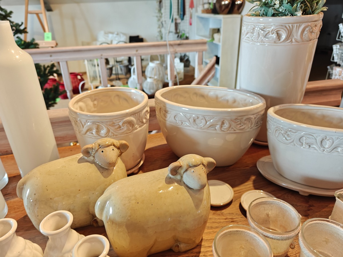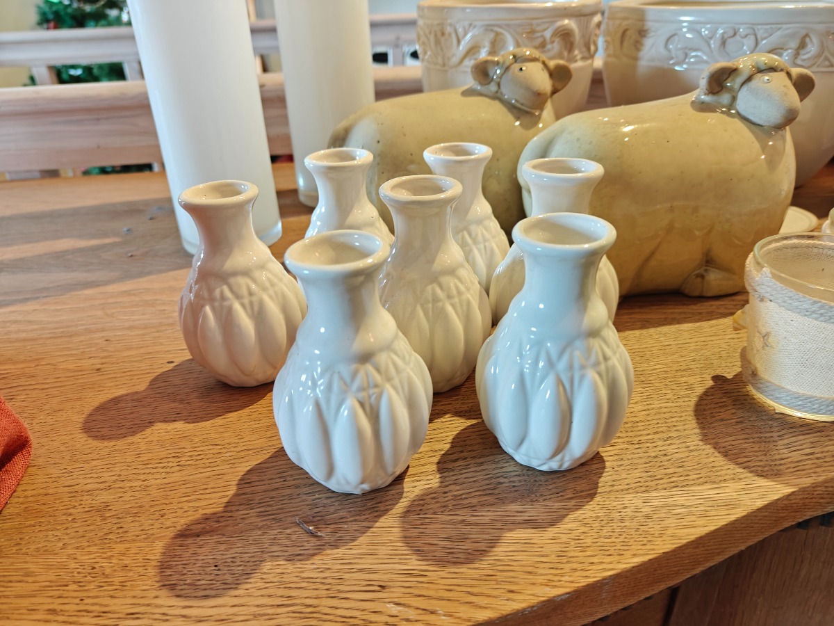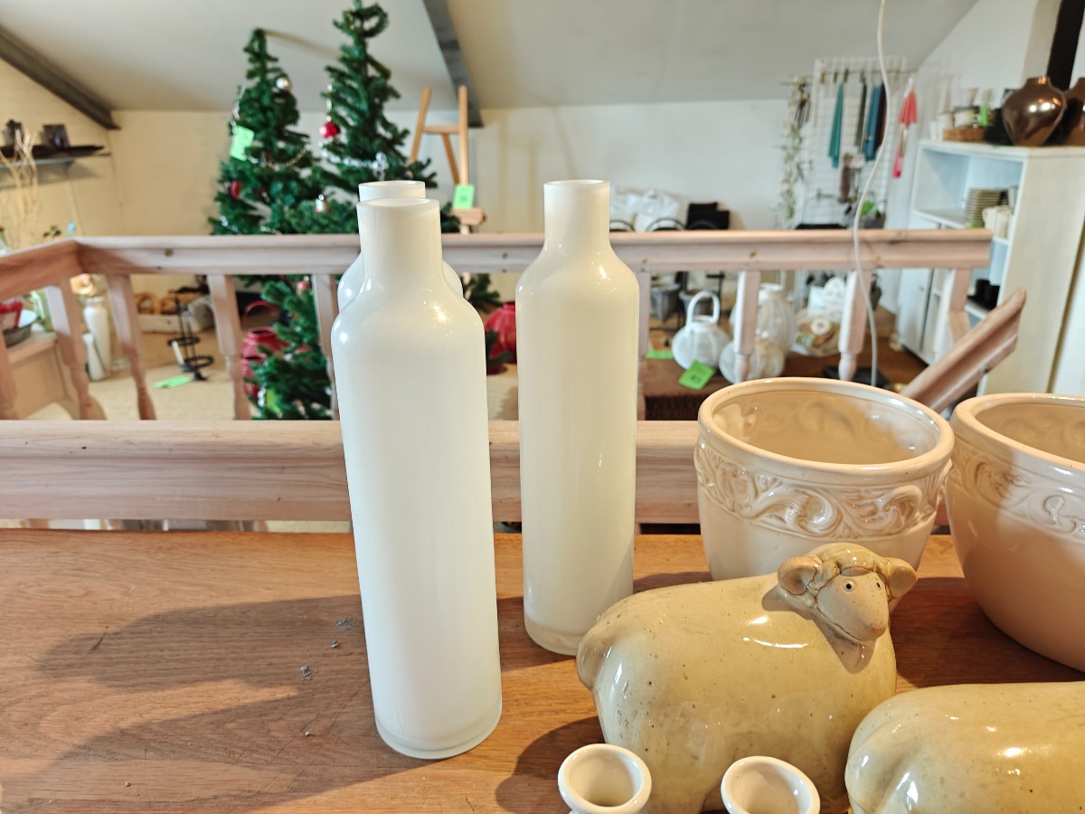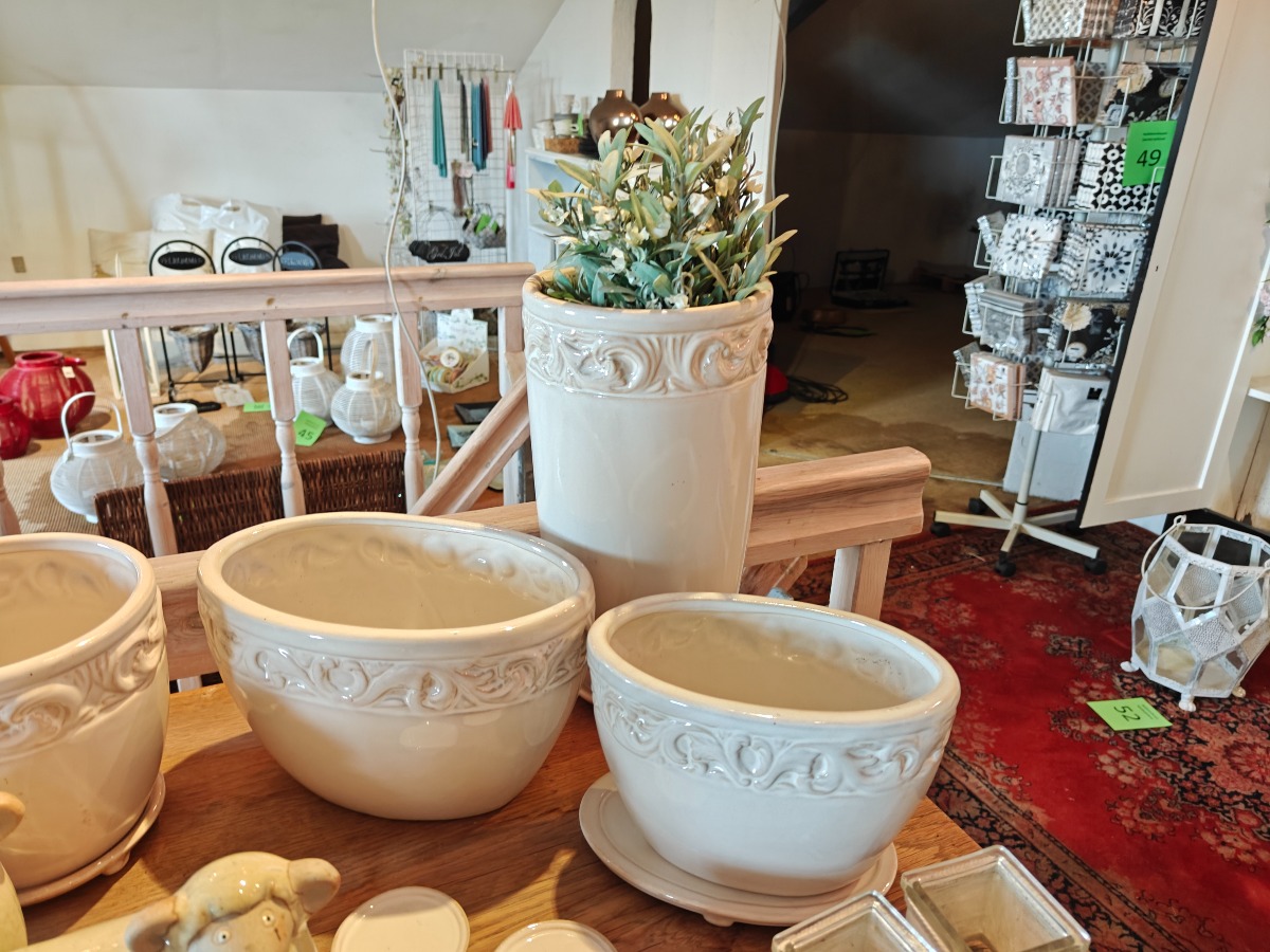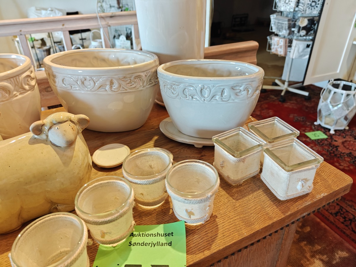 Genstande i hvid og cremefarvet. Potteskjulere, vaser, stager m.m. Varen stammer fra en nedlagt brugskunst-butik. Eventuelle brugsspor kan forekomme.