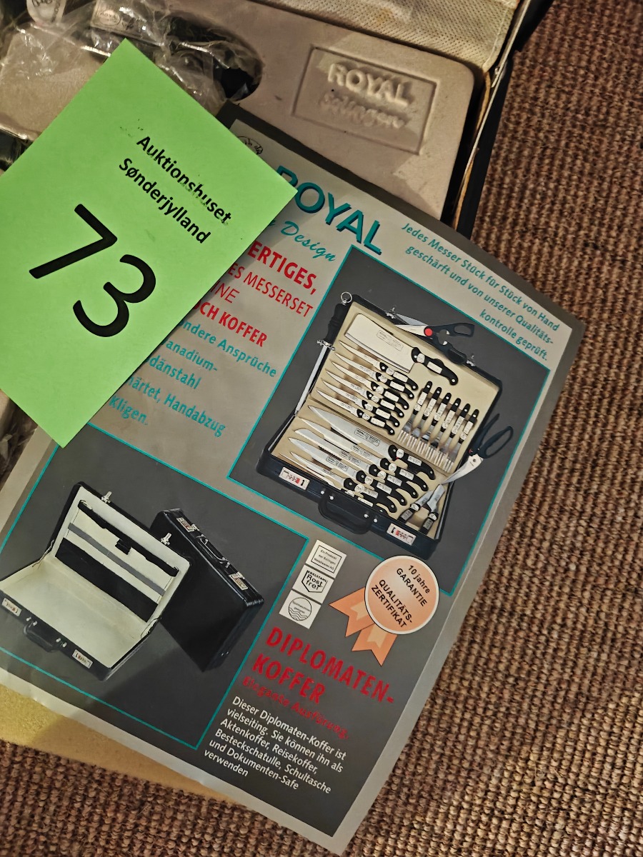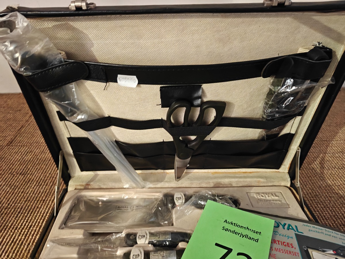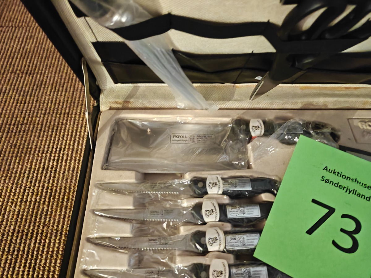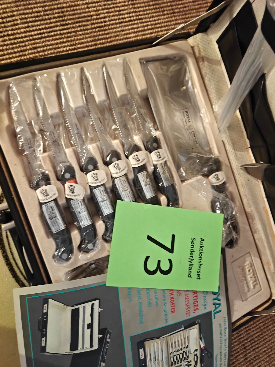 Royal knivsæt. Bestående af forskellige køkkenknive og steak-bestik. Varen stammer fra en nedlagt brugskunst-butik. Eventuelle brugsspor kan forekomme.