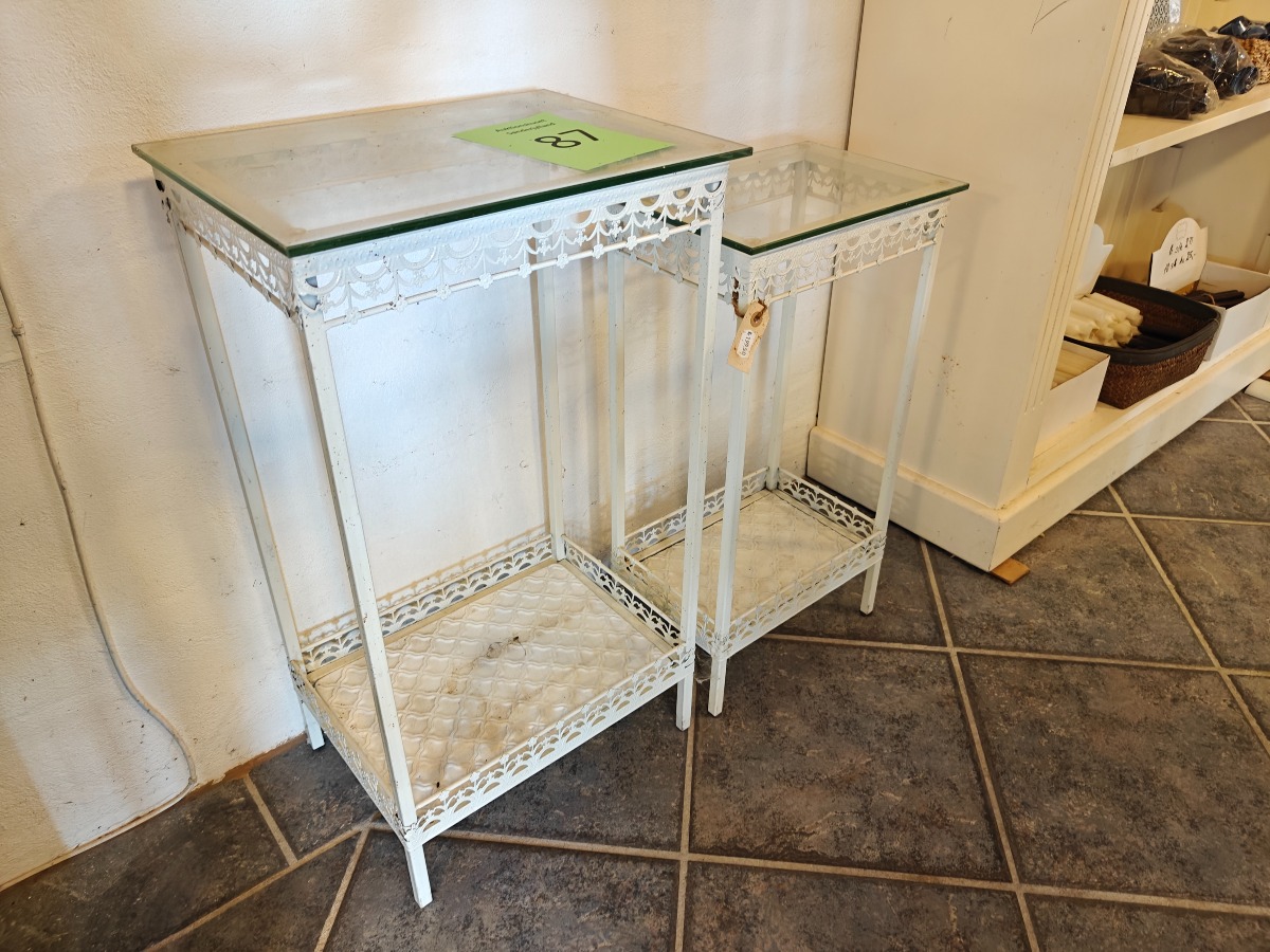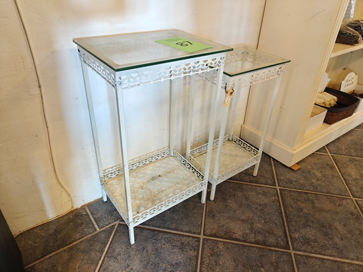 2 små sidebordeaf metal og glas. H. for største 68 cm. Varen stammer fra en nedlagt brugskunst-butik. Eventuelle brugsspor kan forekomme.
