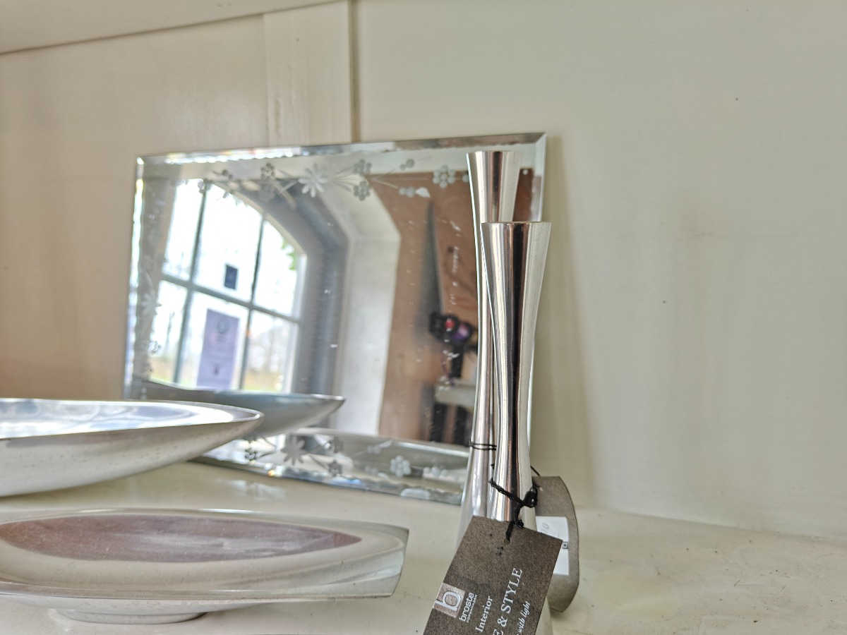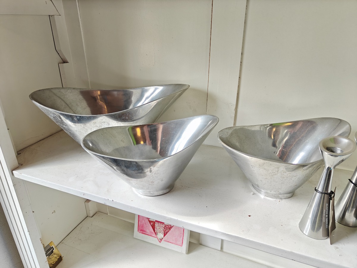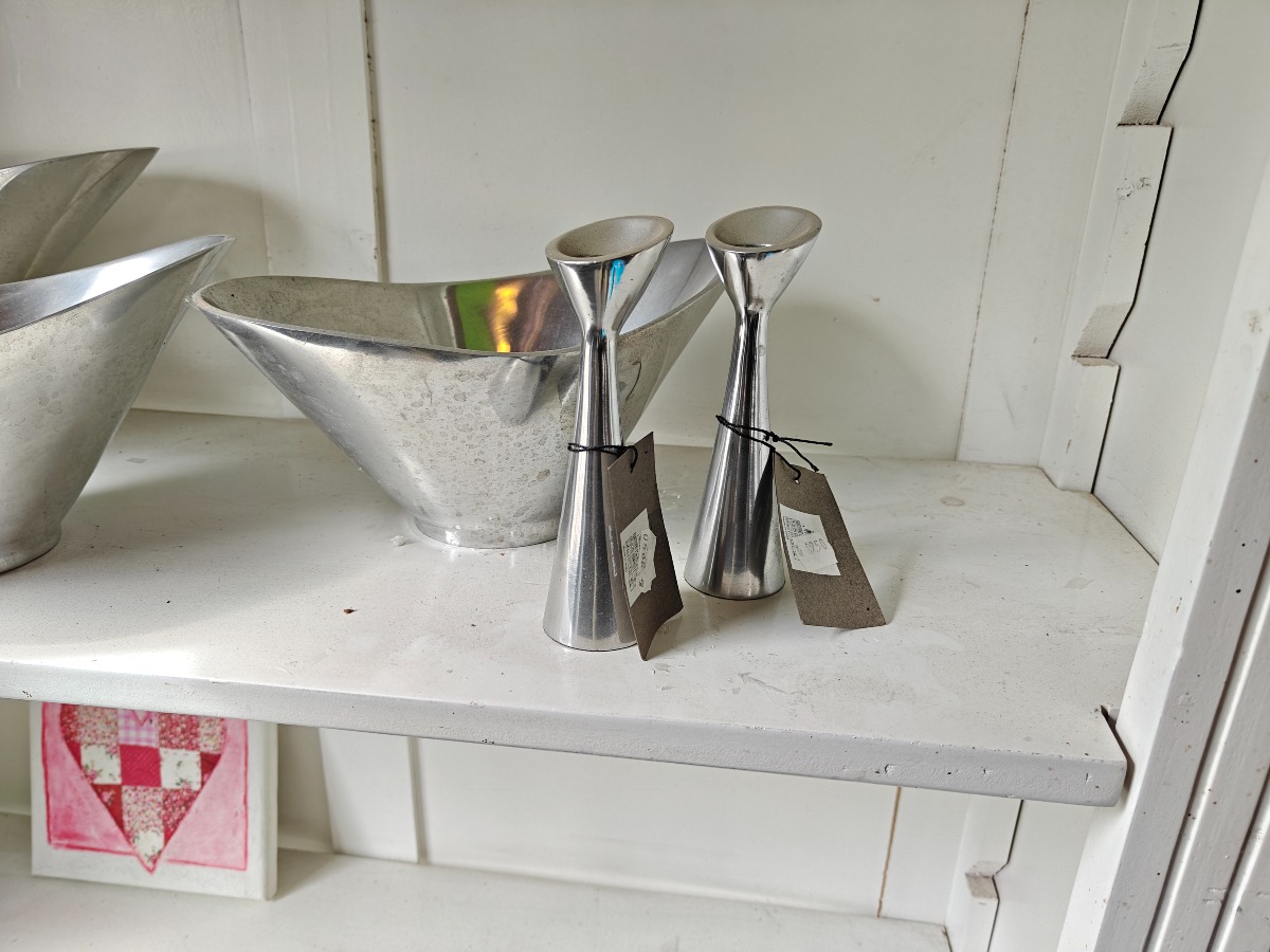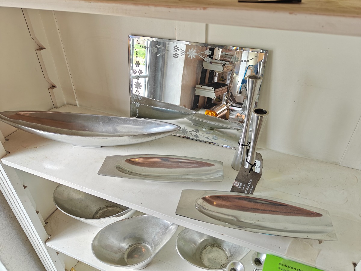 Forskellige genstande af poleret metal. Skåle, fade og stager. Varen stammer fra en nedlagt brugskunst-butik. Eventuelle brugsspor kan forekomme.