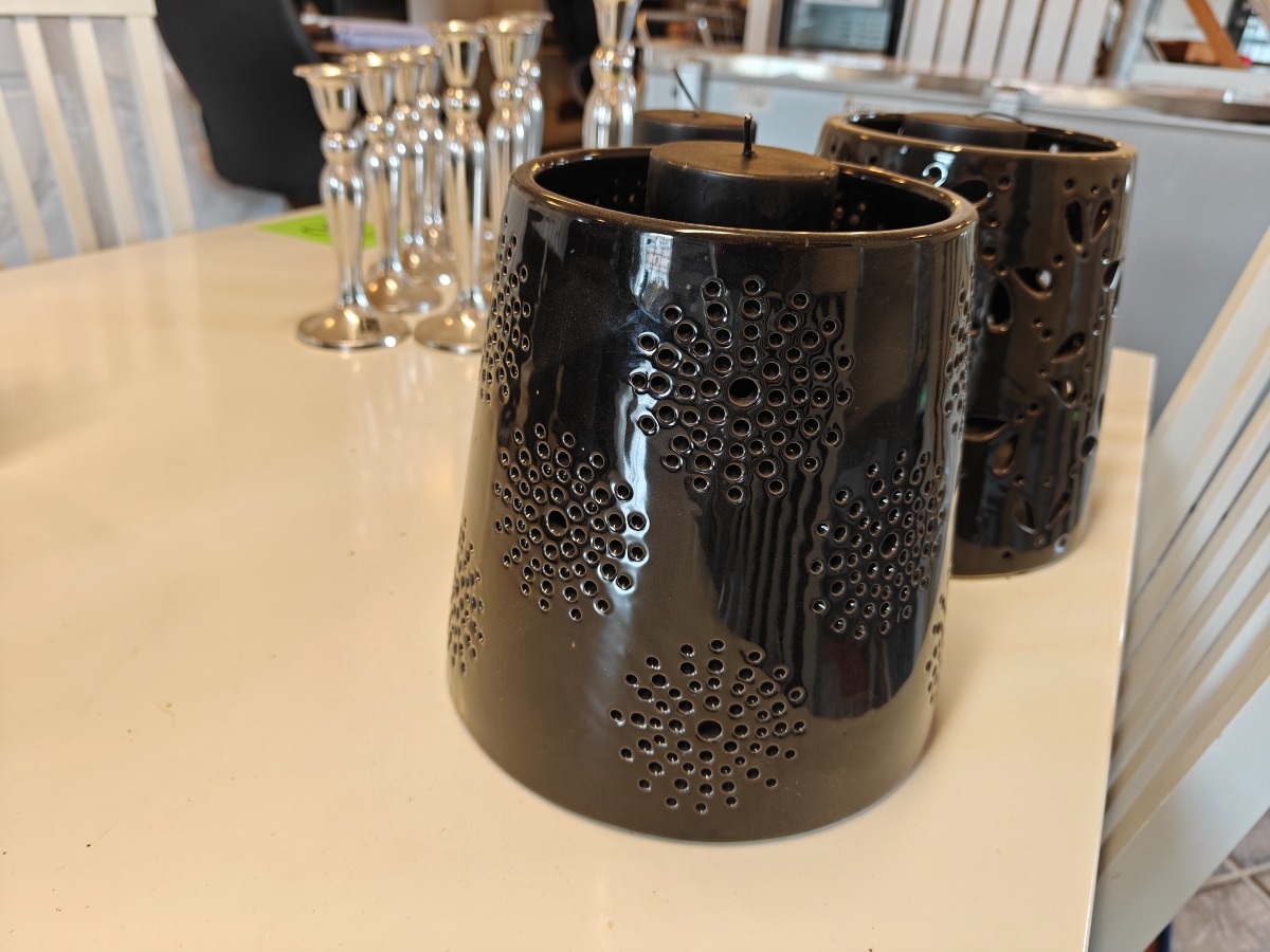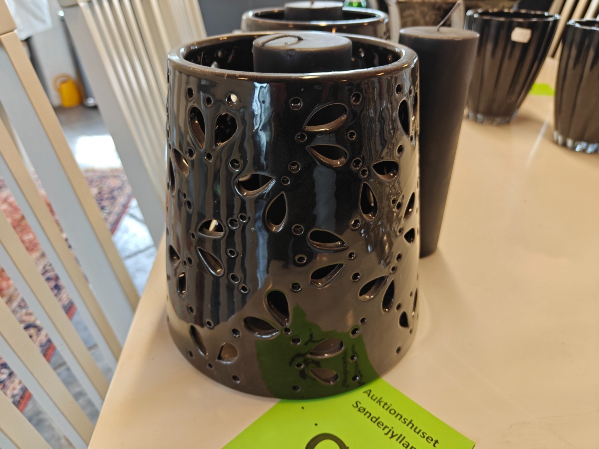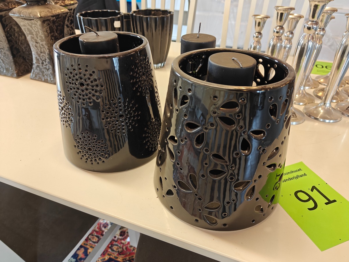 Sorte lysholdere af fajance. Varen stammer fra en nedlagt brugskunst-butik. Eventuelle brugsspor kan forekomme.