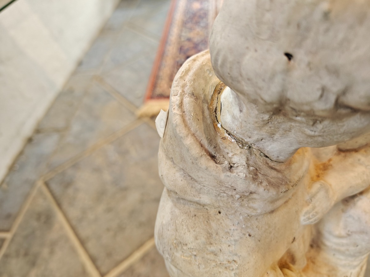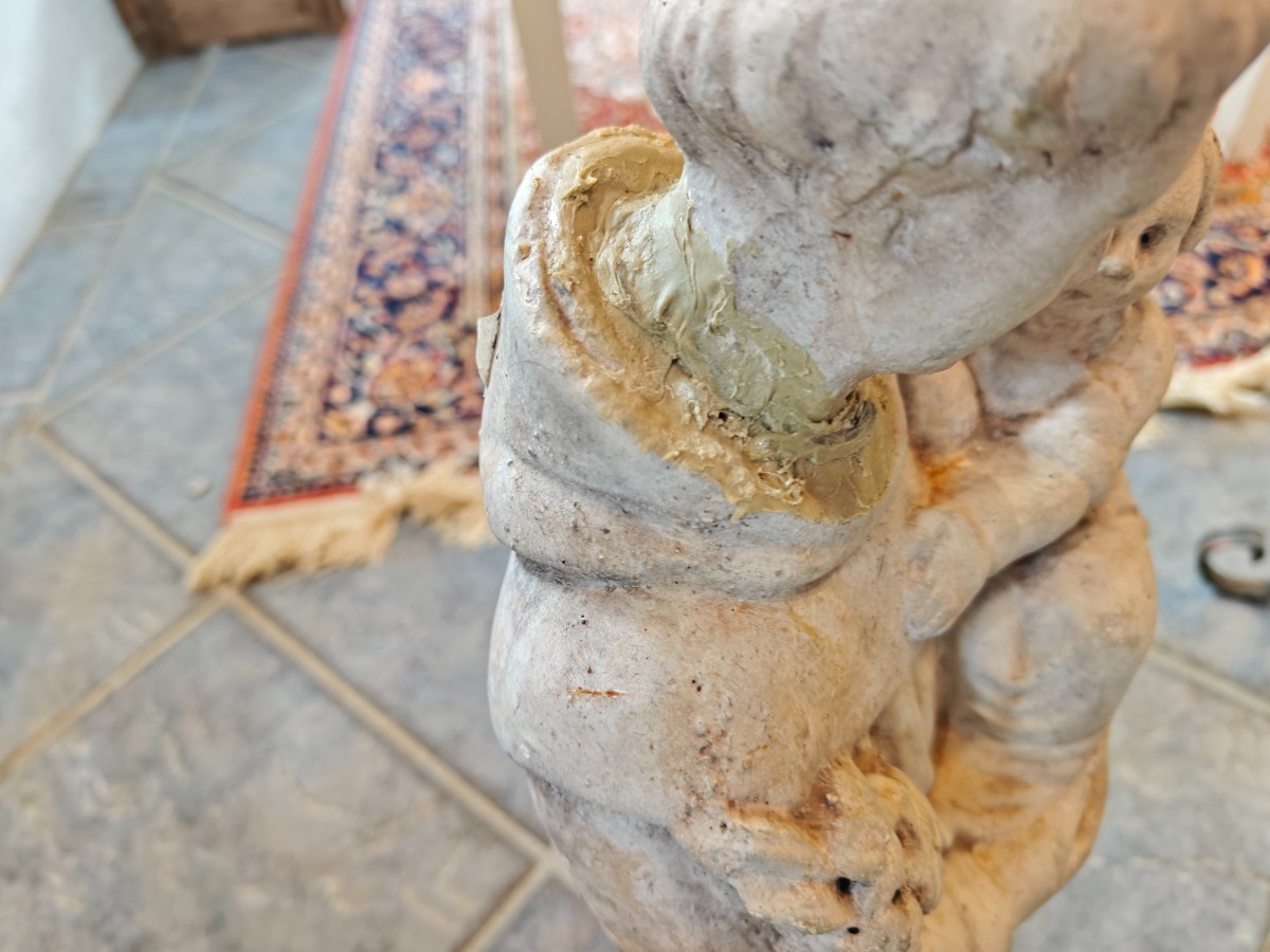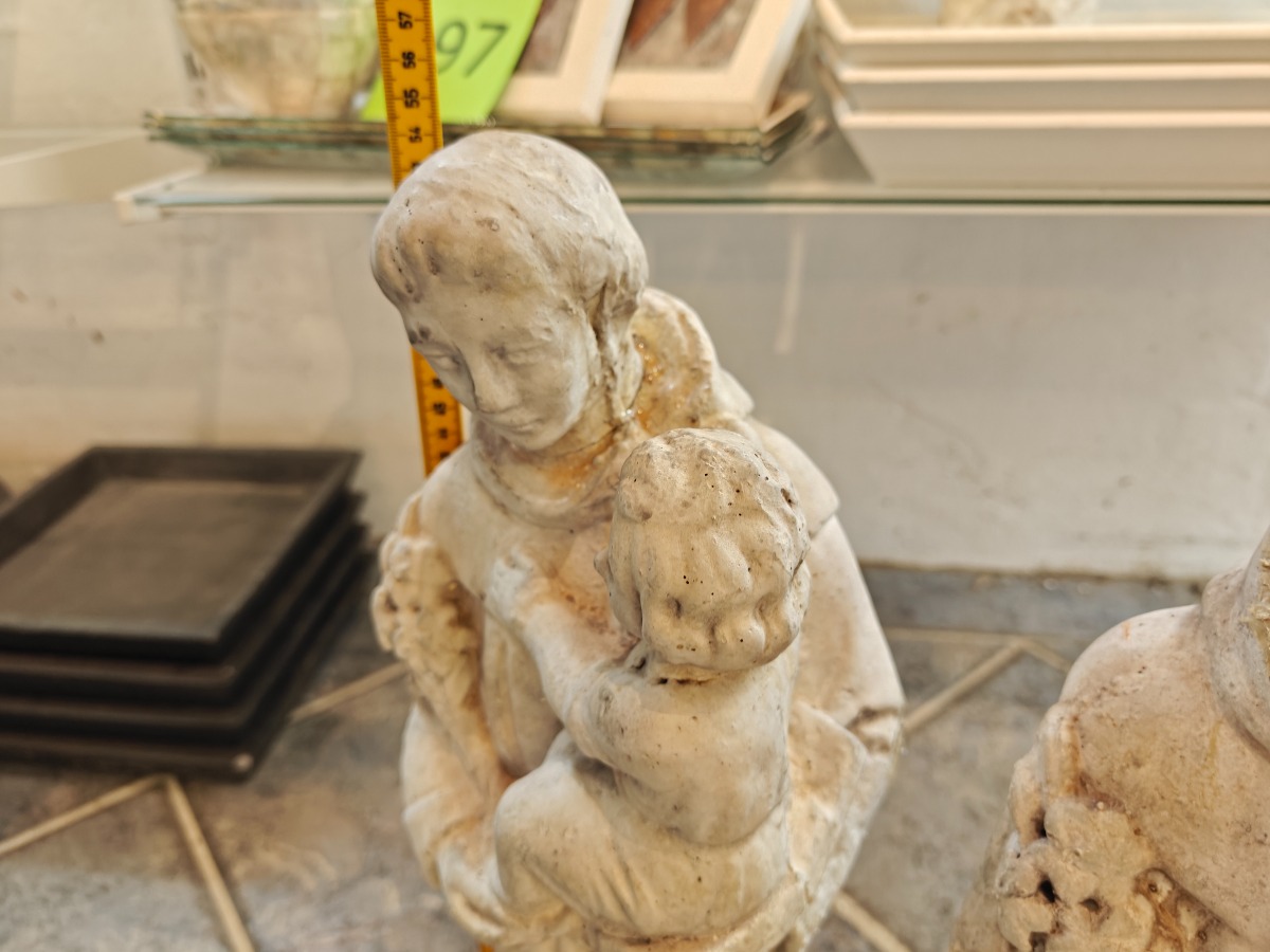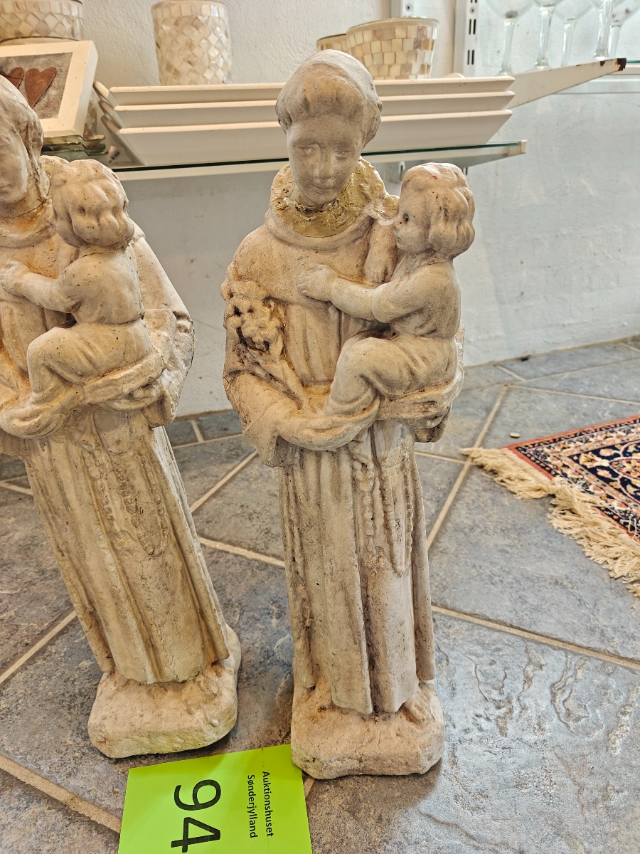 Sankt Antonius fra Padova, der holder Jesusbarnet. Støbt materiale. Begge med rep på hoveder. H. 55 cm. Varen stammer fra en nedlagt brugskunst-butik. Eventuelle brugsspor kan forekomme.