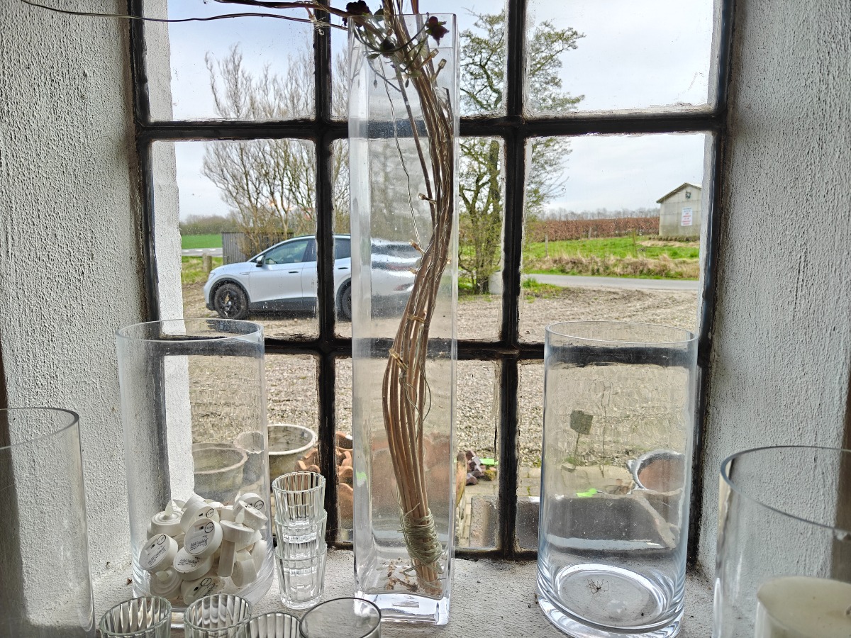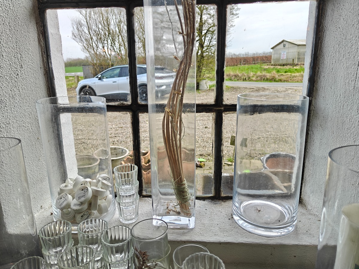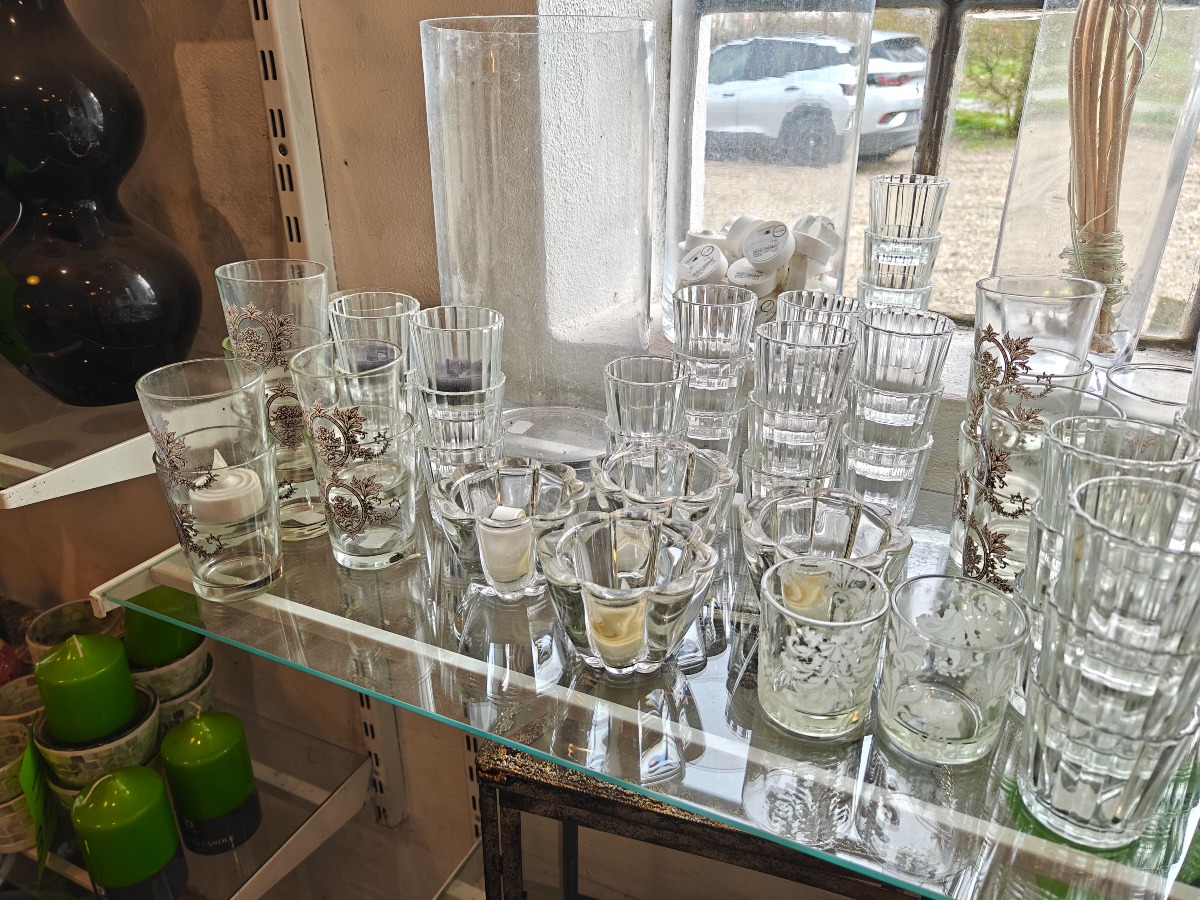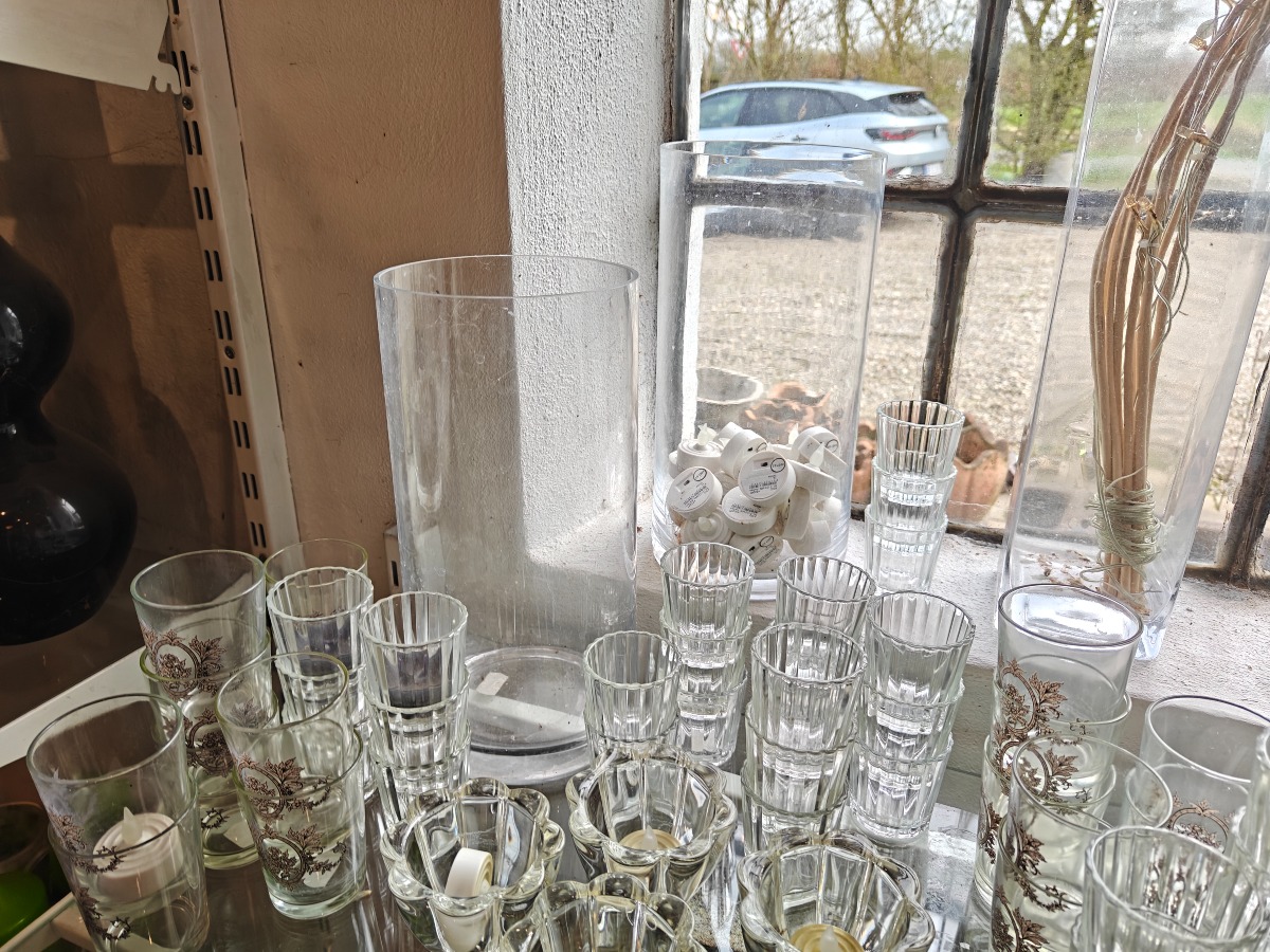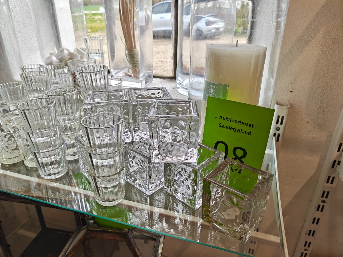 Lysglas og stager af klart glas. Varen stammer fra en nedlagt brugskunst-butik. Eventuelle brugsspor kan forekomme.