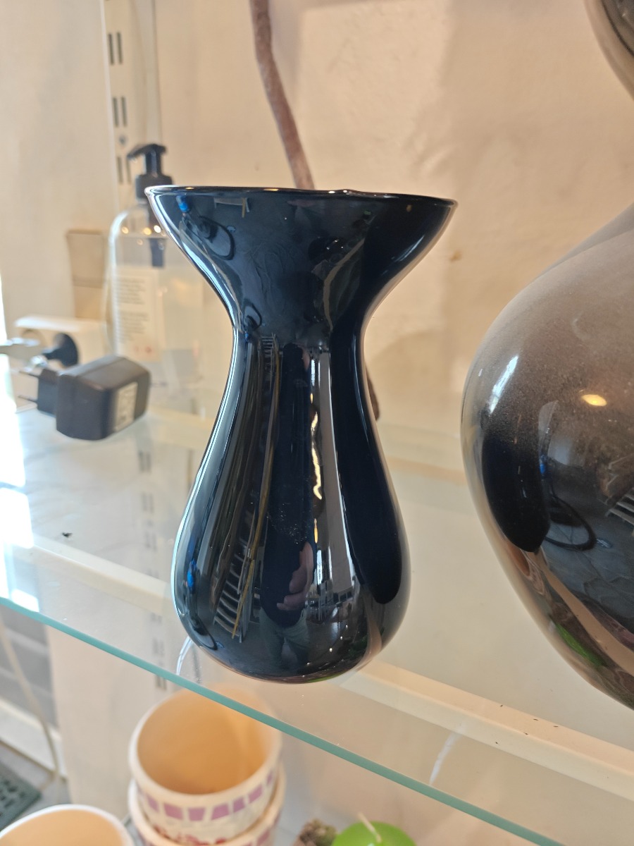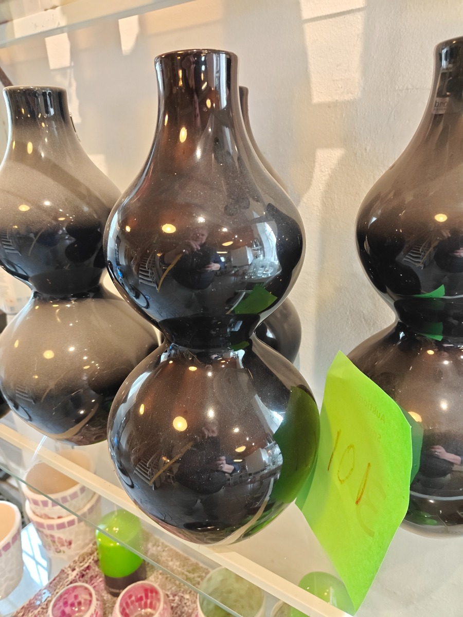 4 buttede vaser af keramik, med sort glasur. H. 34 cm. Varen stammer fra en nedlagt brugskunst-butik. Eventuelle brugsspor kan forekomme.