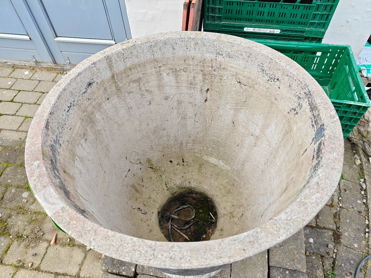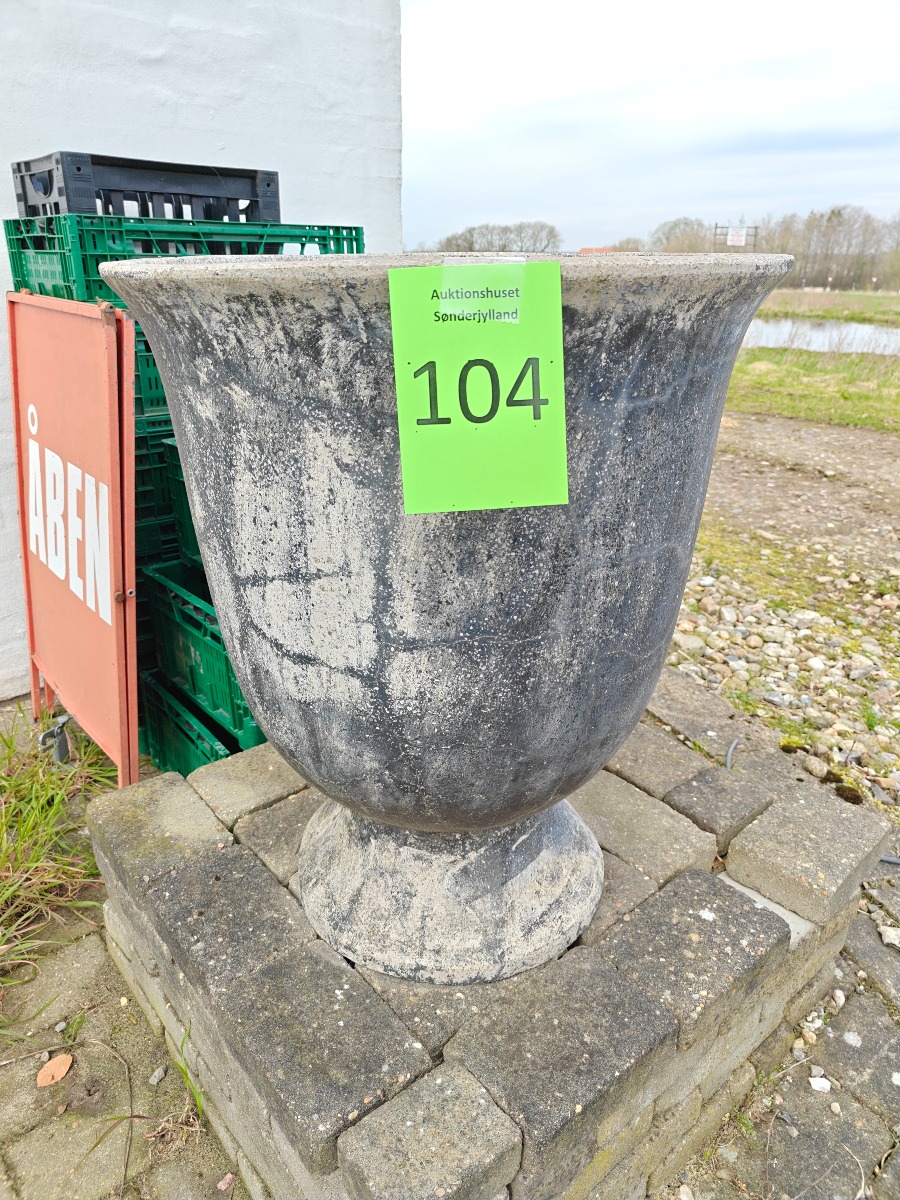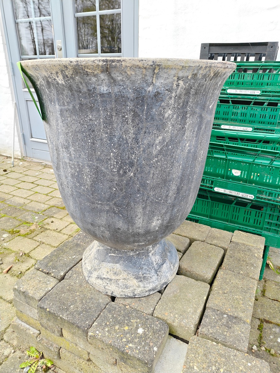 Stor pokalformet krukke af fiberbeton.  H. 72 cm. Varen stammer fra en nedlagt brugskunst-butik. Eventuelle brugsspor kan forekomme.