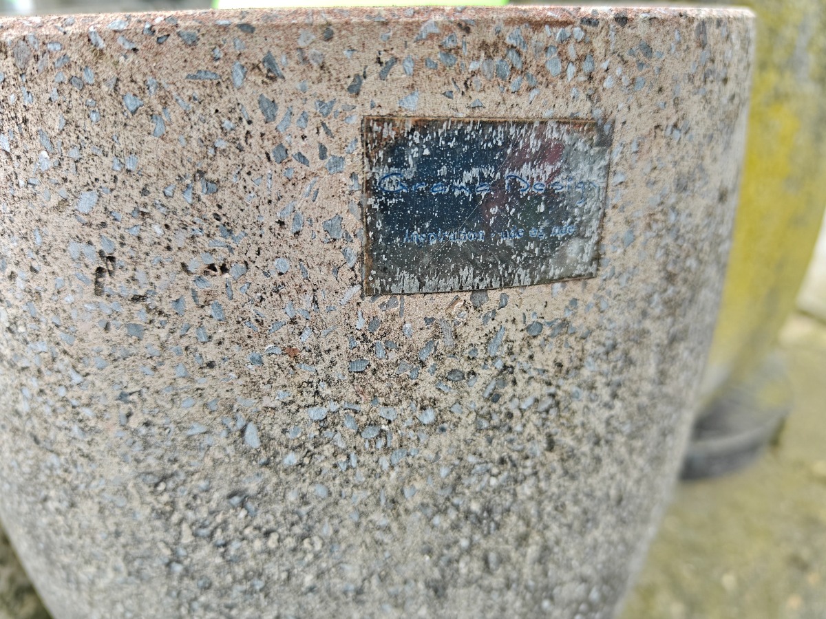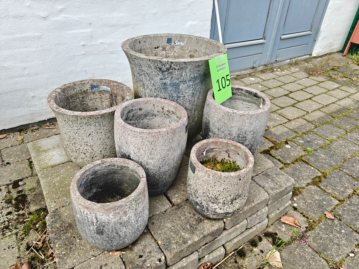 Forskellige krukker i fiberbeton. H. største 39 cm. Ø. 37 cm. Varen stammer fra en nedlagt brugskunst-butik. Eventuelle brugsspor kan forekomme.