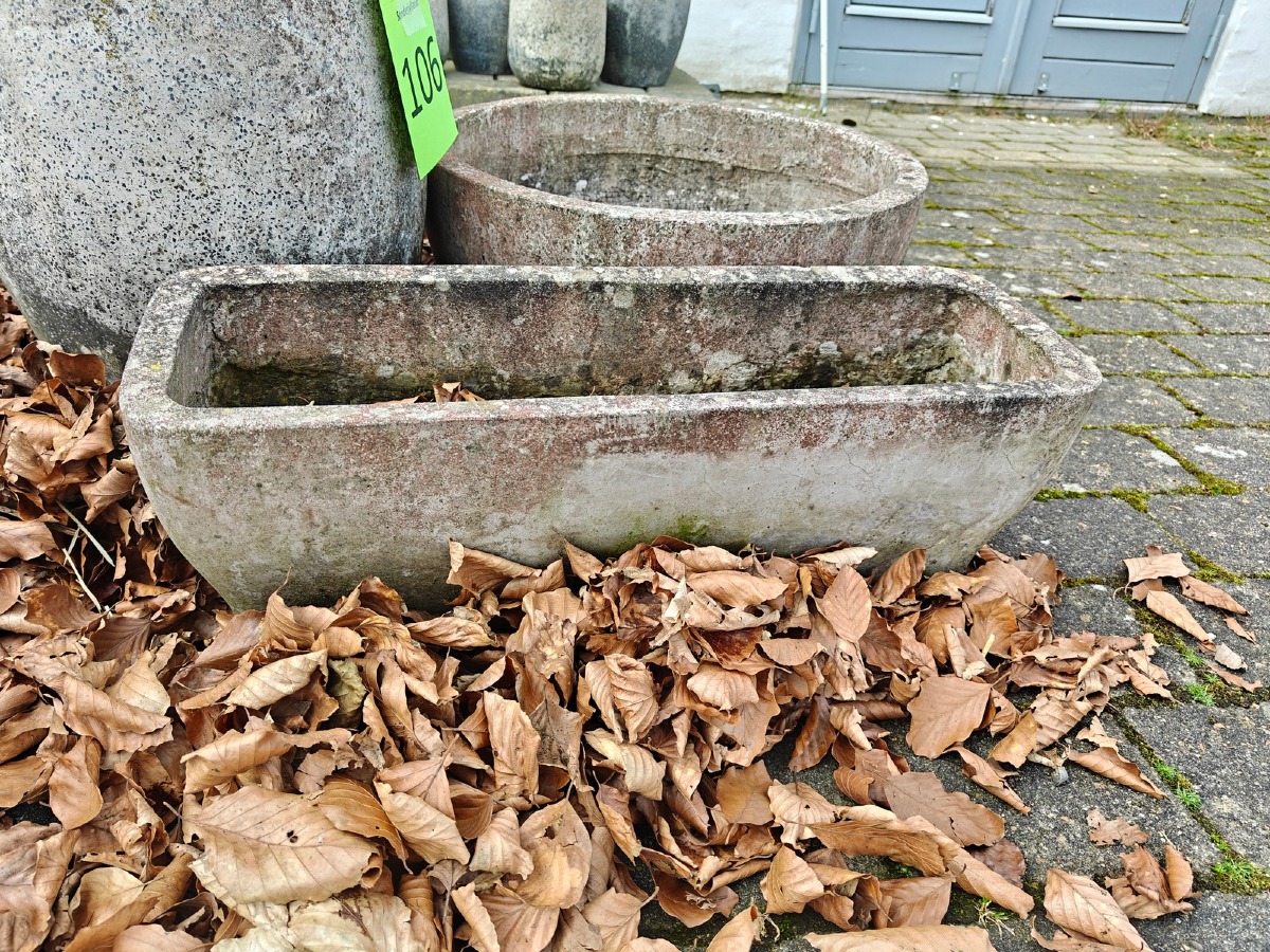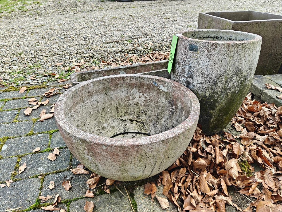 3 krukker i fiberbeton. H. 45 cm. for største. Varen stammer fra en nedlagt brugskunst-butik. Eventuelle brugsspor kan forekomme.