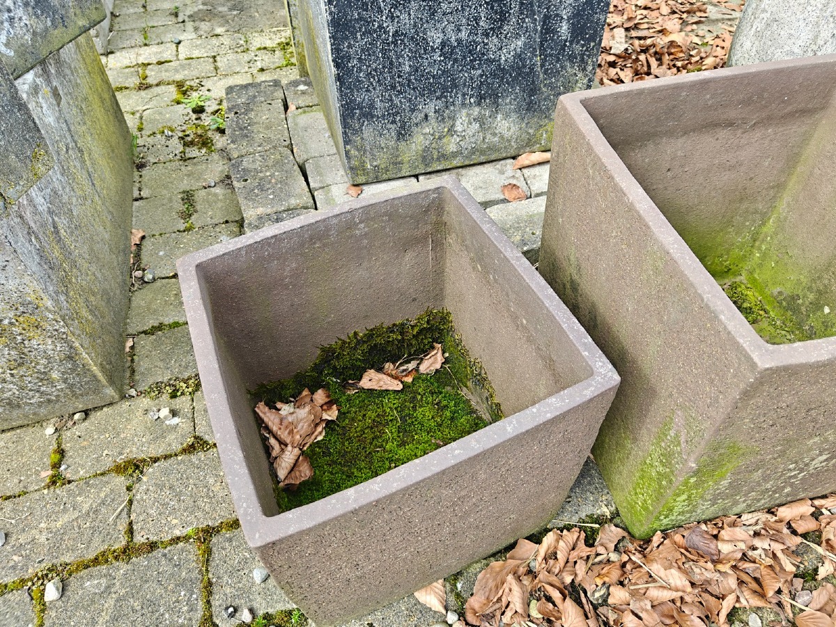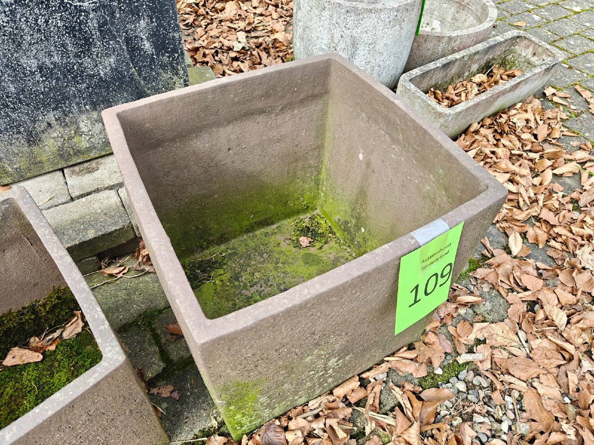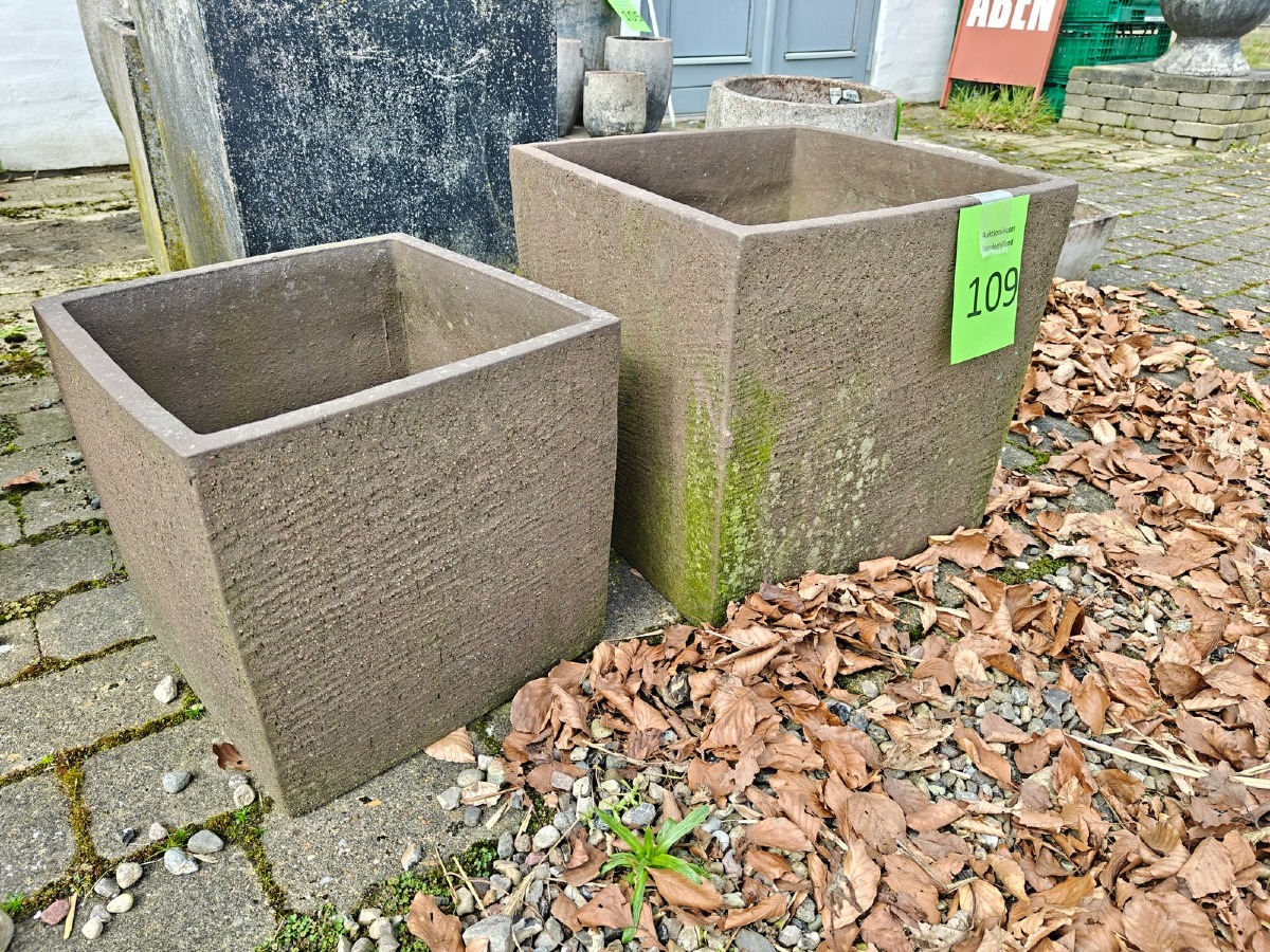 2 kvadratiske krukker af fiberbeton. 2 størrelser. Største:  43 cm. Varen stammer fra en nedlagt brugskunst-butik. Eventuelle brugsspor kan forekomme.