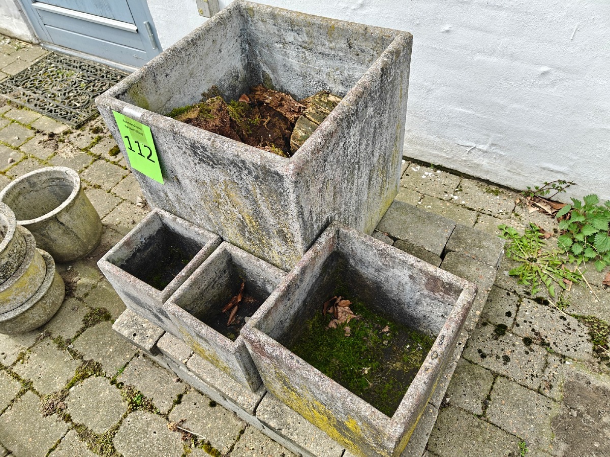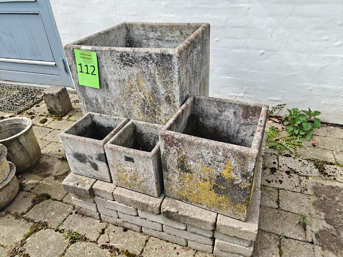 4 kvadratiske krukkeraf fiberbeton. Største 50 cm. Varen stammer fra en nedlagt brugskunst-butik. Eventuelle brugsspor kan forekomme.