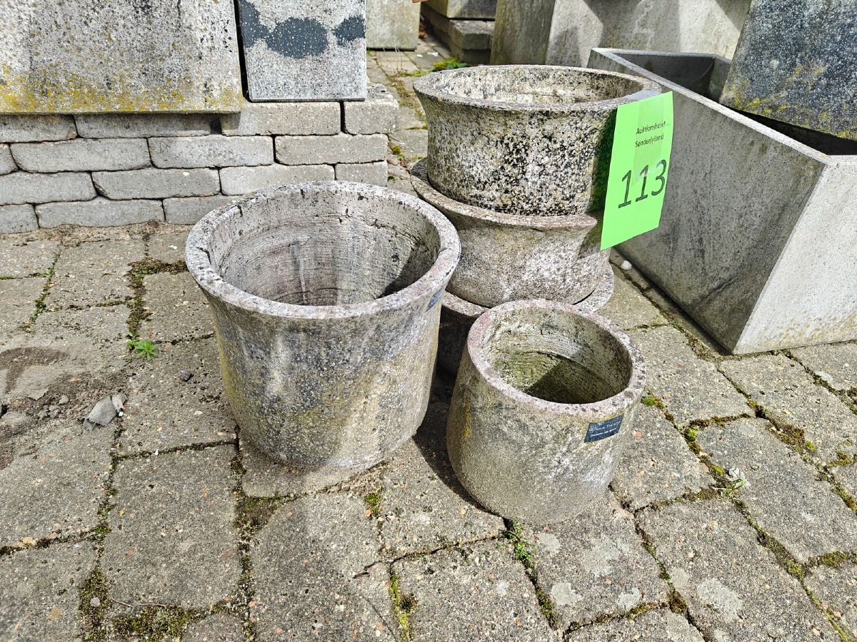 4 mindre krukker af fiberbeton. H. for største 27 cm. Varen stammer fra en nedlagt brugskunst-butik. Eventuelle brugsspor kan forekomme.