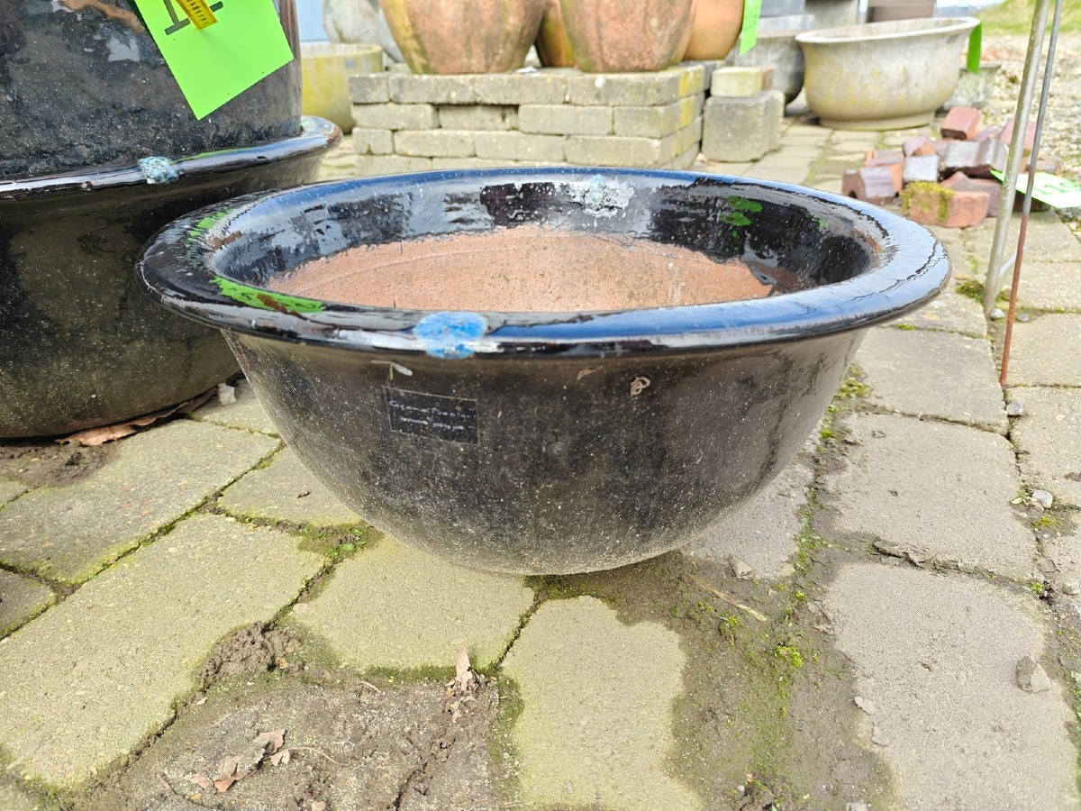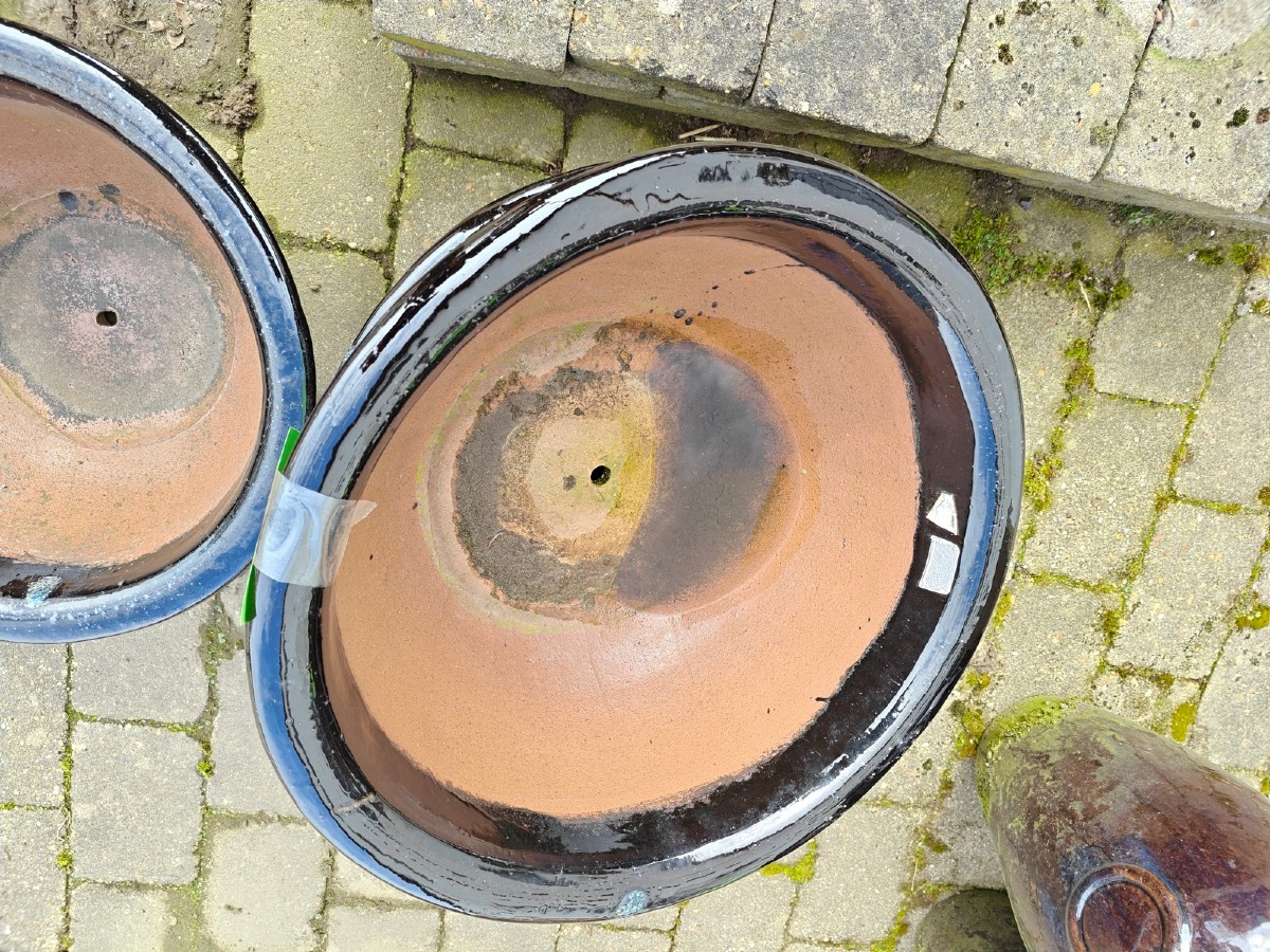 3 fade med blå/sort glasur. Ø. 53 cm. Varen stammer fra en nedlagt brugskunst-butik. Eventuelle brugsspor kan forekomme.