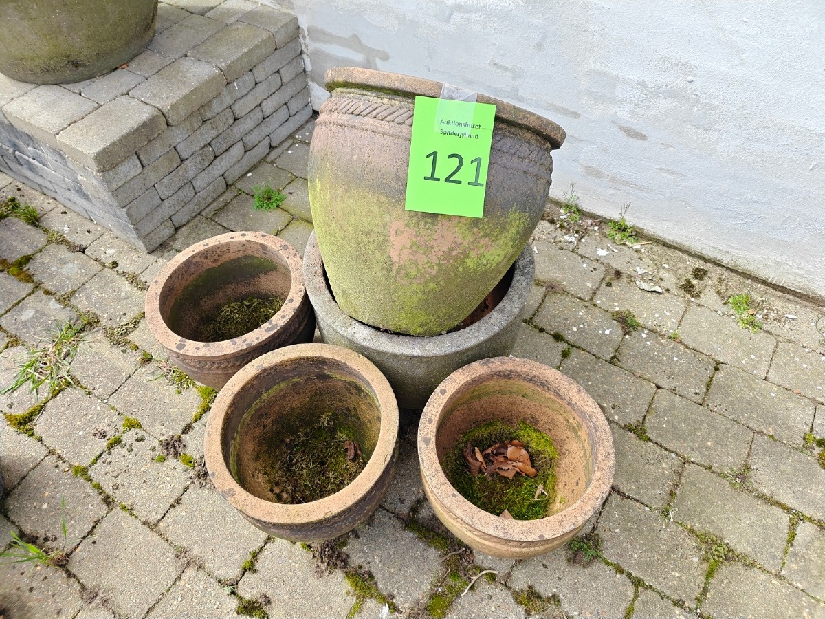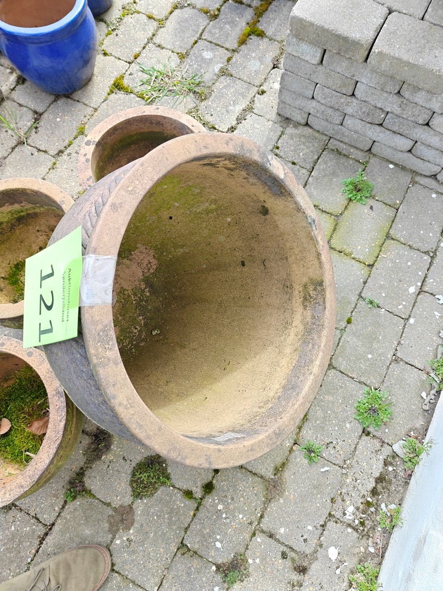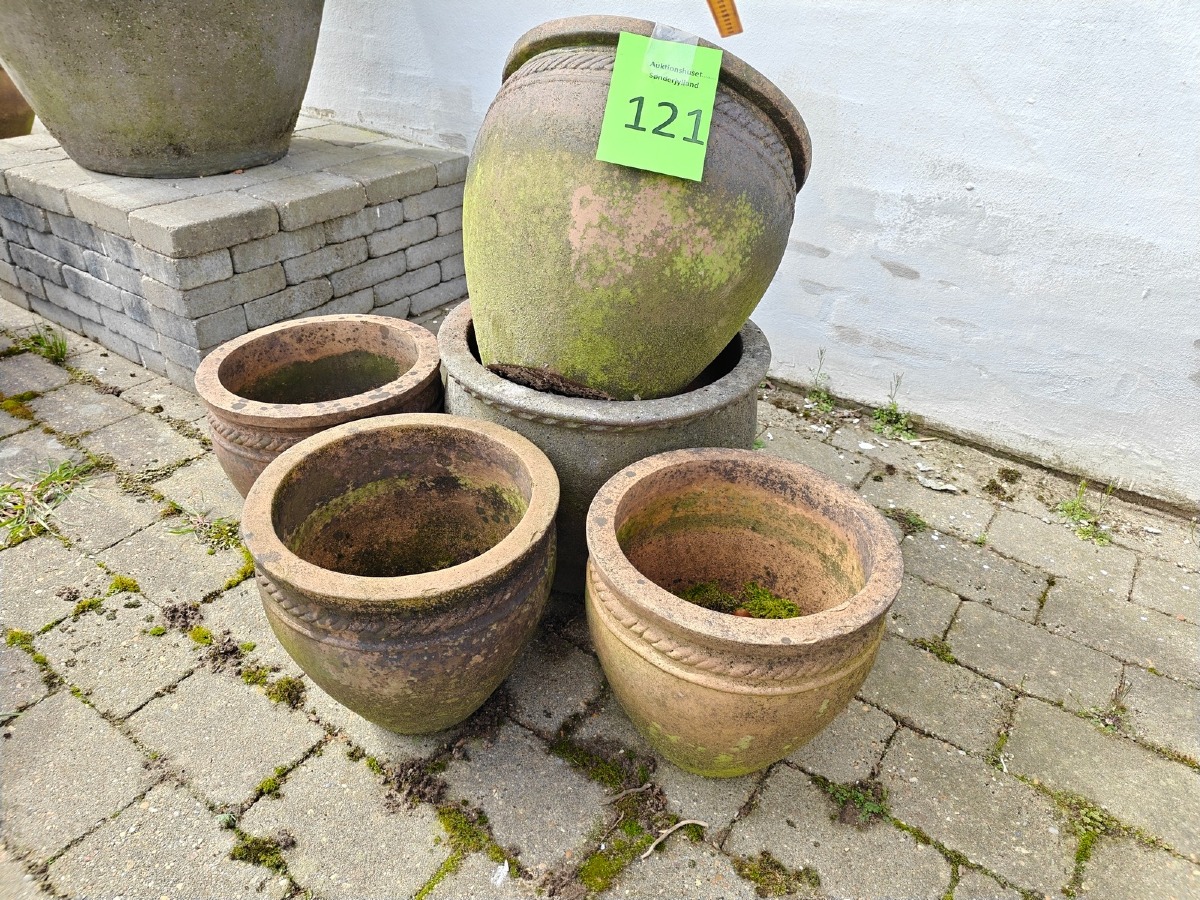 5 terracottakrukker med dekoration i form af snoet bånd. Største:  33 x 40 cm. Varen stammer fra en nedlagt brugskunst-butik. Eventuelle brugsspor kan forekomme.