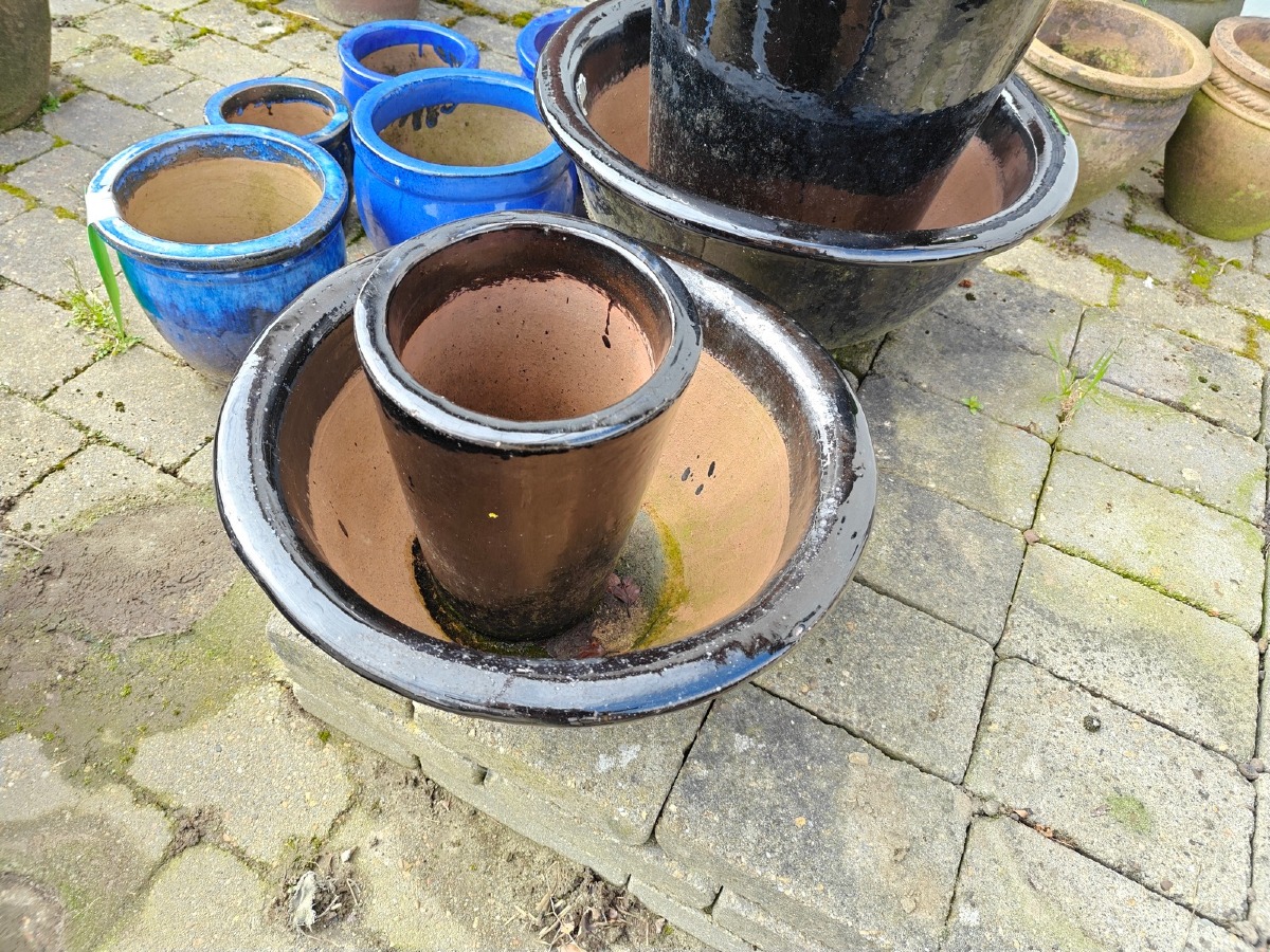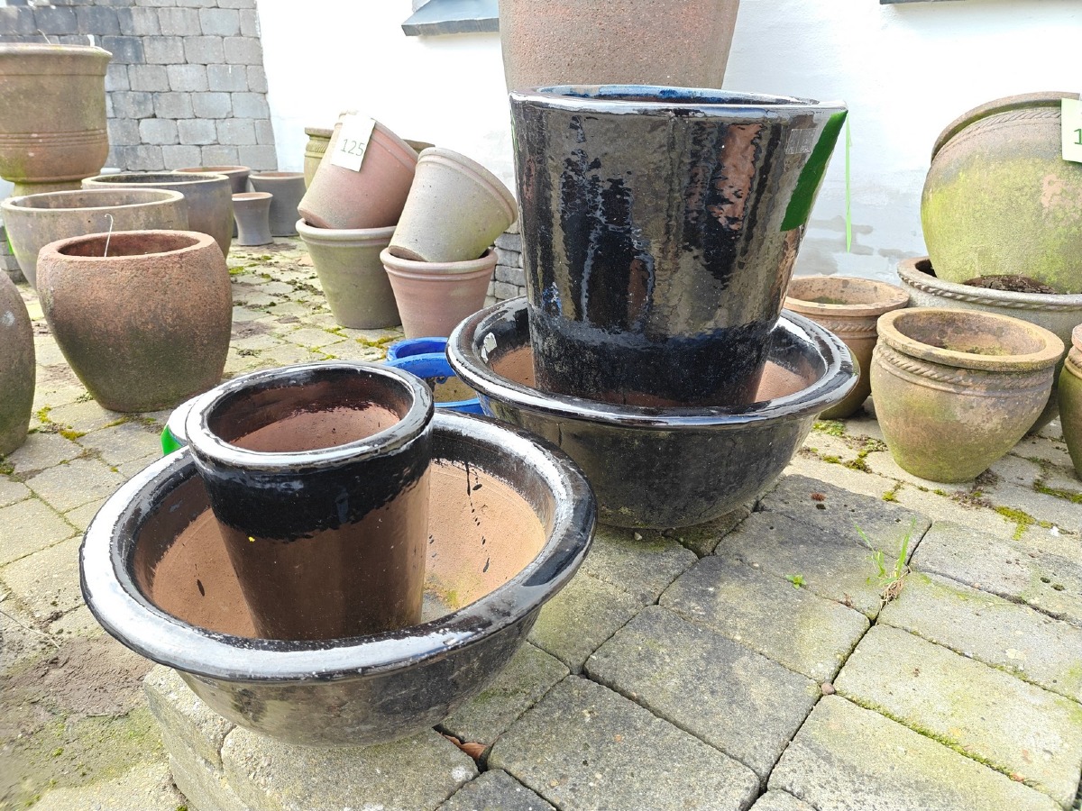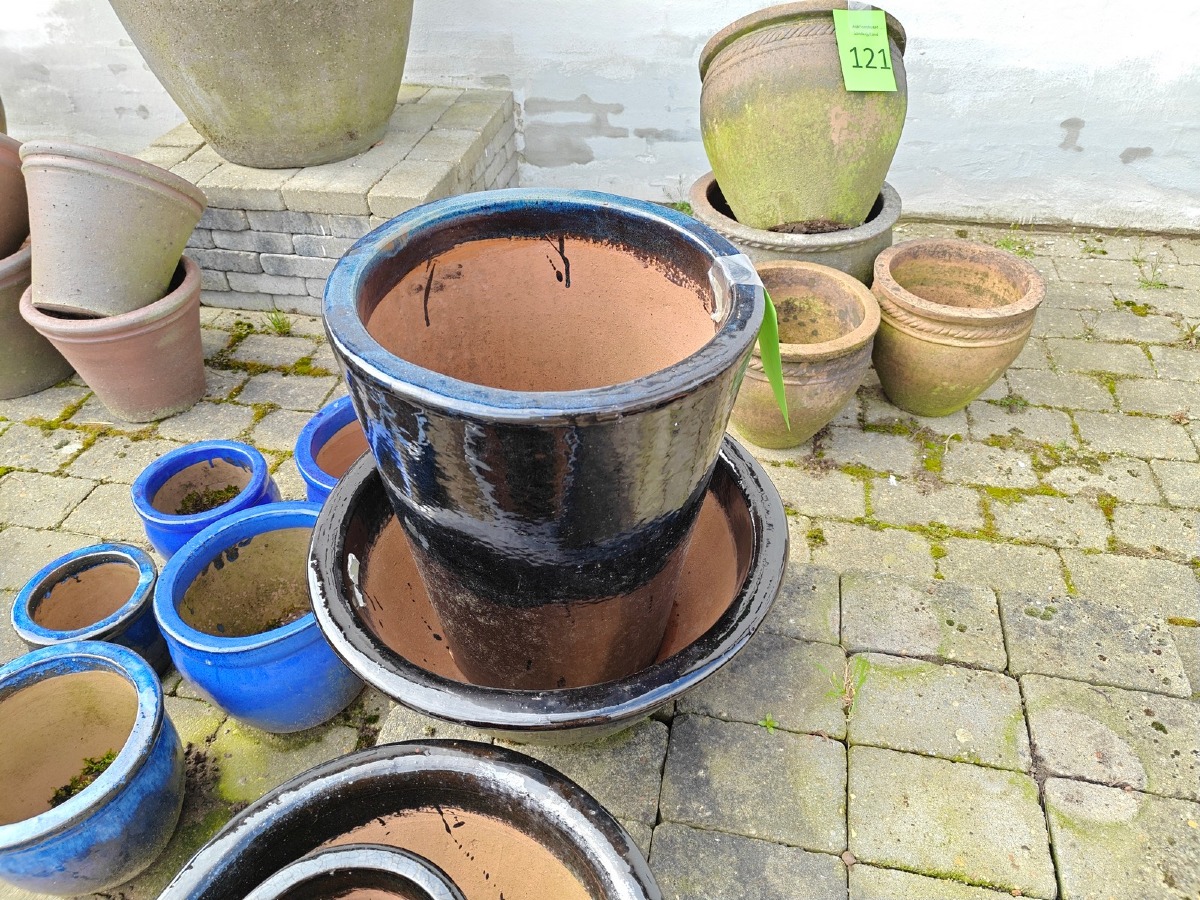 Krukker med sort/blå glasur. Største 50 x 38 cm. Varen stammer fra en nedlagt brugskunst-butik. Eventuelle brugsspor kan forekomme.